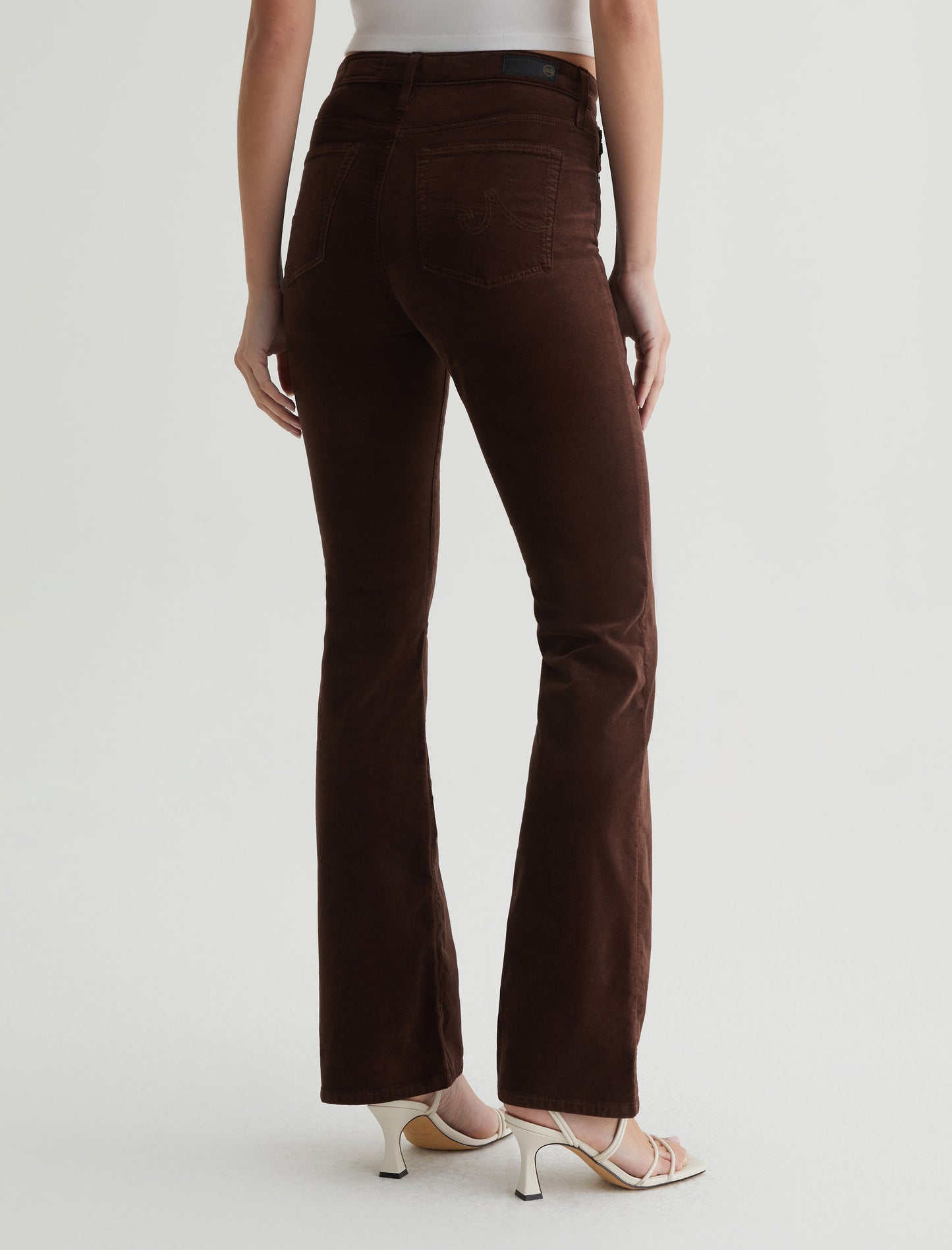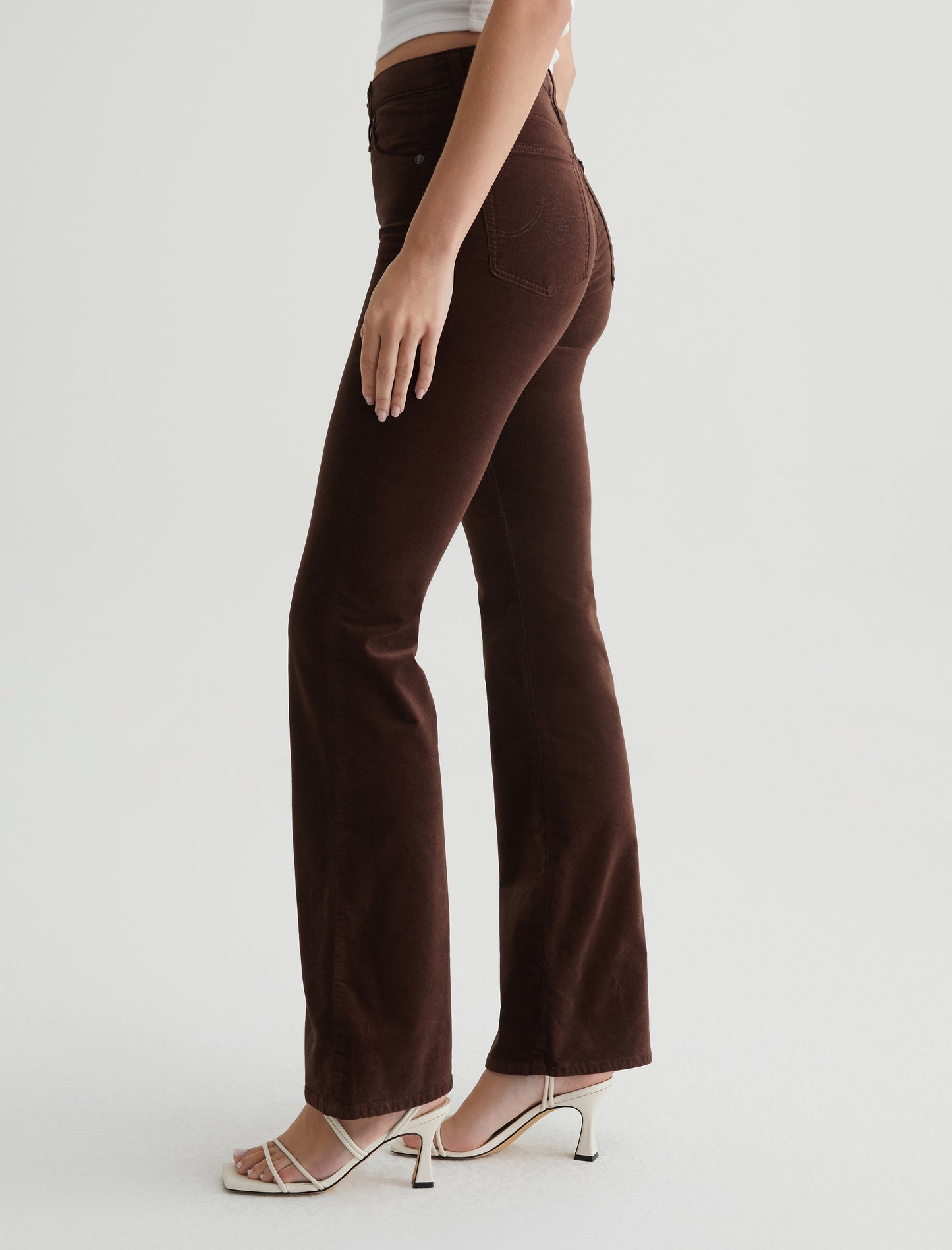 Opulent Stretch Velvet in classic. The pair sits high on the waist and has a skinny fit through the leg before opening into a subtly flared hem.