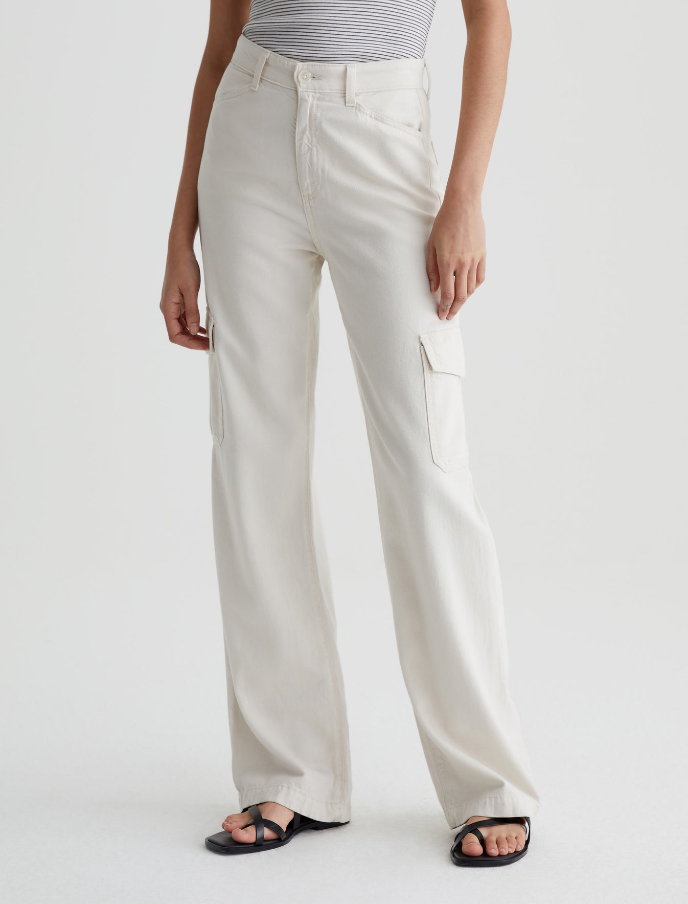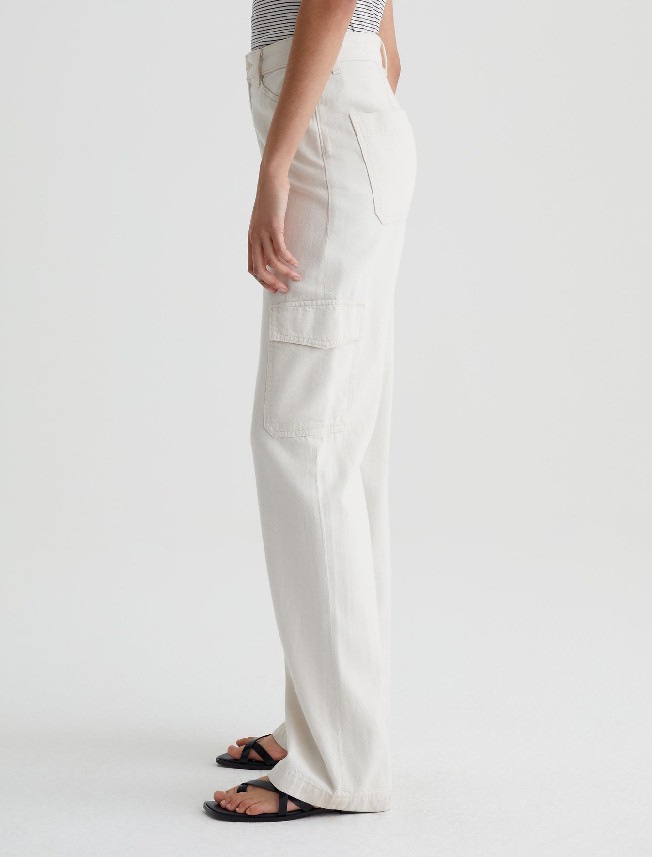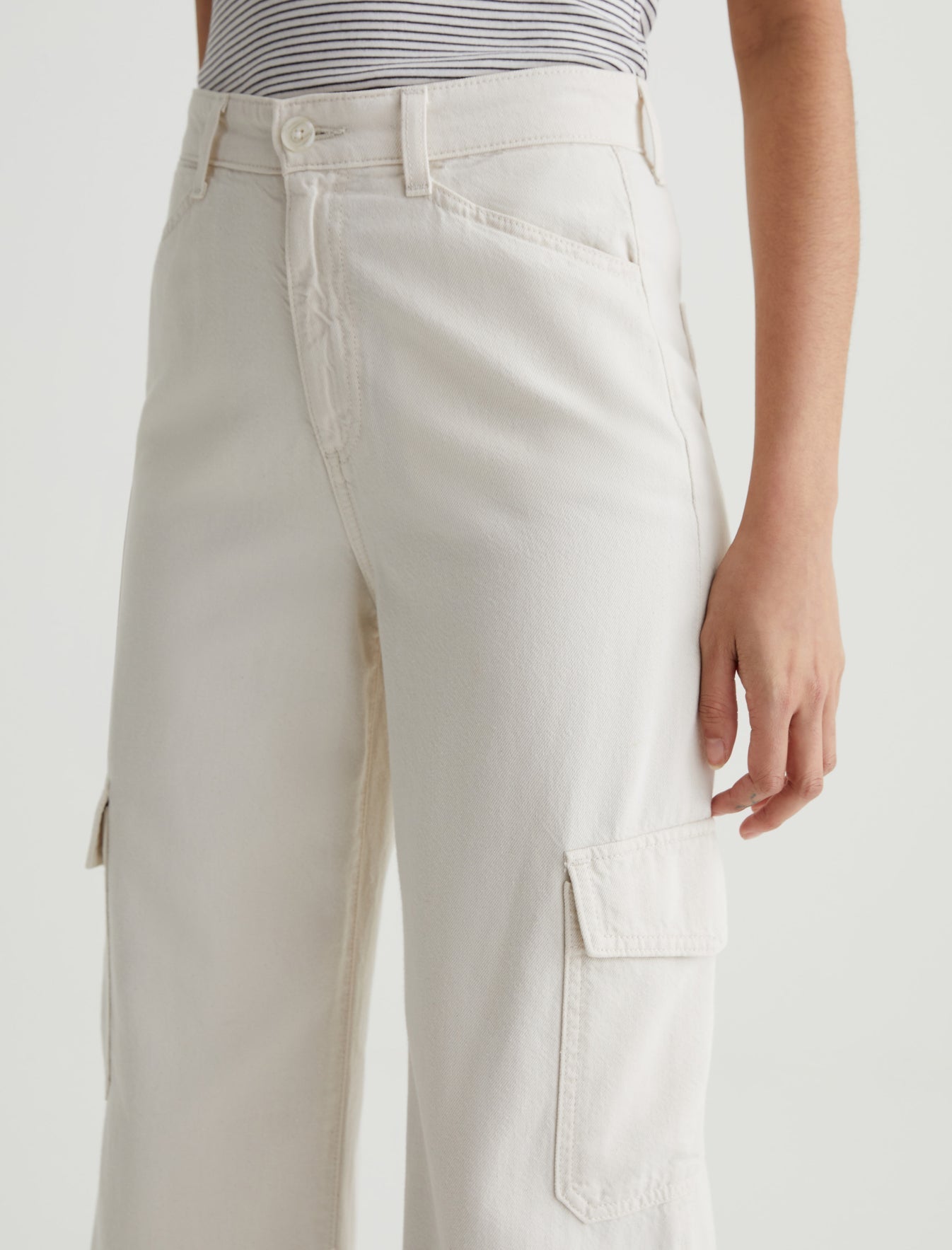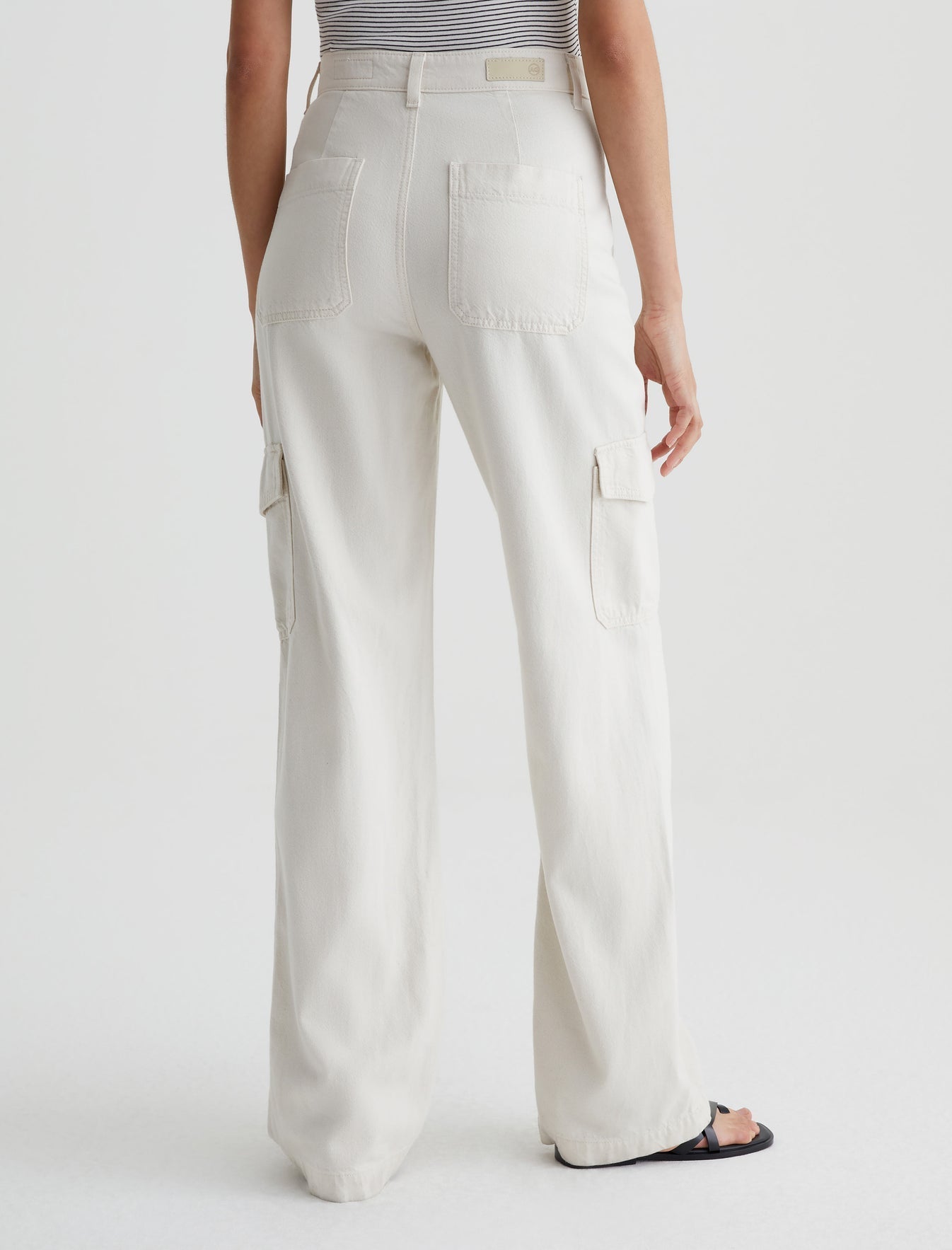 The Gatina wide-leg cargo pants in off-white are a utilitarian-inspired style made from 9.25 oz. Hazy Silk Denim, a soft and luxurious blend of silk, modal, and cotton. This pair features a high-rise waist and long, loose-fitting legs with flap pockets at the sides. Angled hip pockets at the front and squared-off patch pockets at the back.