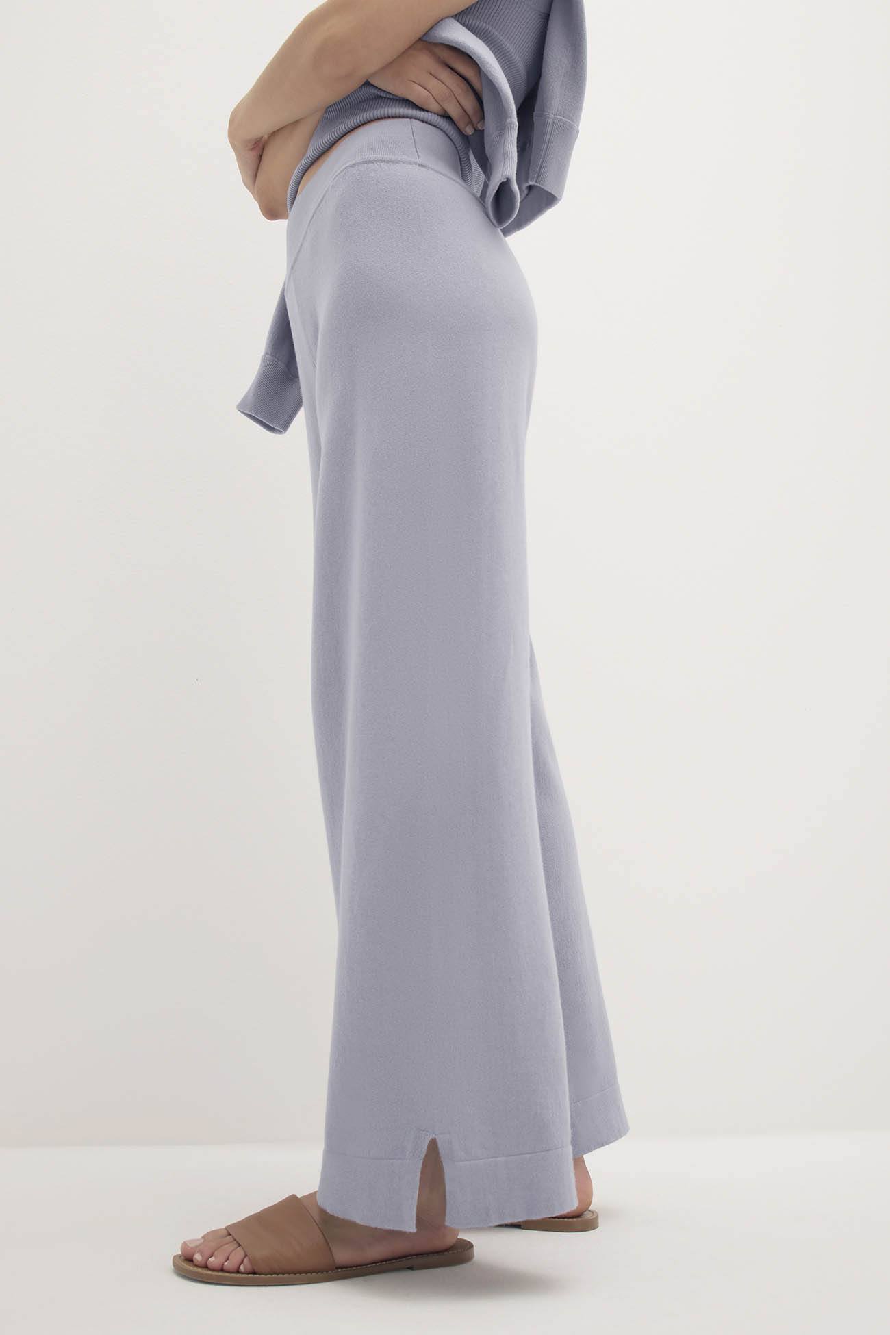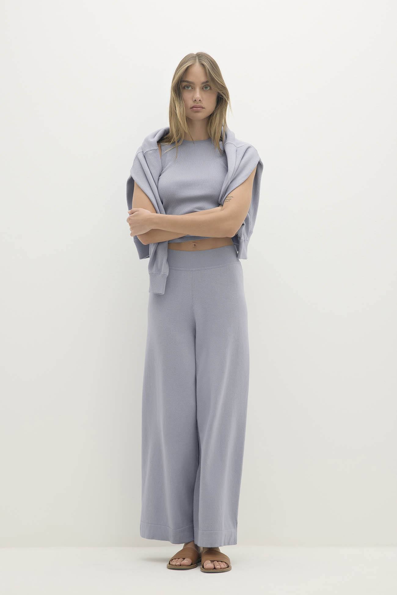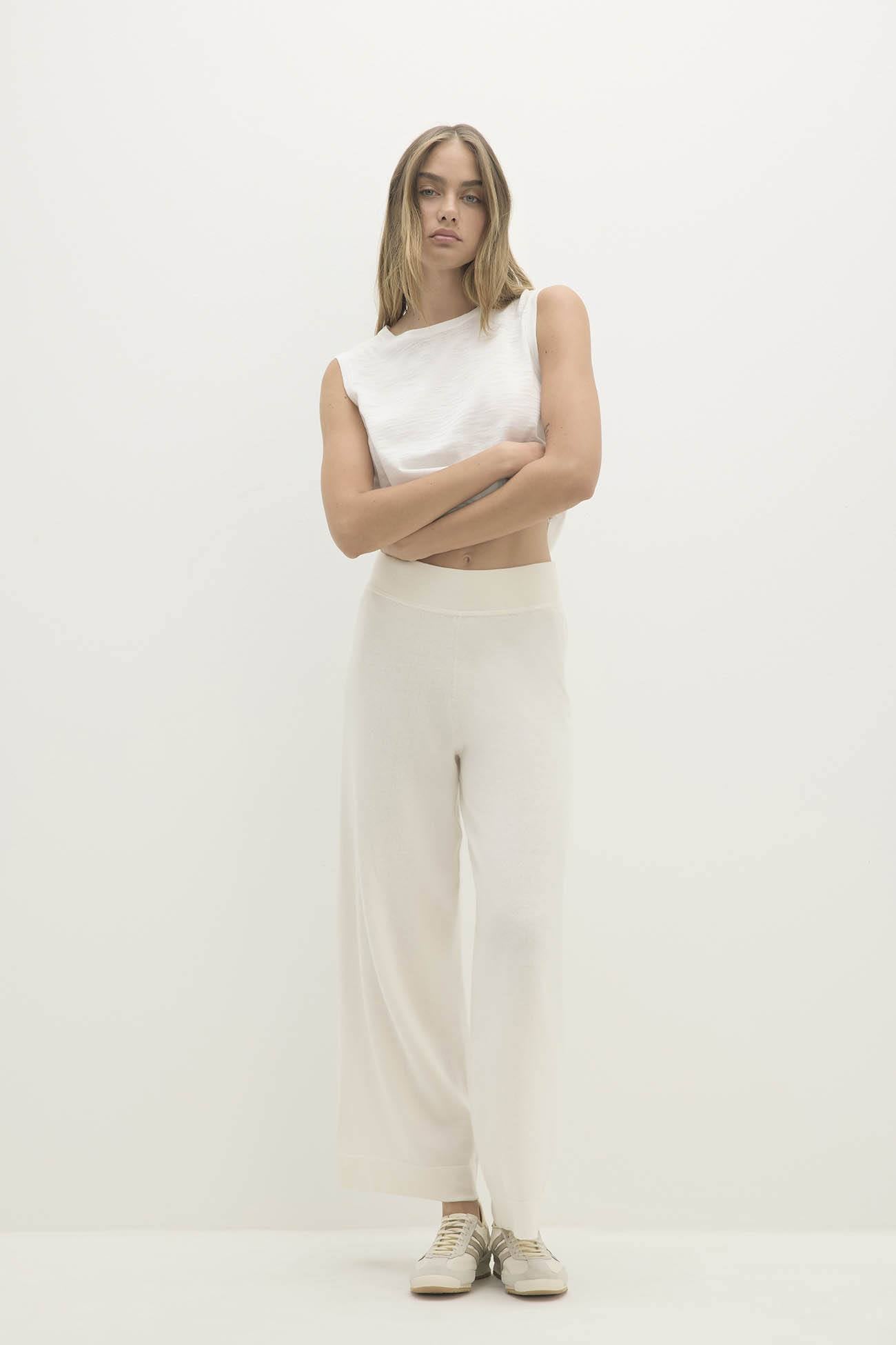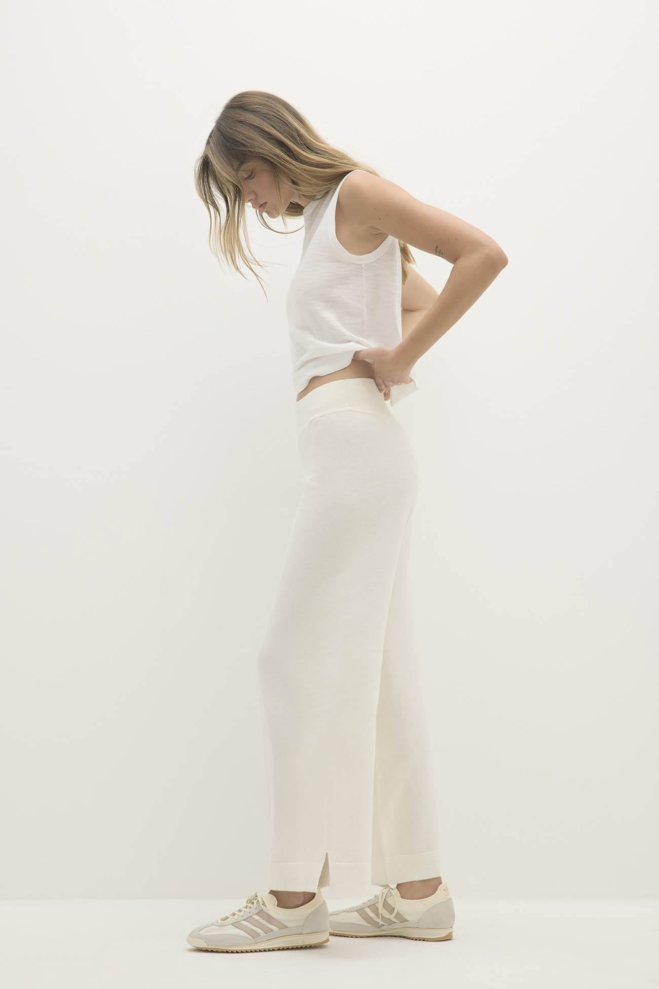 Chic wide-leg pants featuring a V-back seam detail, hem slits, and an elastic waistband for elevated athleisure style. Pair with the Bianka or Serena.