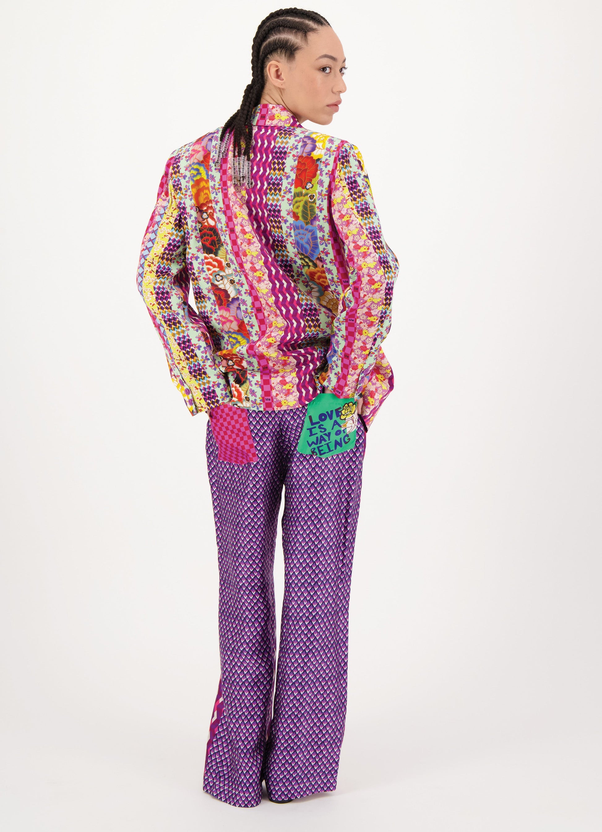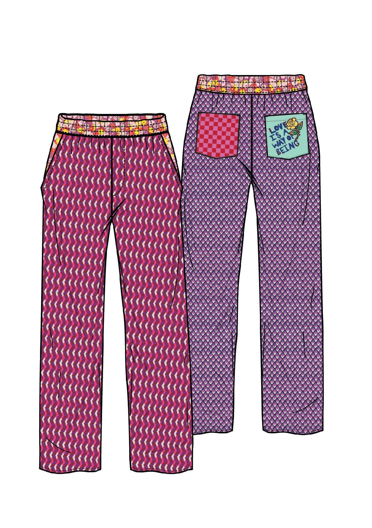 Straight leg track pants in a vibrant with two side pockets, two back pockets and a wide elasticized waistband. Back pockets says, “LOVE IS A WAY OF BEING” on the other. Pair with our matching top for a complete sporty look.