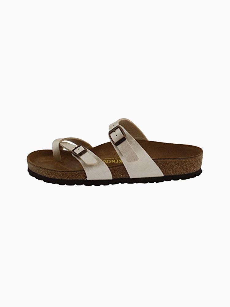 The Mayari from BIRKENSTOCK - a elegantly comfortable sandal with adjustable, crisscrossing straps that form a single loop around the toe. Classic support and adjustability, delivered beautifully. This version has been updated for Spring with colorful uppers in Graceful Birko-Flor - Birkenstock's easy-care synthetic material with a subtle irridescent finish. Bright white outsoles maximize the color pop with a clean contrast.