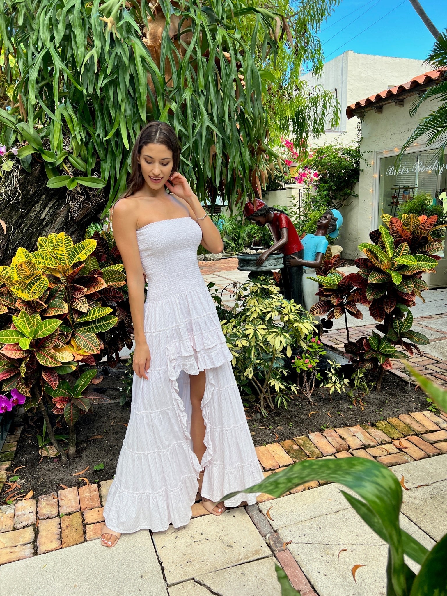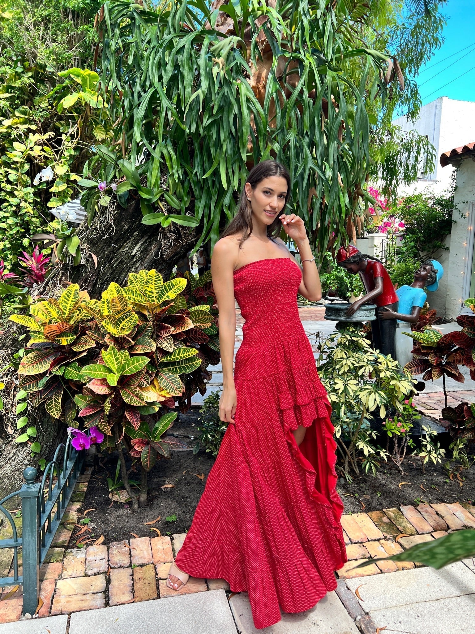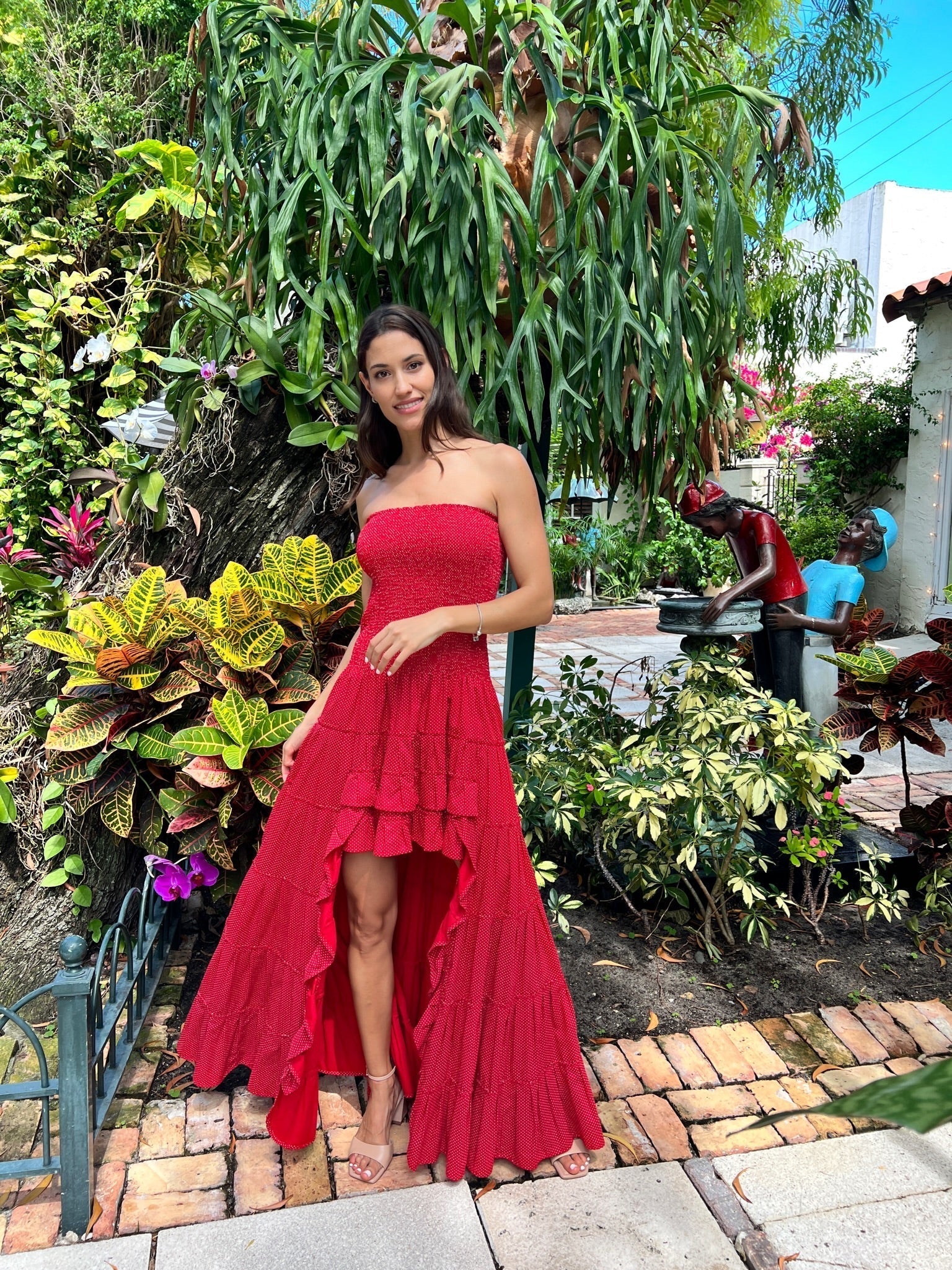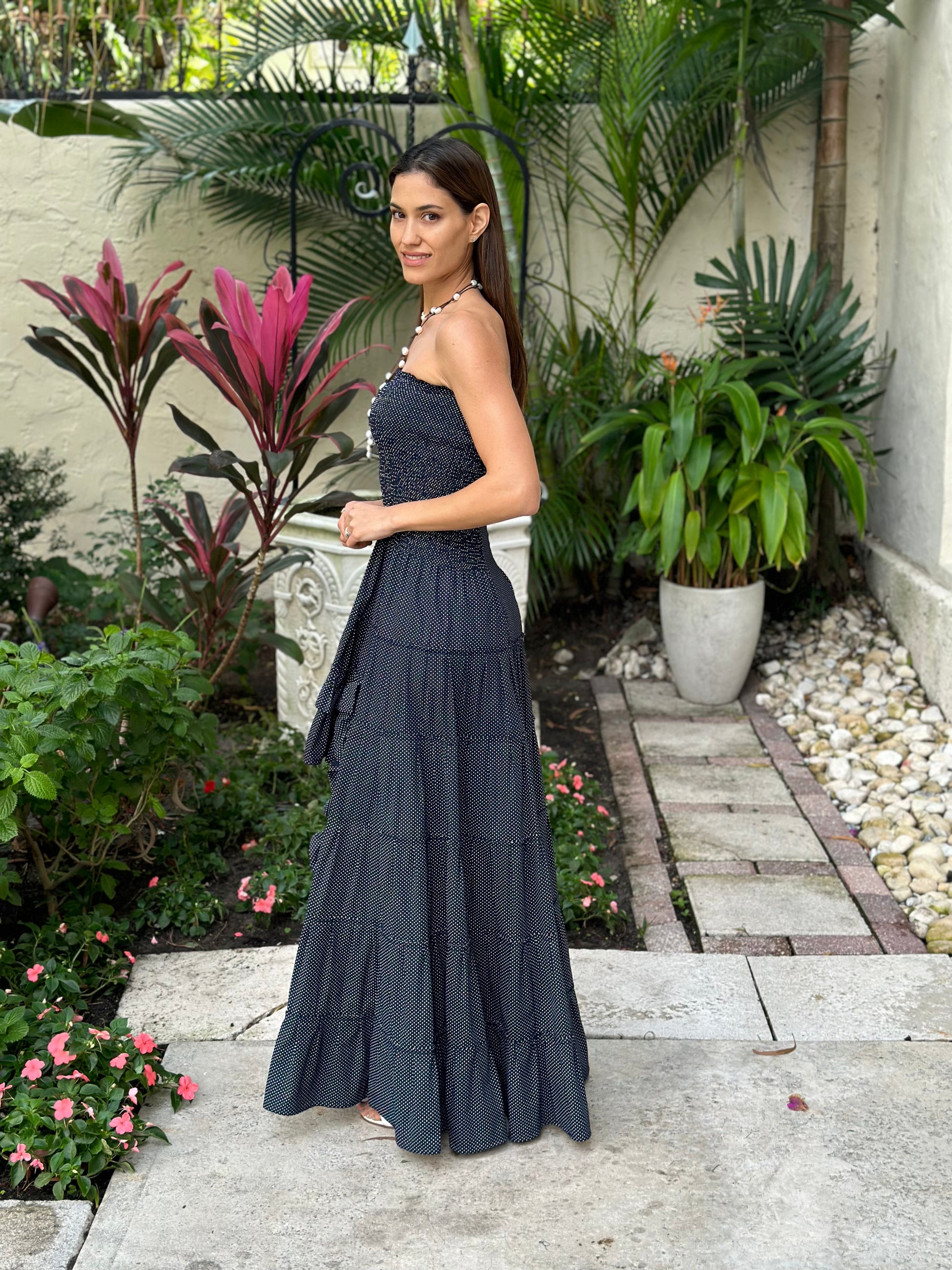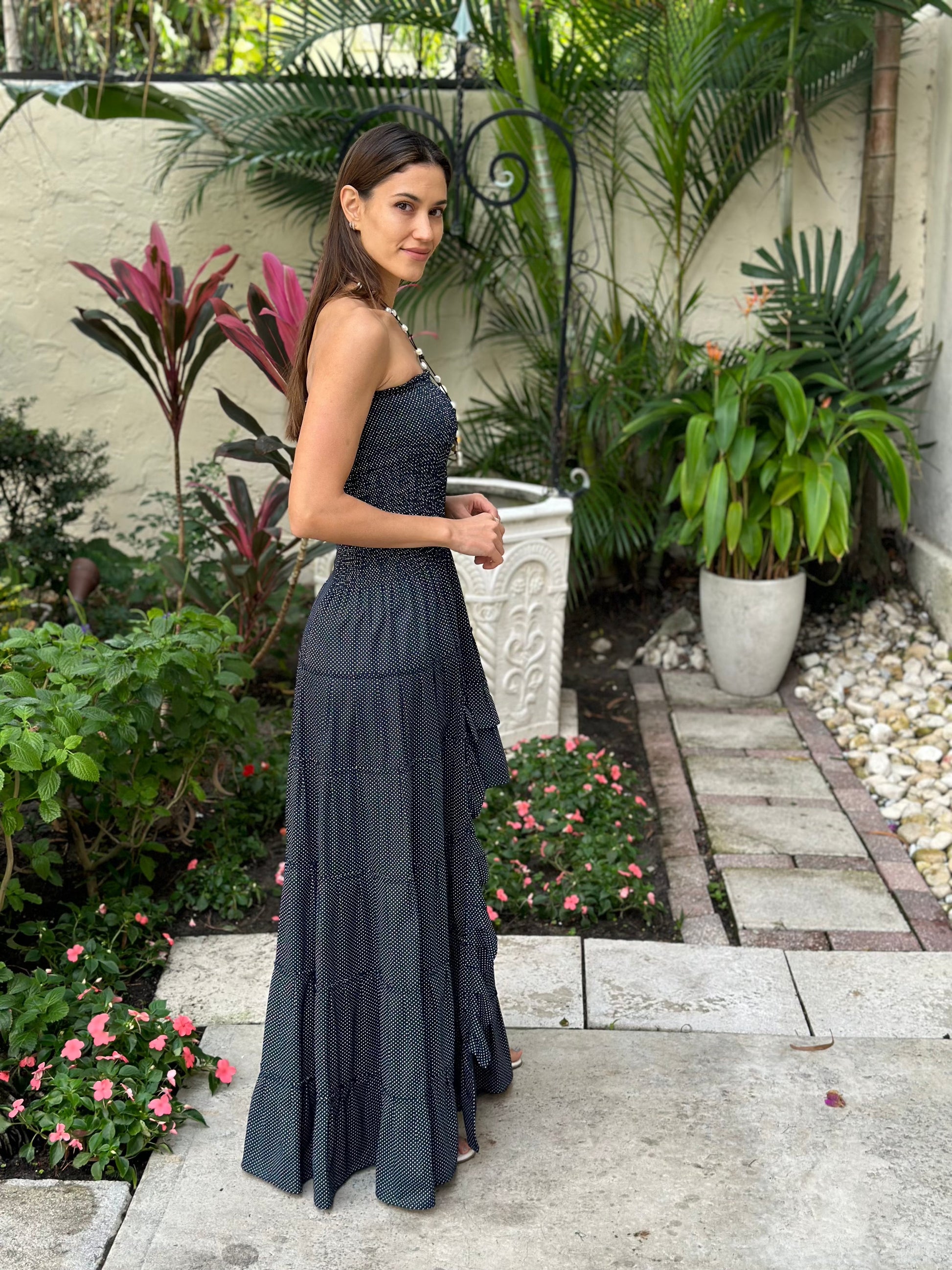 Our gorgeous polka dot Blanca dress, will direct all eyes to you! Make an impression in this flirty and fashionable high-low hem that highlights your legs. The bodice is strapless designed with an elastic waist, the skirt is finished with festive ruffles.