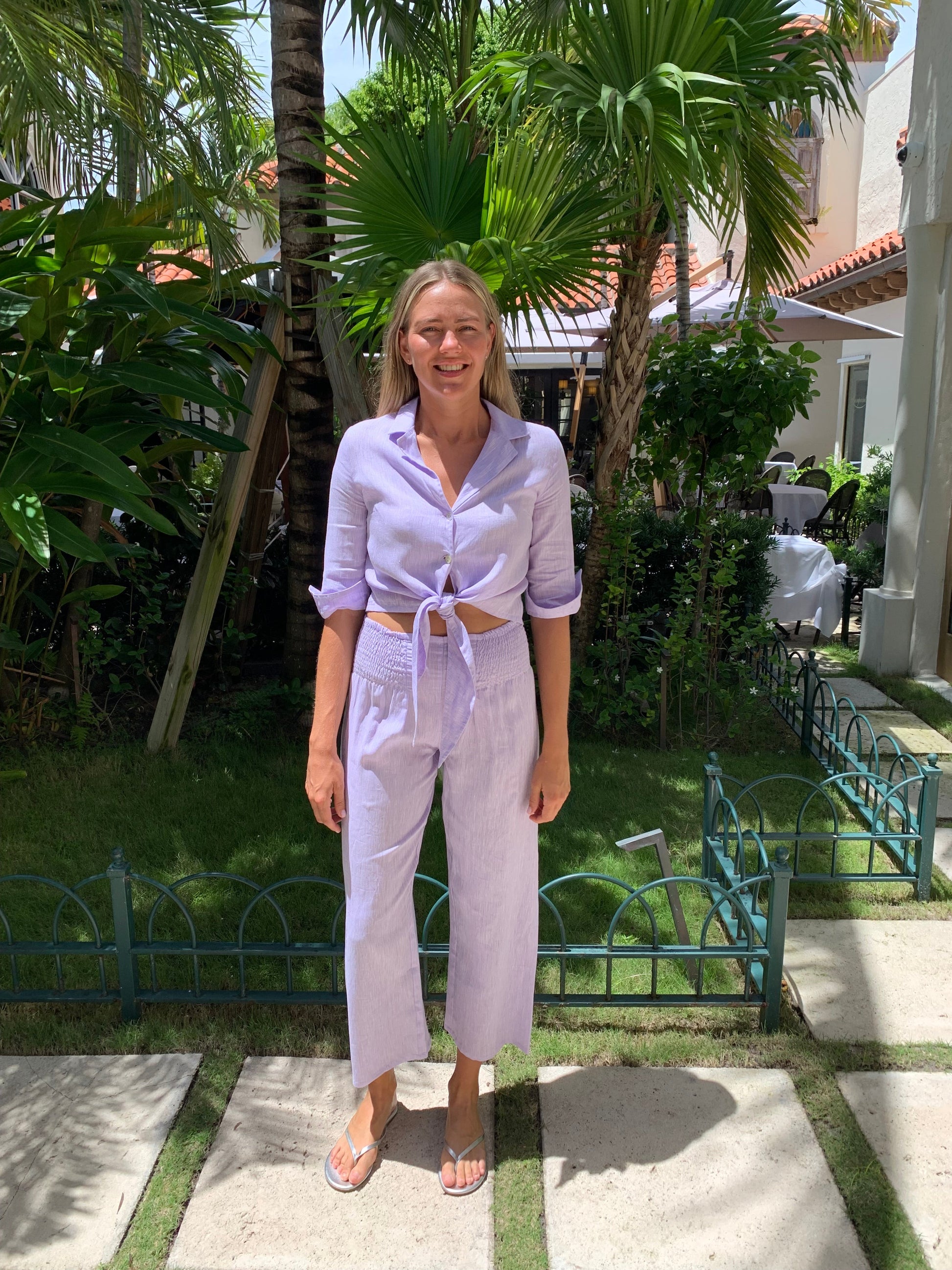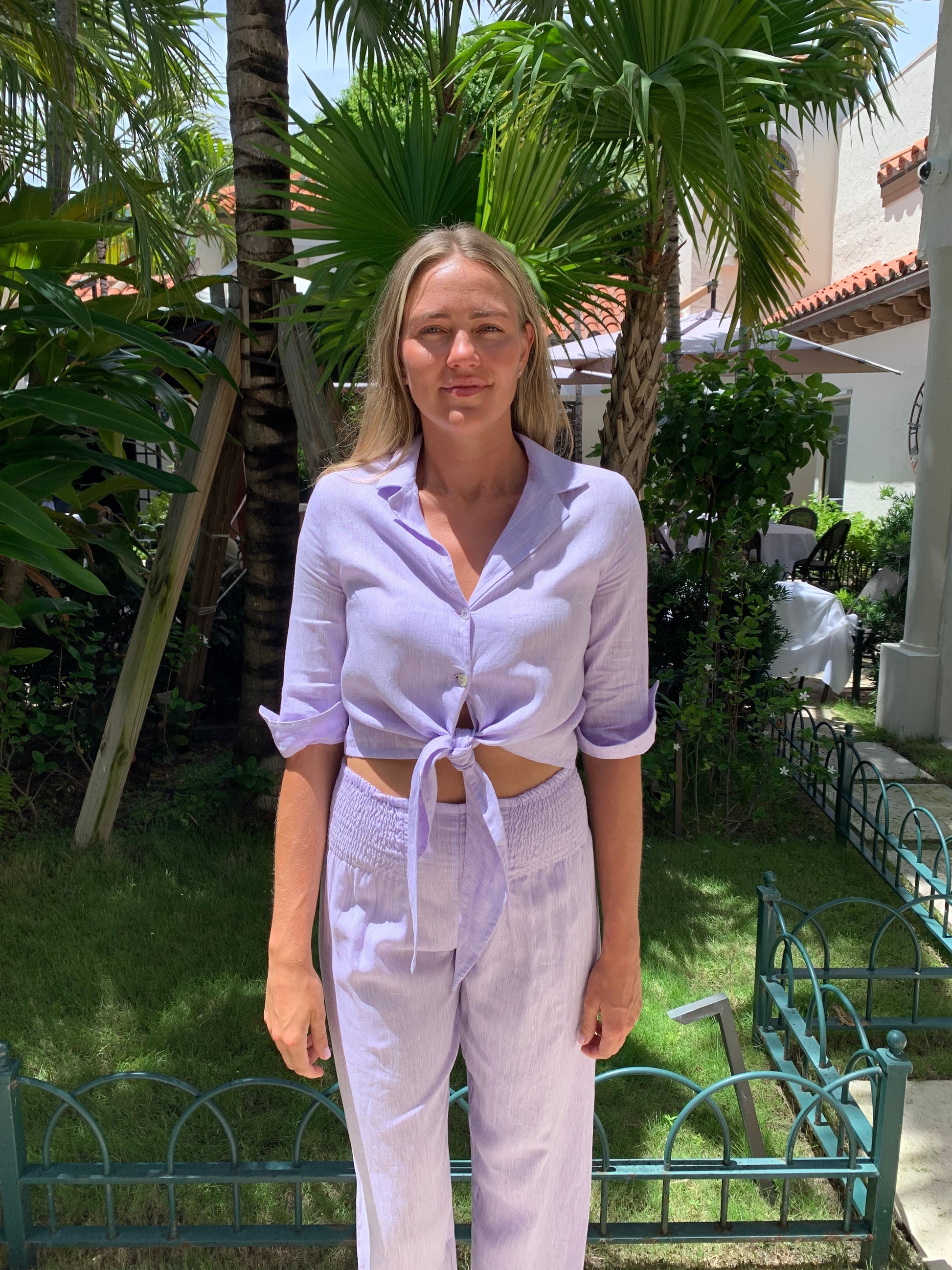 Our blazer nodo centrale is a long sleeve linen crop top. It has two buttons and is tied in the front. It's designed to style any of our pants and gonna corta or gonna Marina skirts.