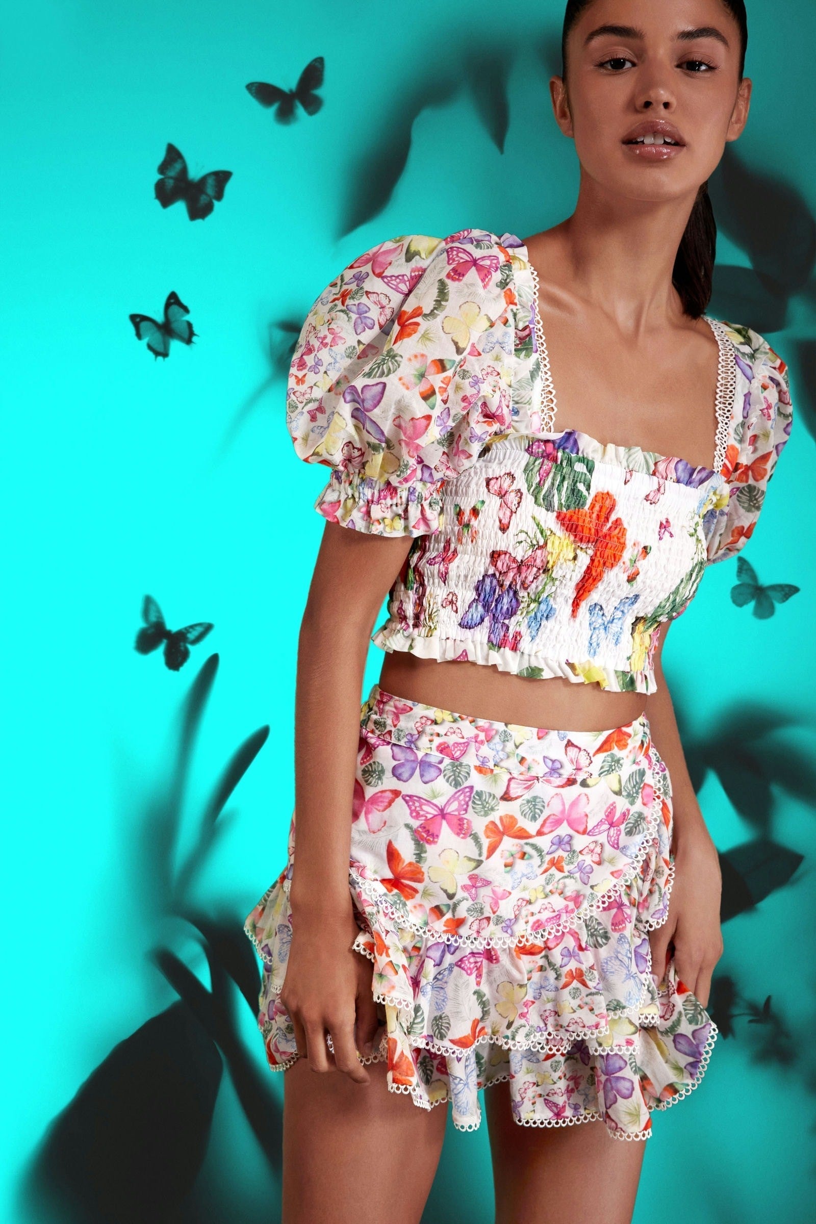 The Lirio top fits and flatters your figure thanks to its smocked body and square neckline adorned with geometric guipures. Its puffed sleeves complete the feminine silhouette of the piece printed with hand-painted spring motifs on cotton.