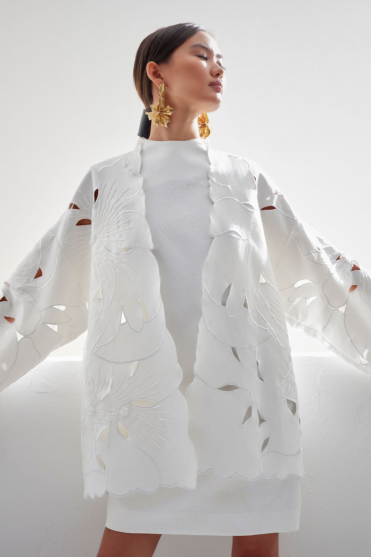 A timeless piece to treasure, adorned with allover floral cut-out embellishments that captivate with every detail.Length 30" Open jacket Allover floral cut out embellishment Long sleeve Hemline follows embroidery 100% breathable cotton Embroidery time: 7 hours, 30 minutes 94% cotton 6% nylon Dry clean Made at our own factories in the Philippines