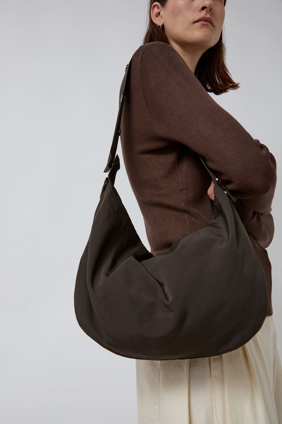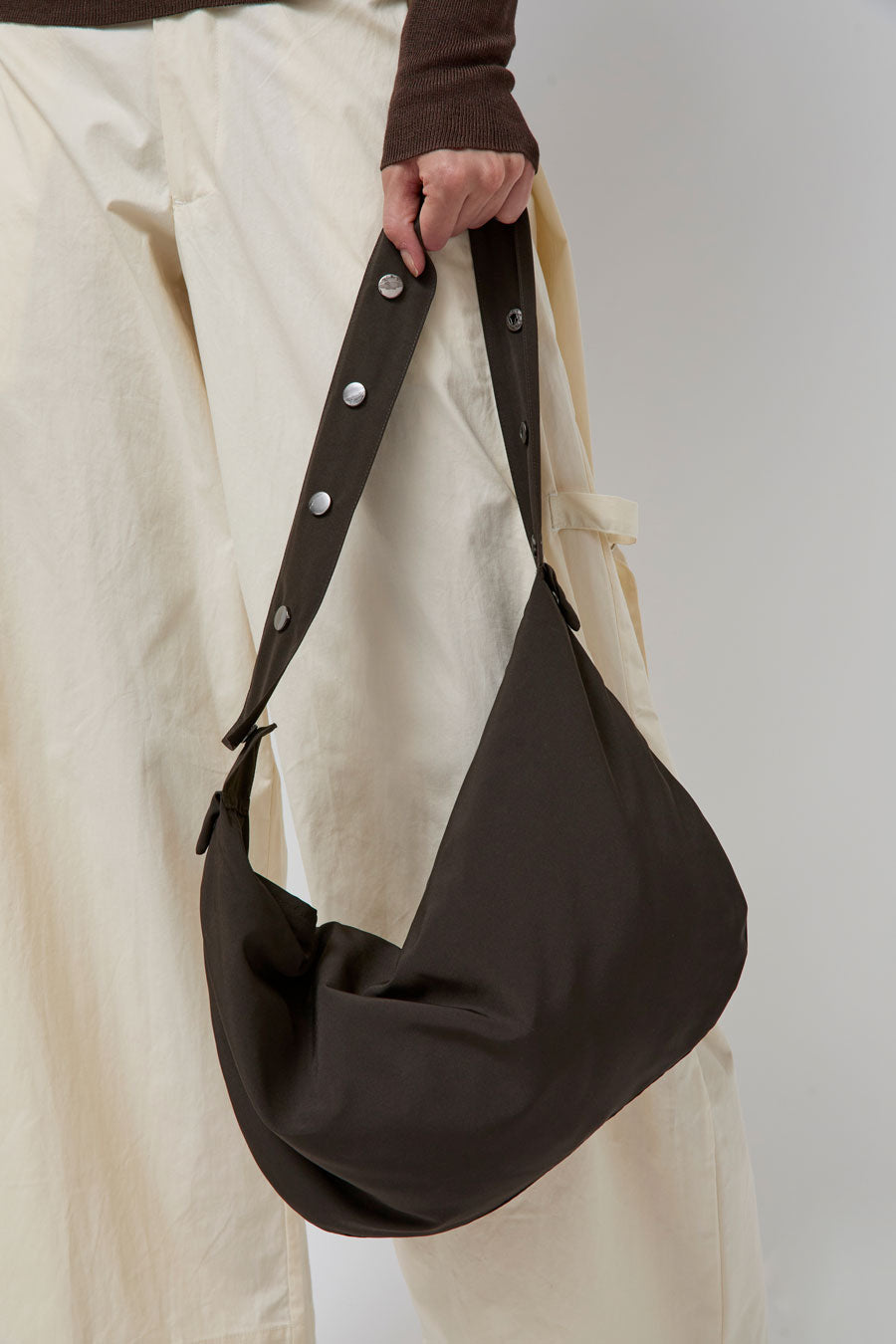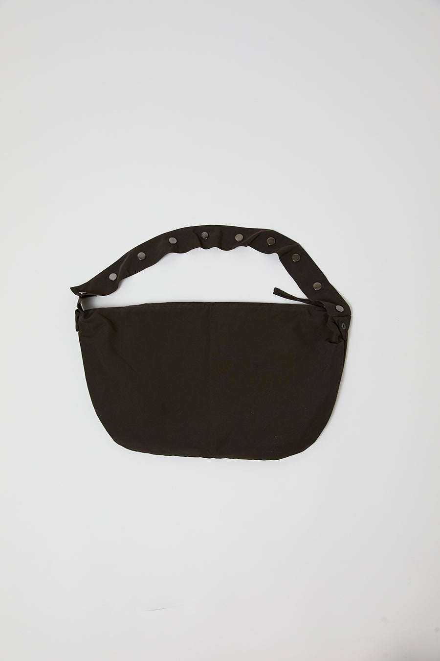 Refined everyday bag with a sculptural curved shape. Features press stud detailing, self-fabric zip closure, and internal lining. Versatile in function, can be worn as a belt, crossbody, or carry bag.