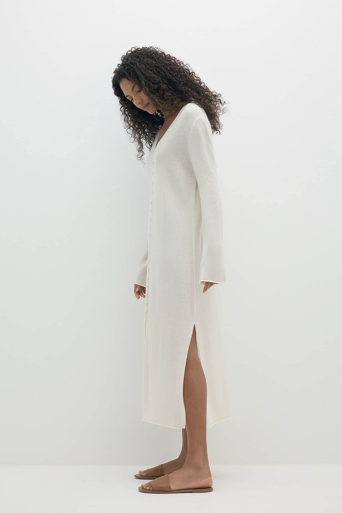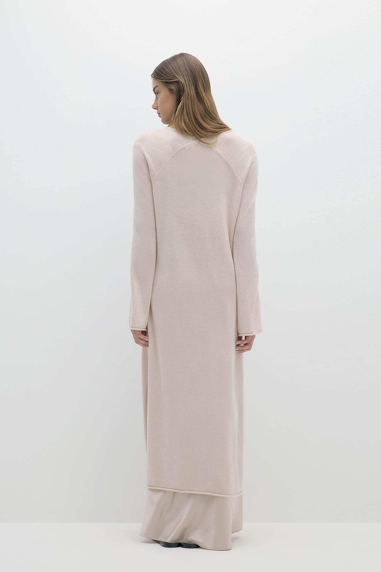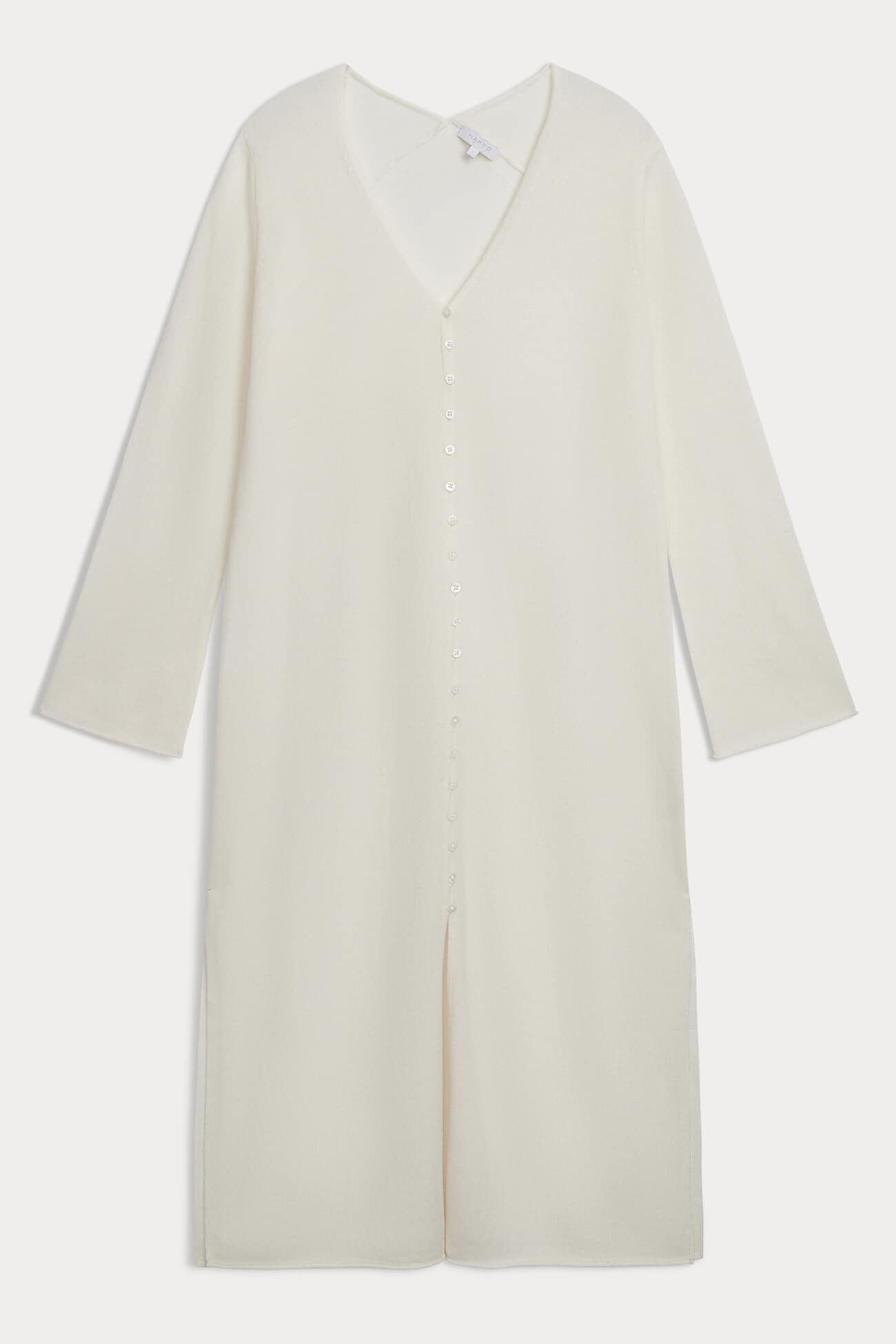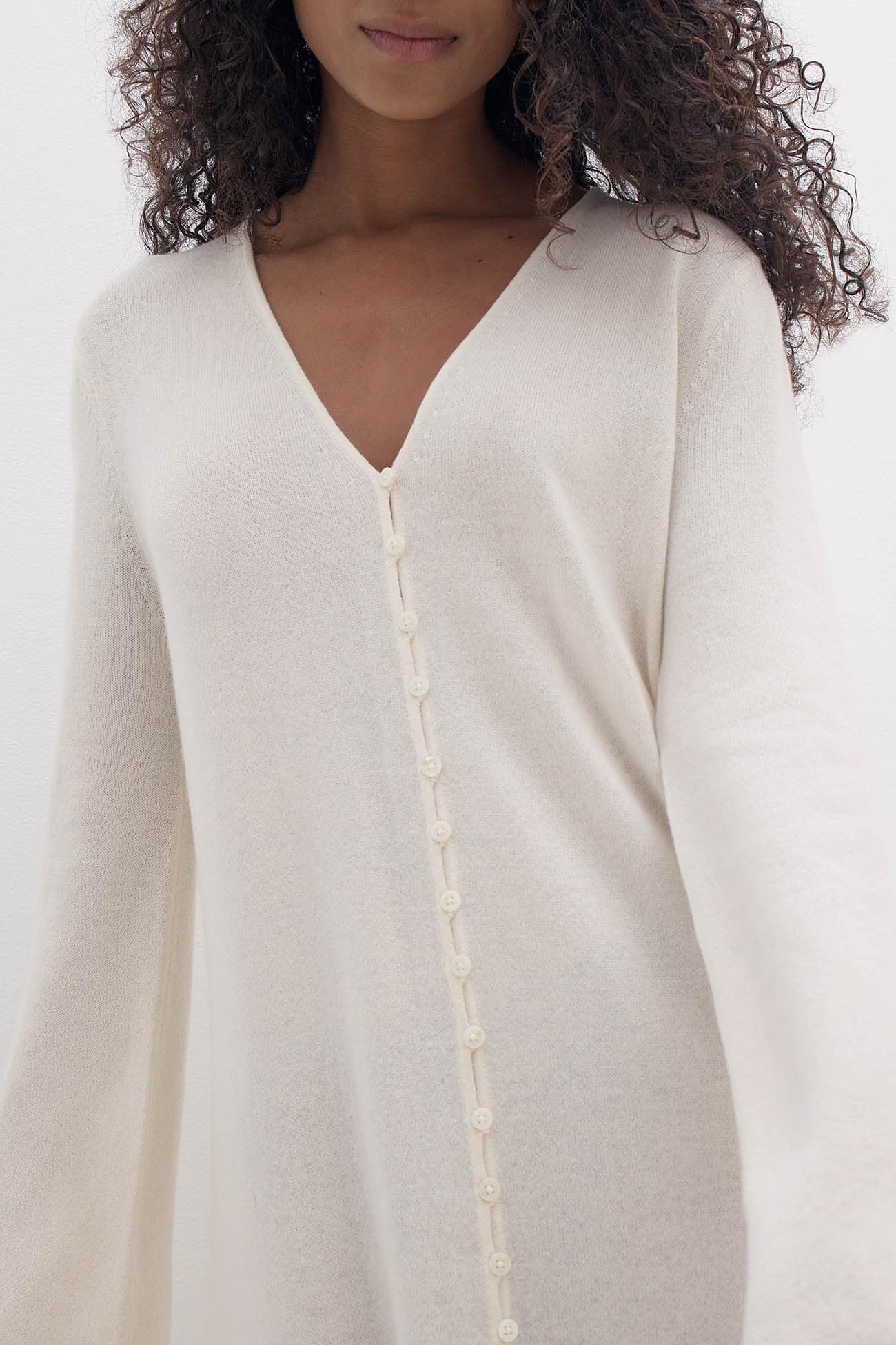 A flowing V-neck two-in-one kaftan and cardigan with shell buttons, side slits, and a hint of bell sleeves. Wear open as a cardigan or closed as a easy kaftan. Finished with a rolled hem and designed for effortless sophistication.
