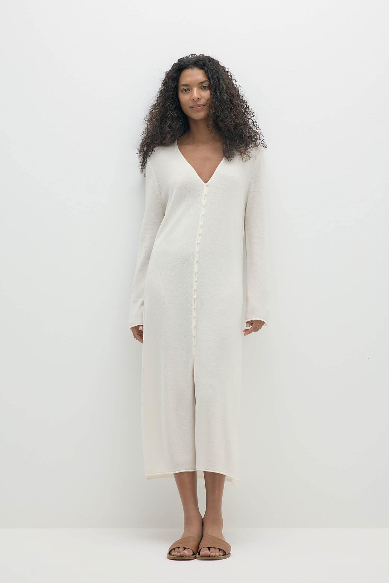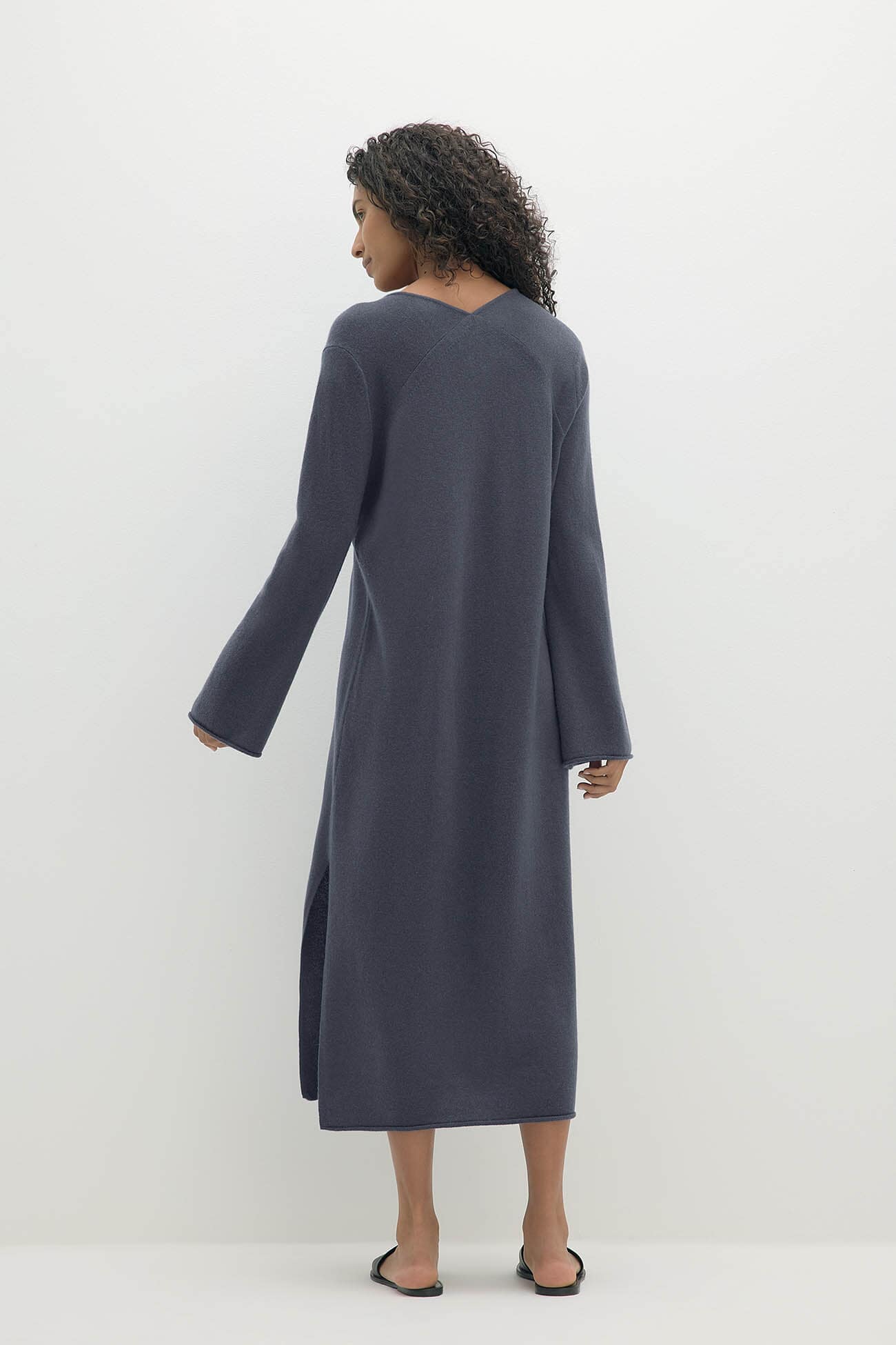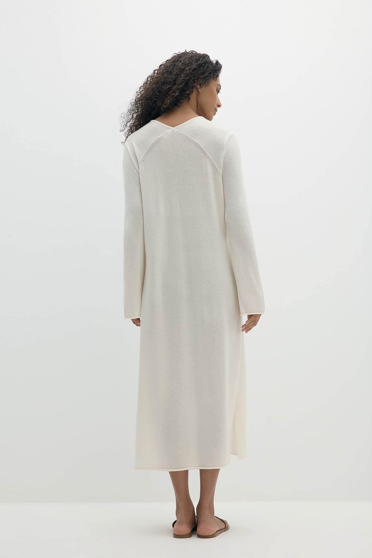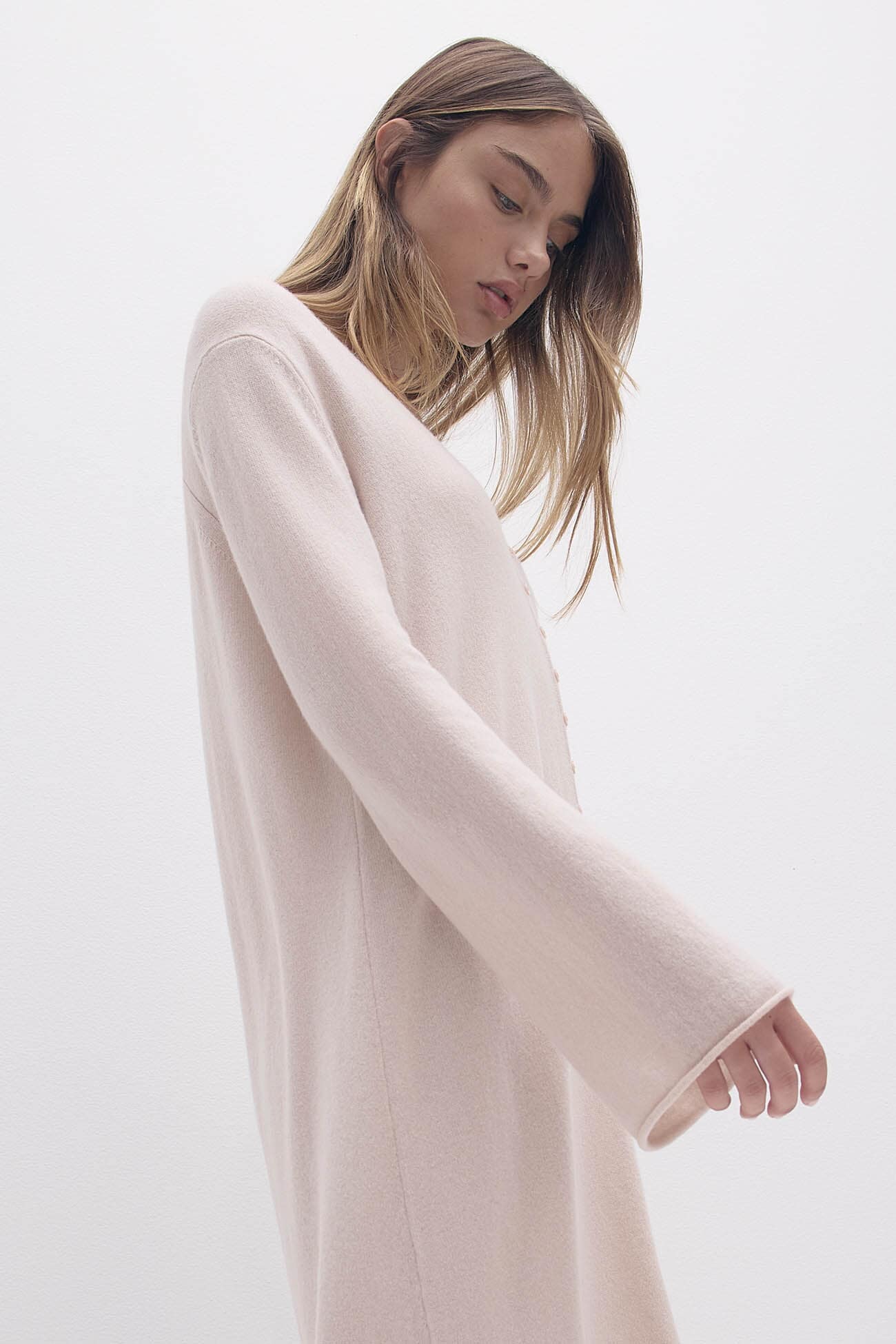 A flowing V-neck two-in-one kaftan and cardigan with shell buttons, side slits, and a hint of bell sleeves. Wear open as a cardigan or closed as a easy kaftan. Finished with a rolled hem and designed for effortless sophistication.