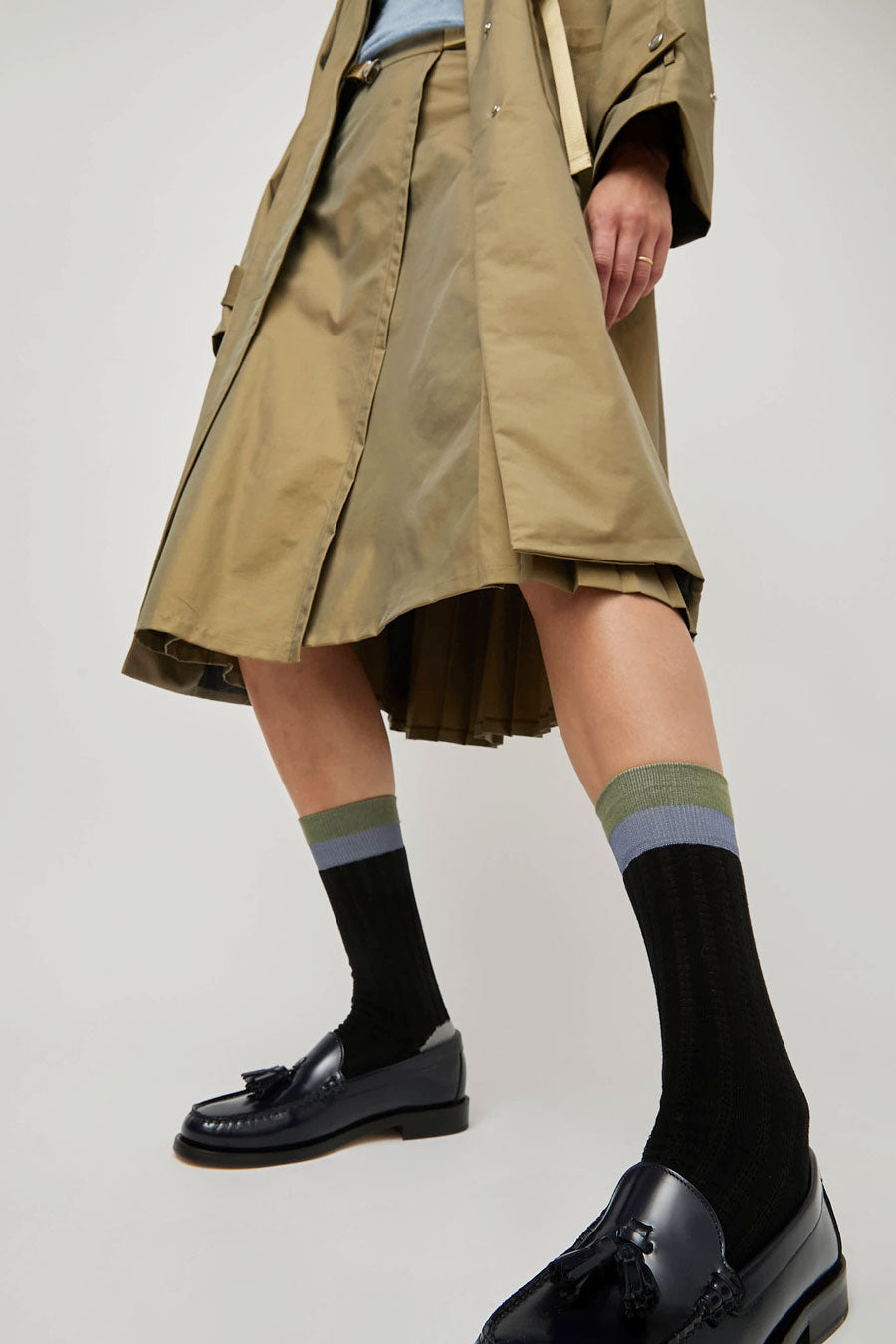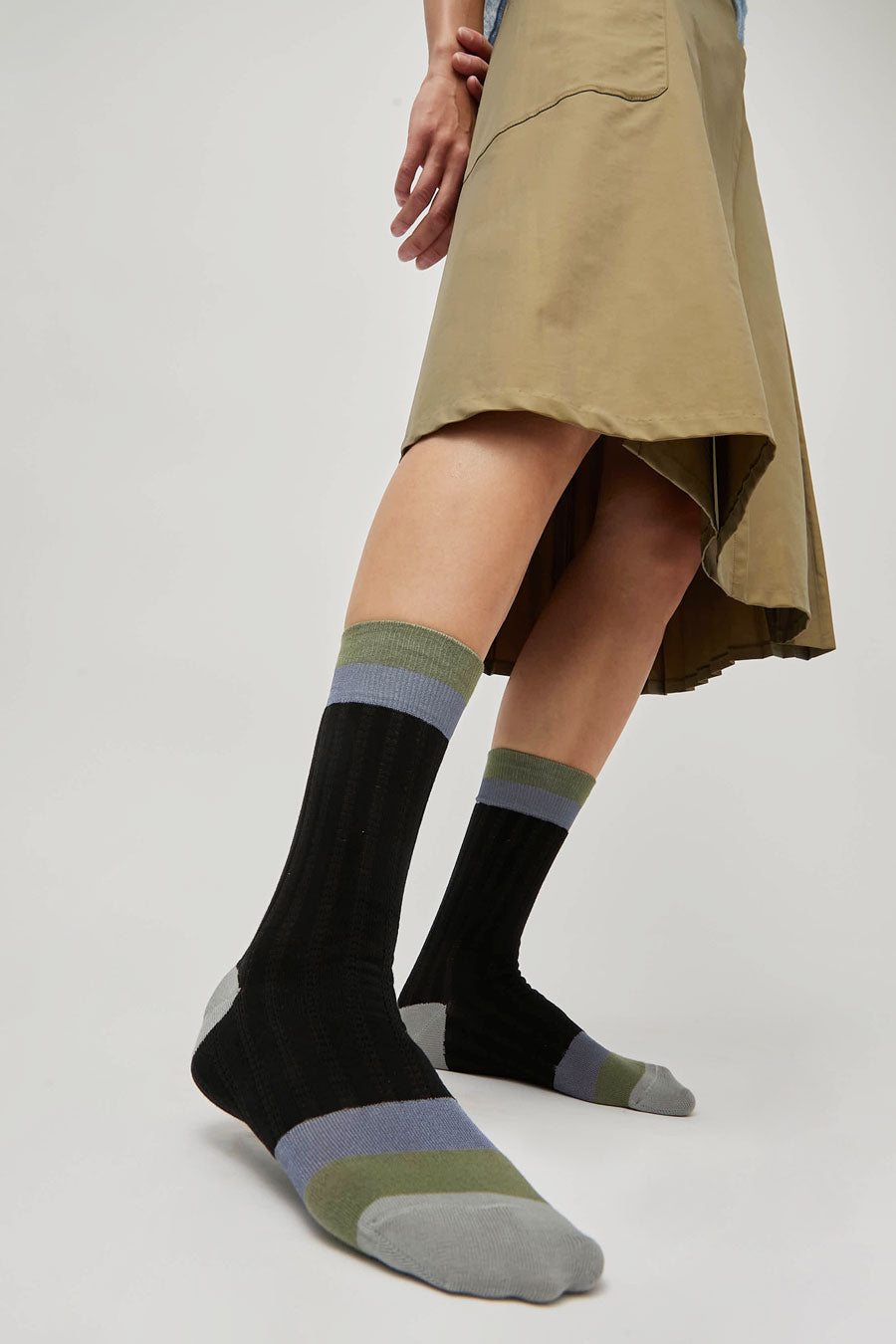 Mid-calf color blocked socks with ruffle detail at hem. Open weave with reinforced toe, heel and arch. Elasticated top for a perfect fit.