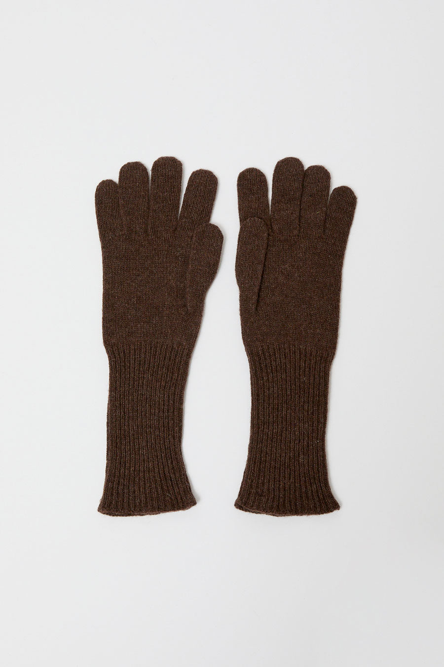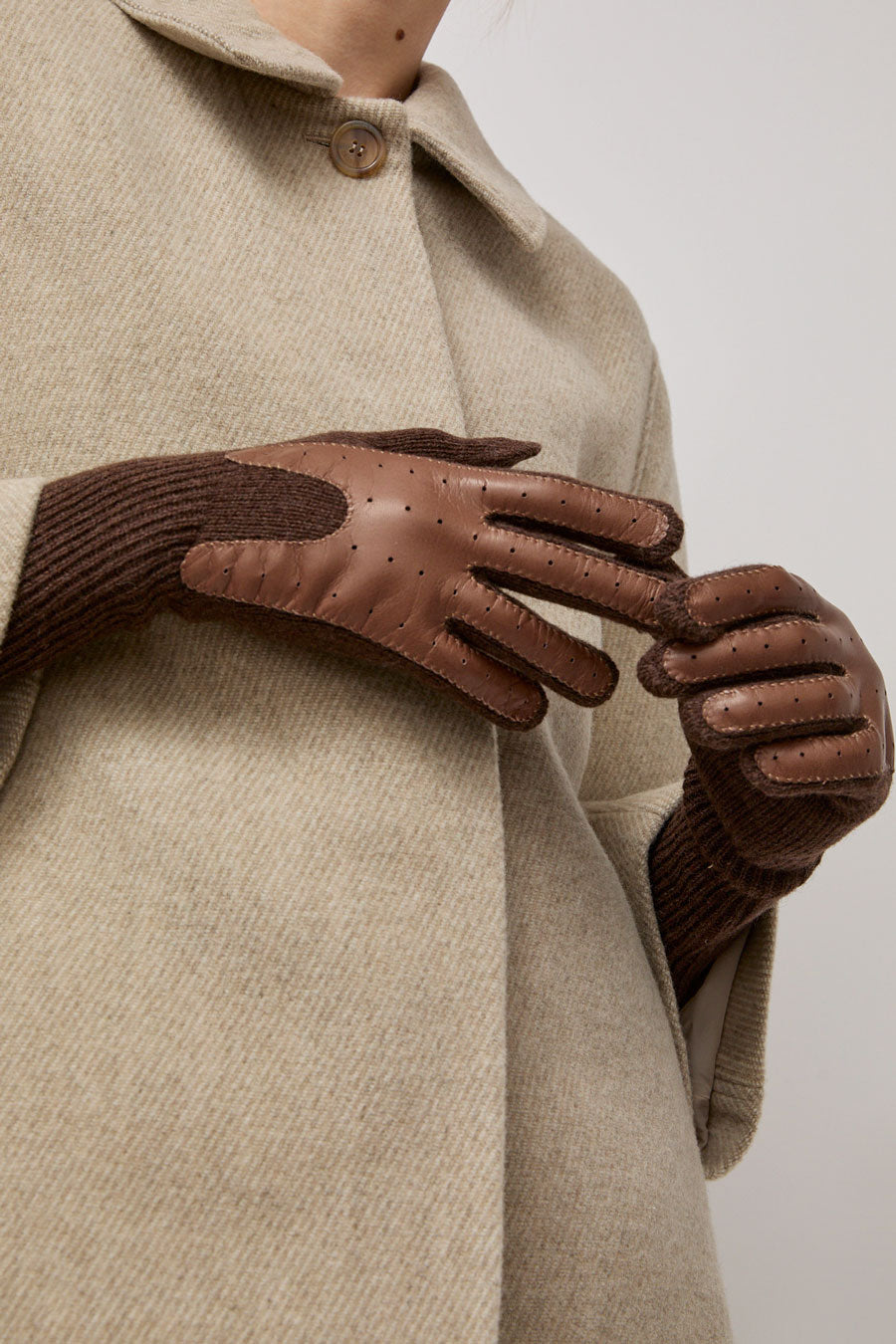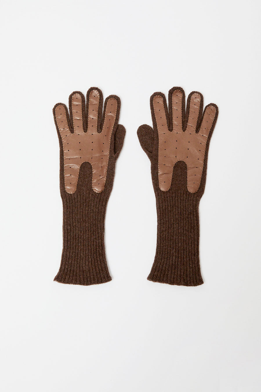 Wool gloves with contrasting calf leather detail. Long ribbed hem for warmth and a secure fit.