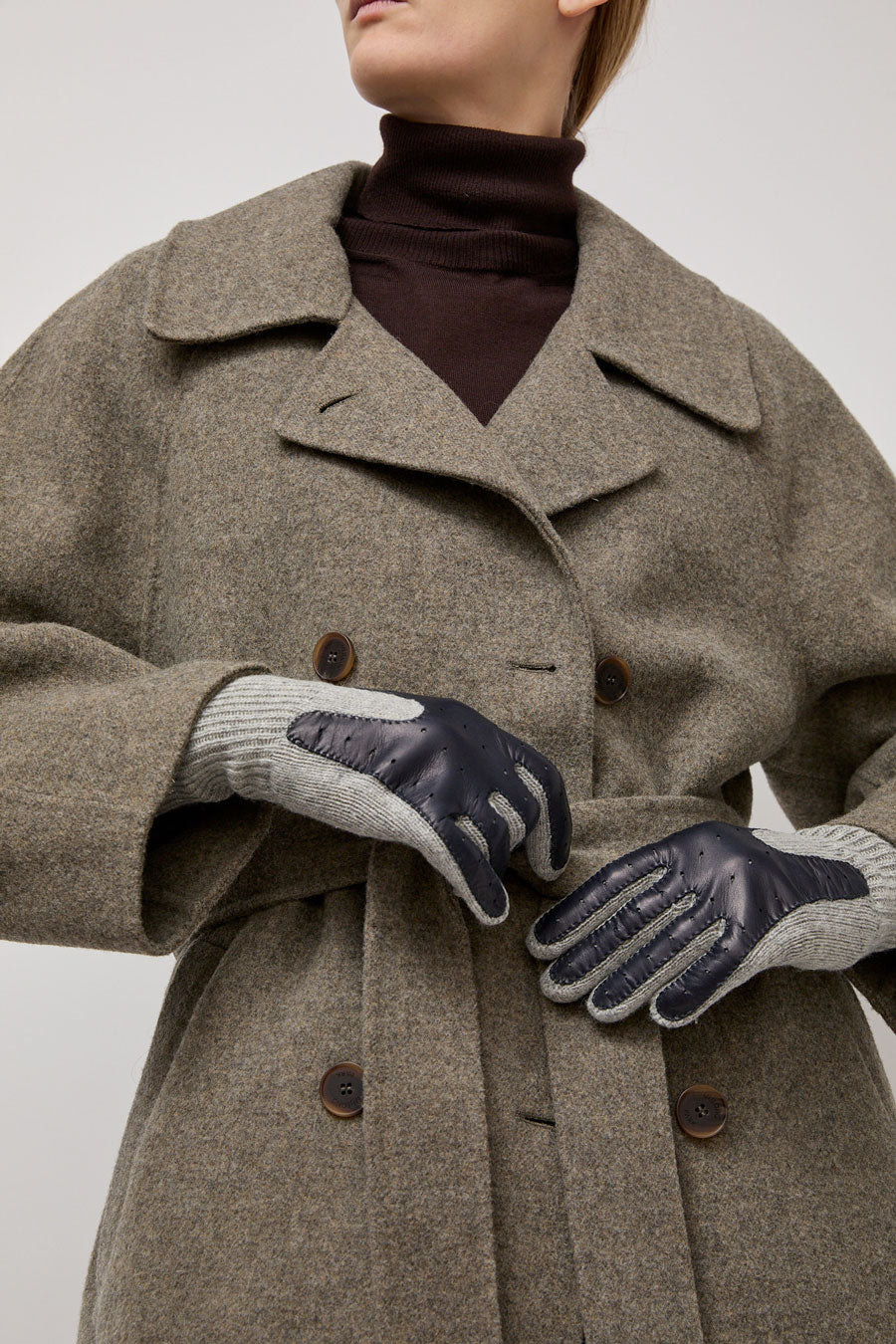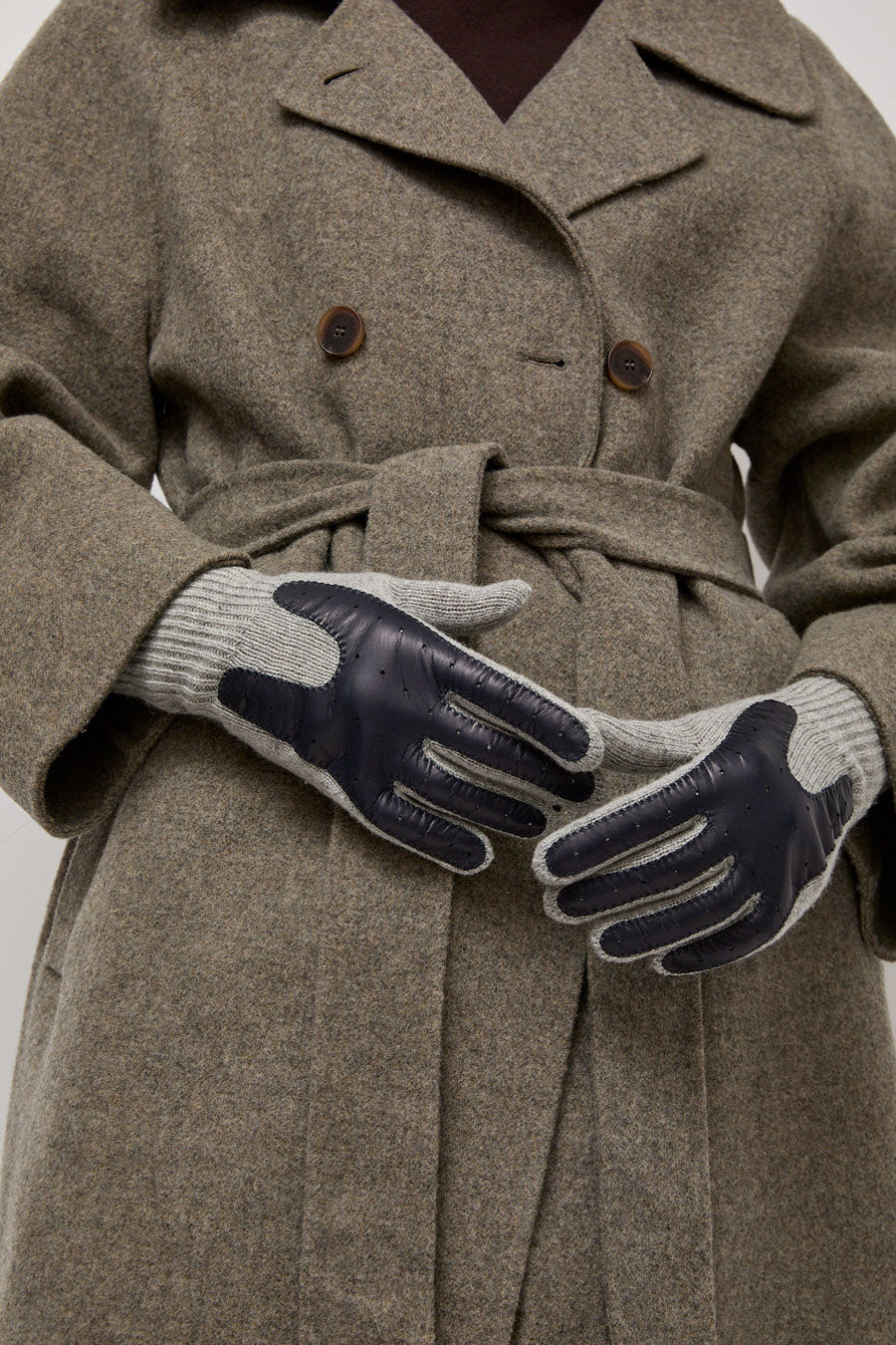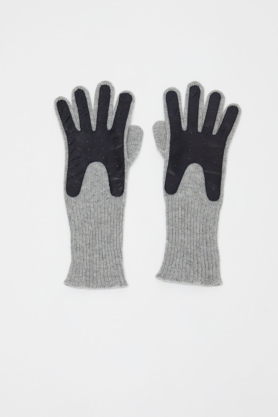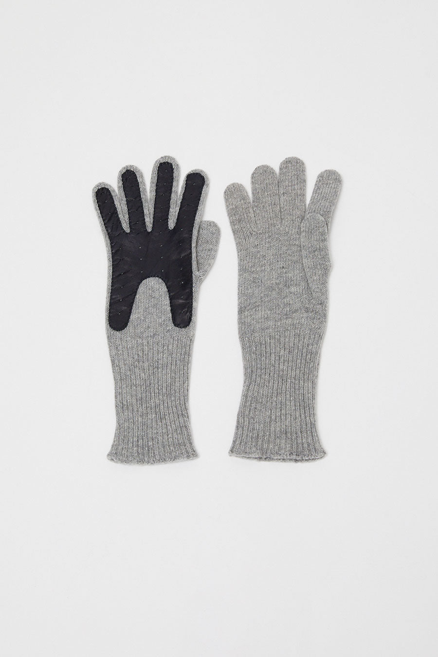 Wool gloves with contrasting calf leather accents. Long ribbed hem for warmth and a secure fit.