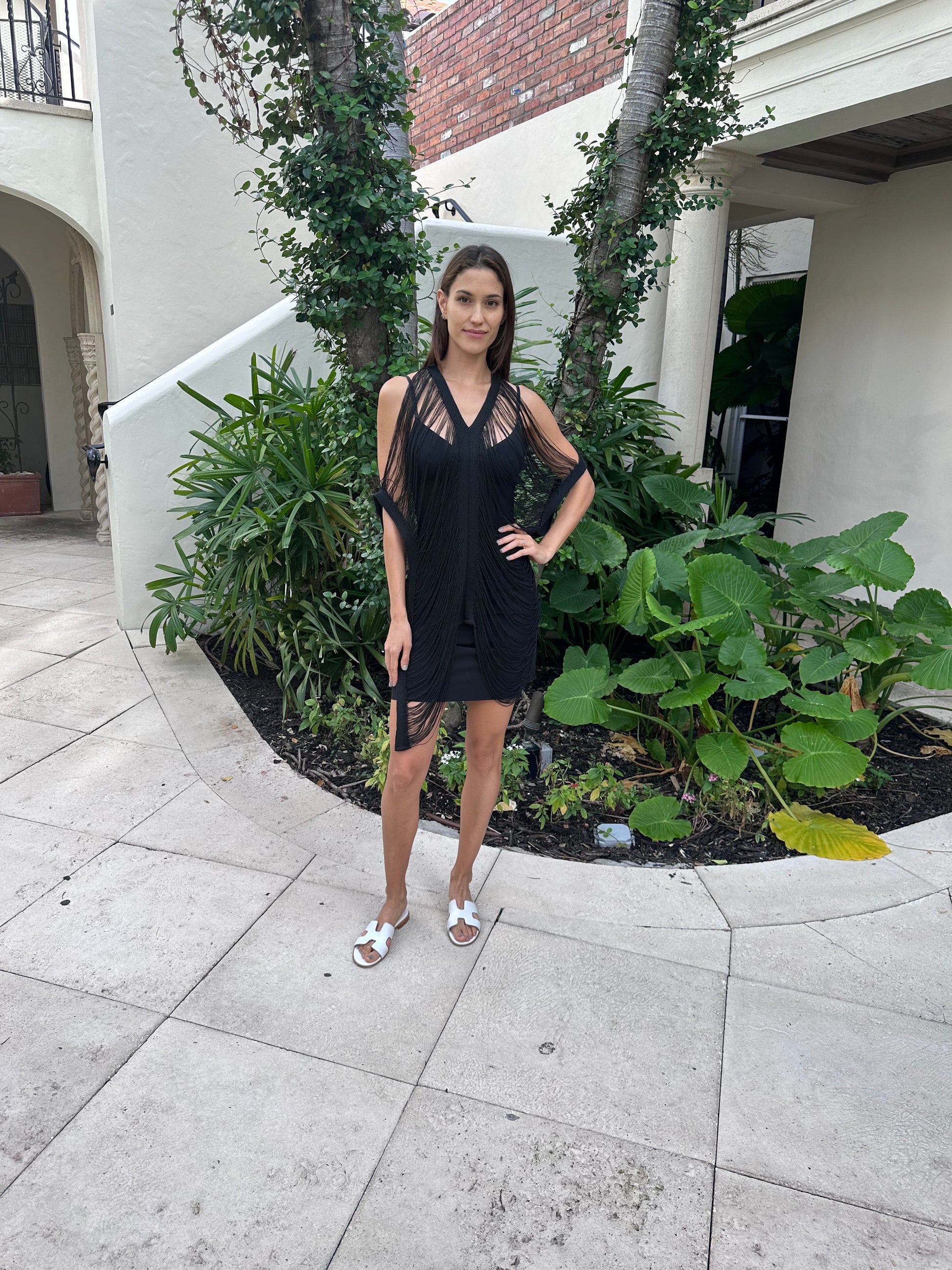 This top can be worn on top of a slip or as a cover up with your swimsuit. Featuring a black open knit mesh, V-neck, sleeveless, and the top is finished with a wreath edge.