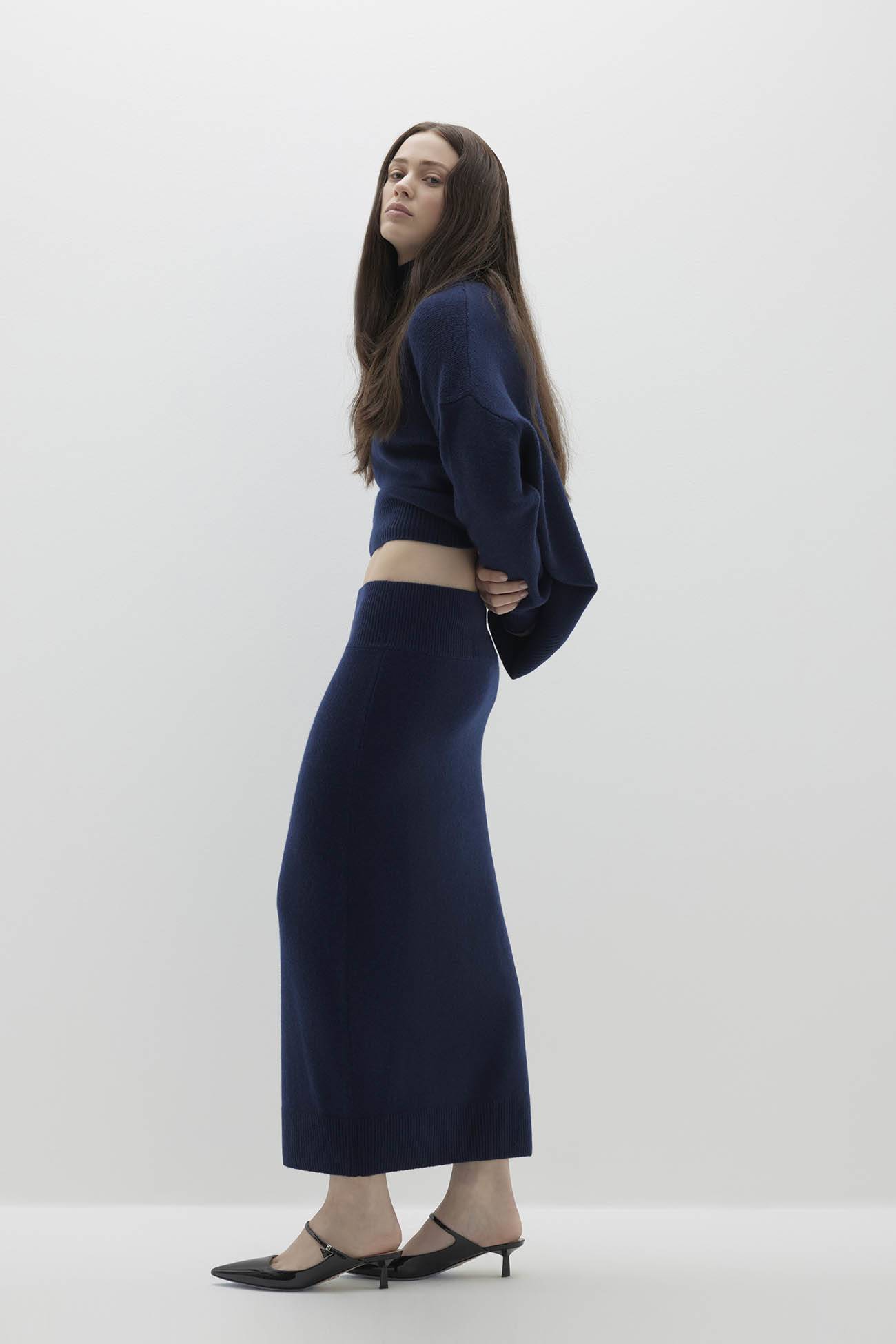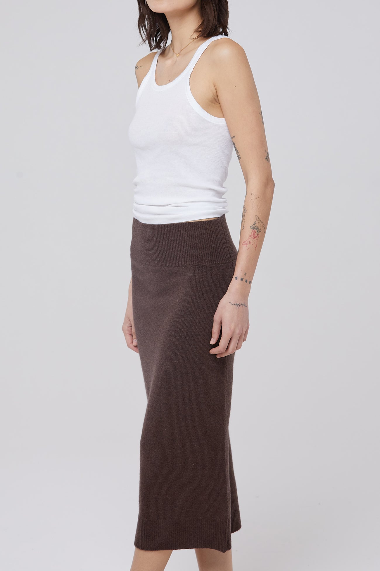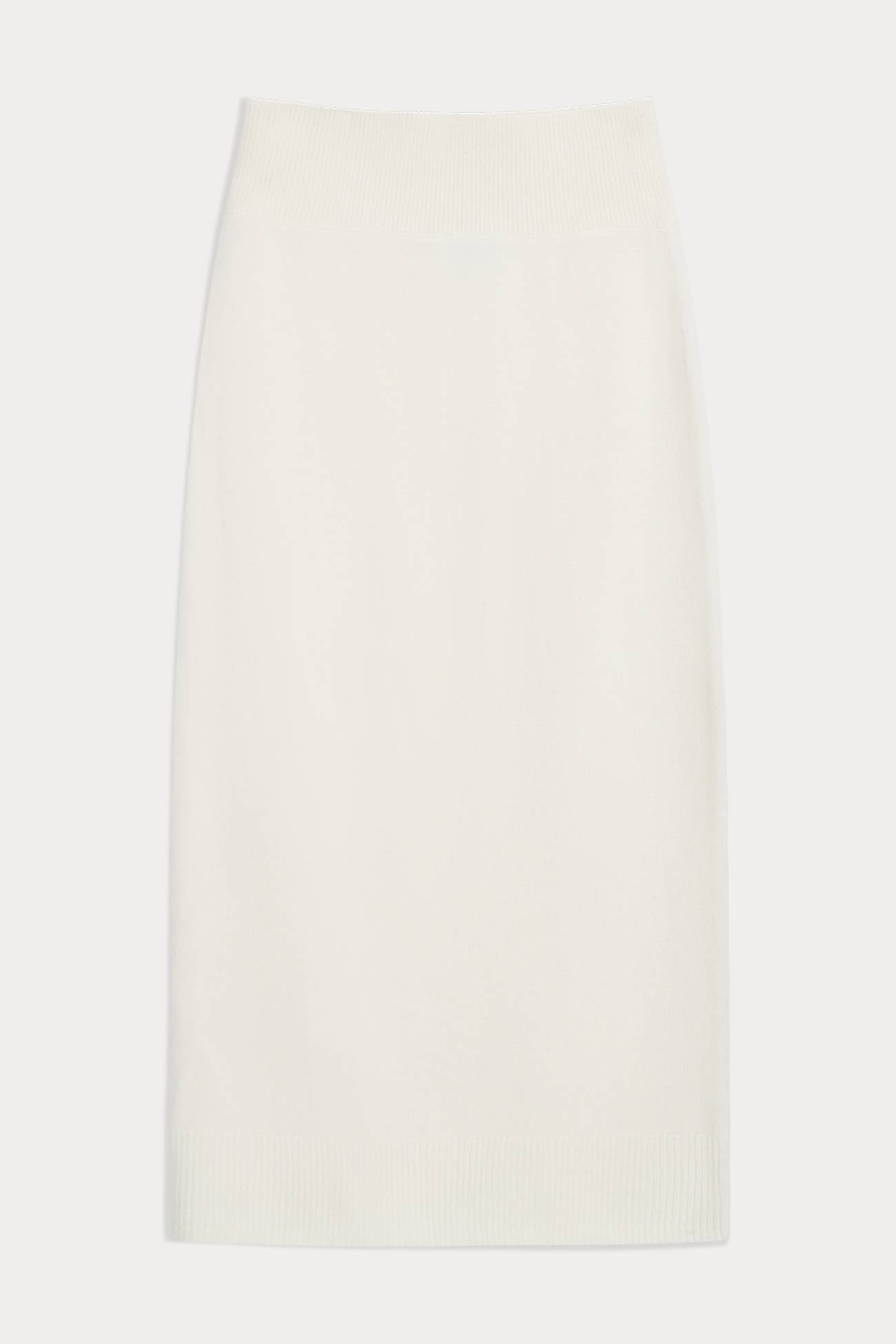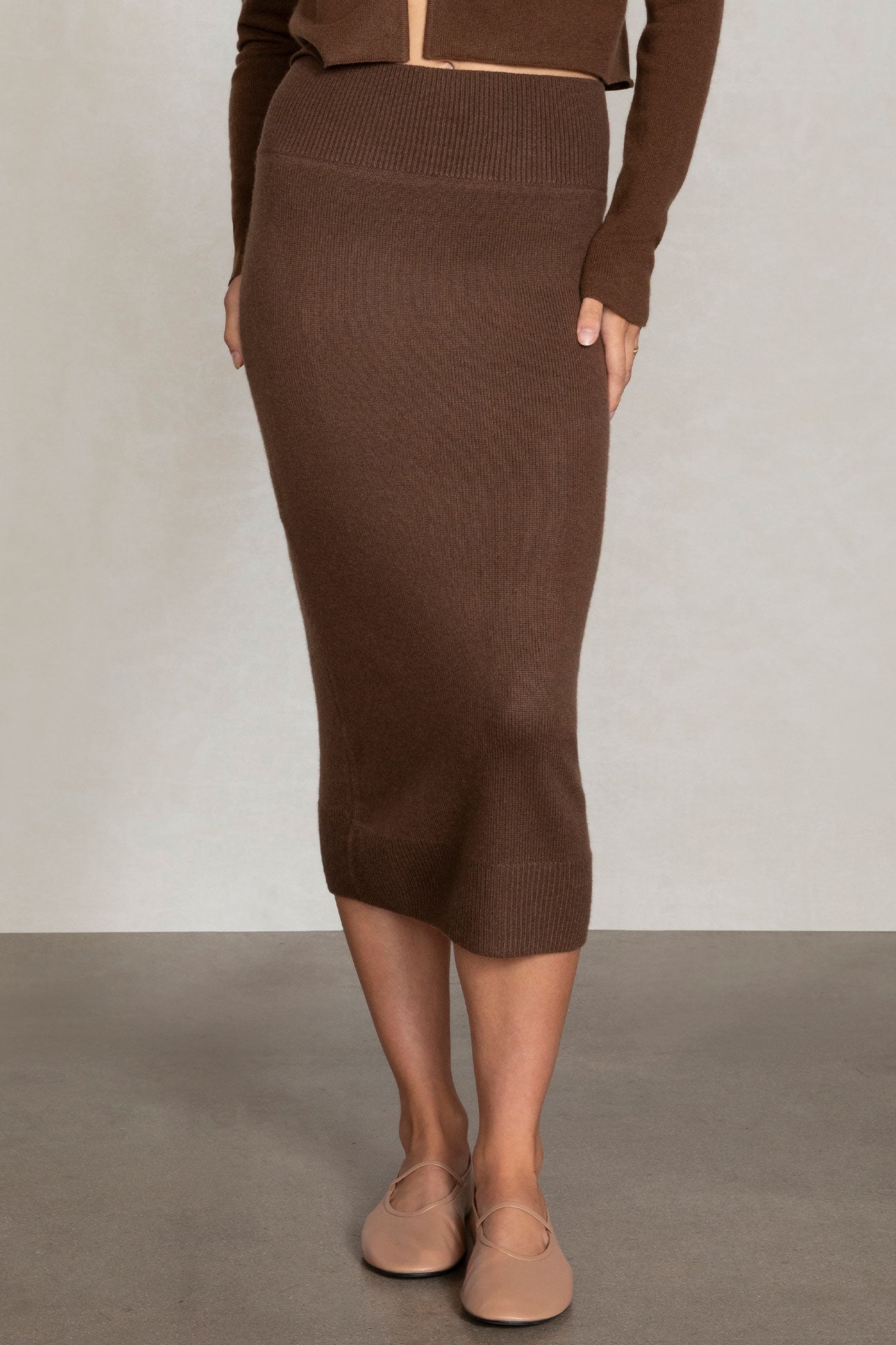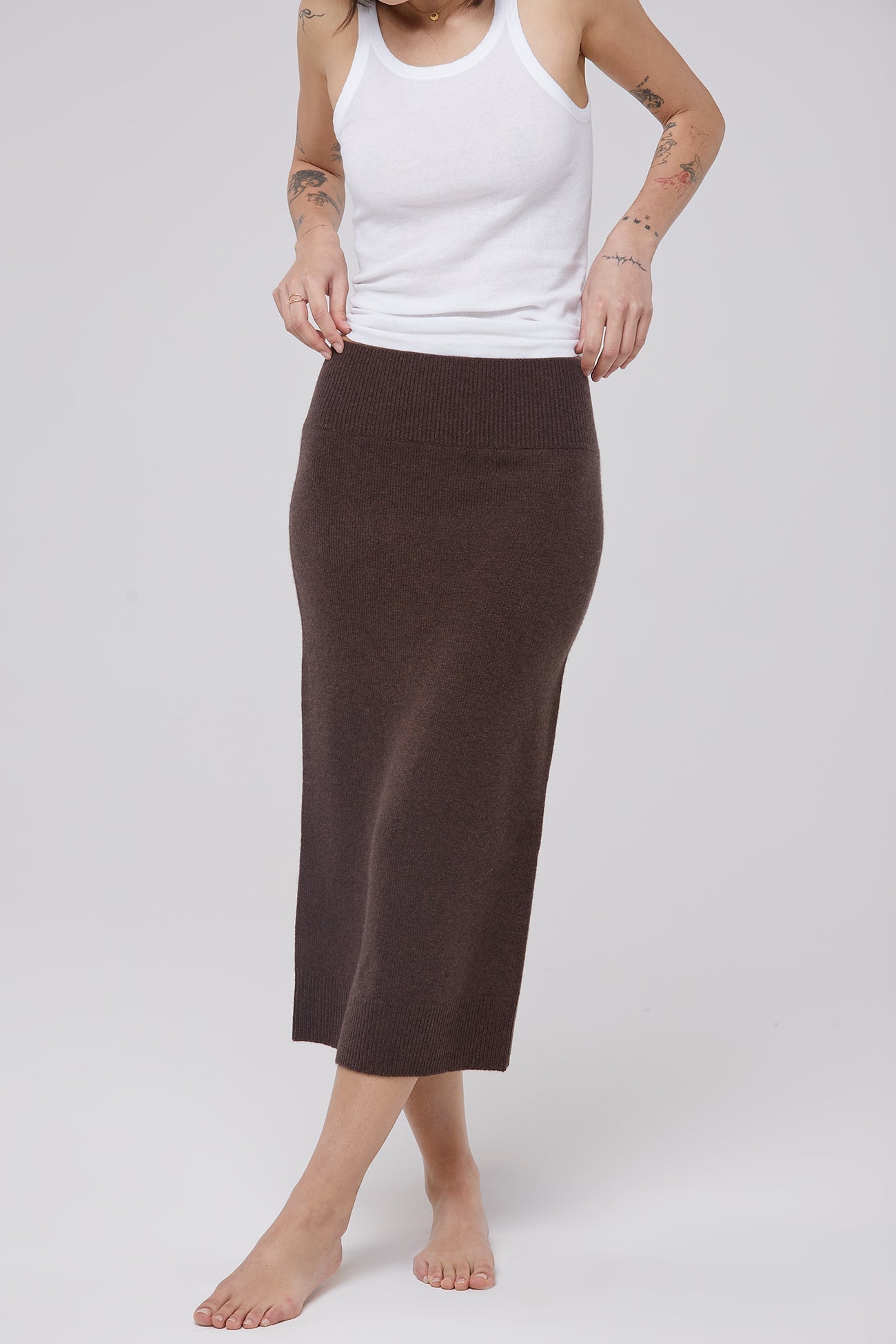 Chic knit pencil skirt that will take you from day to night. Sleek long-line silhouette and thick ribbed waist band for the perfect fit.