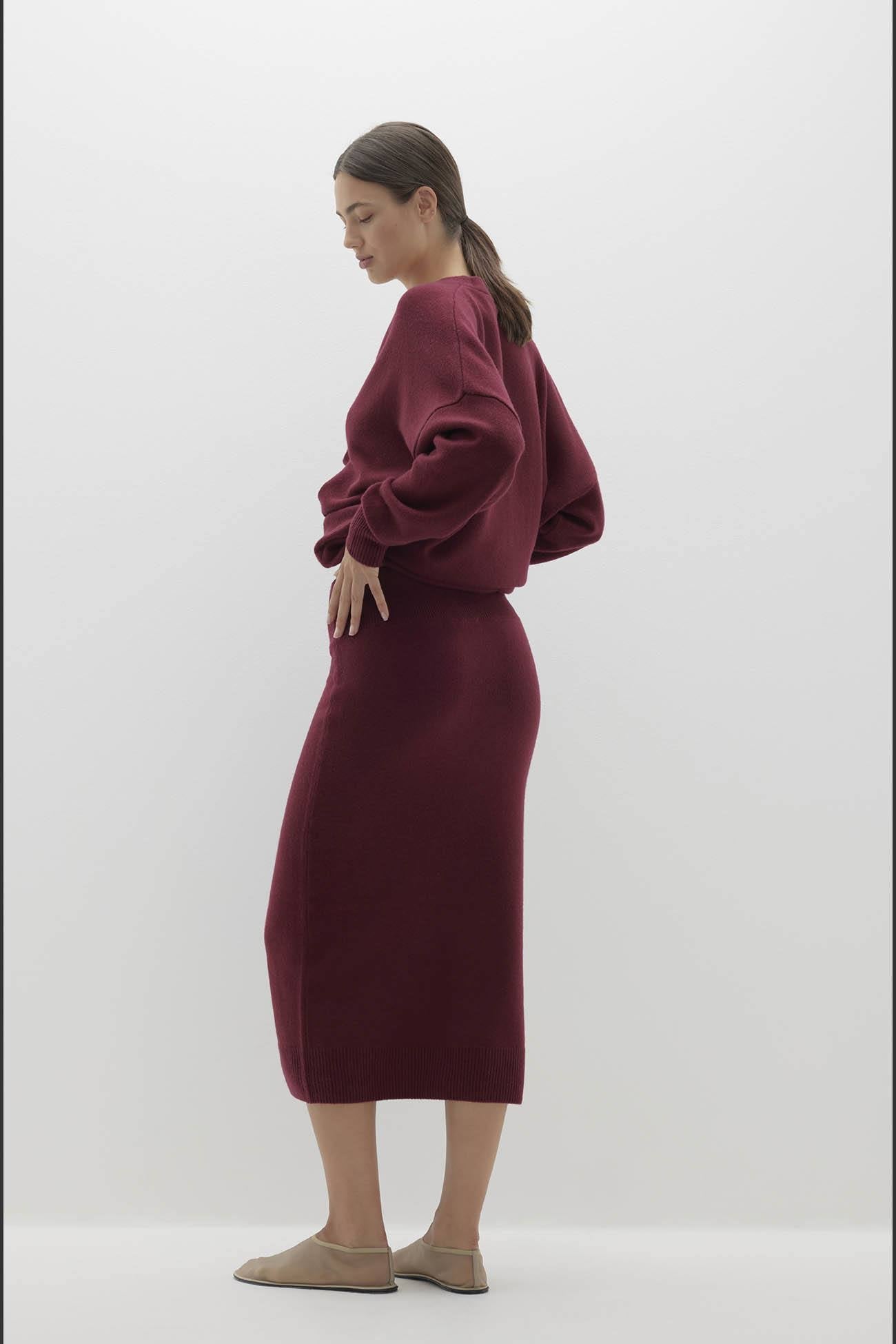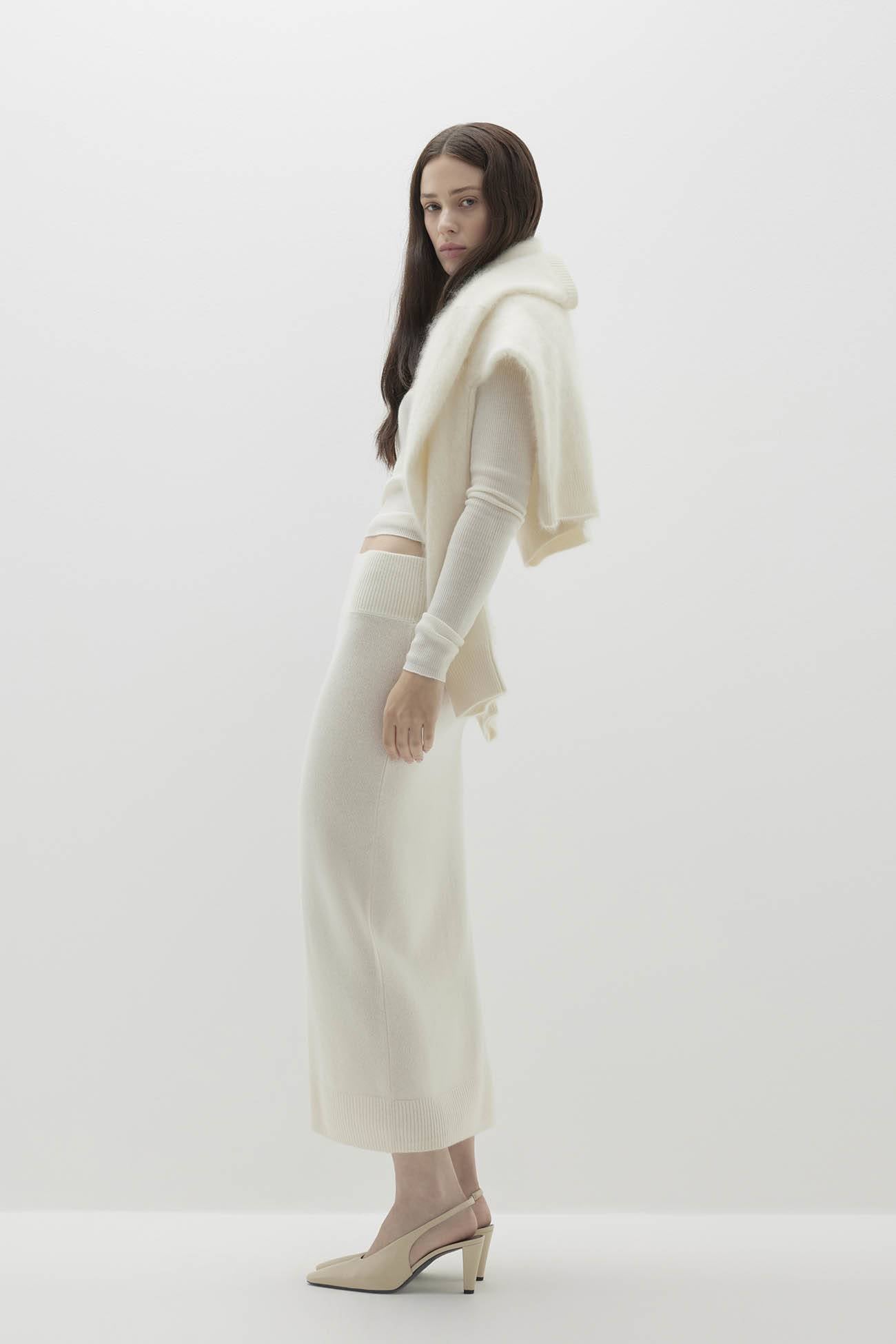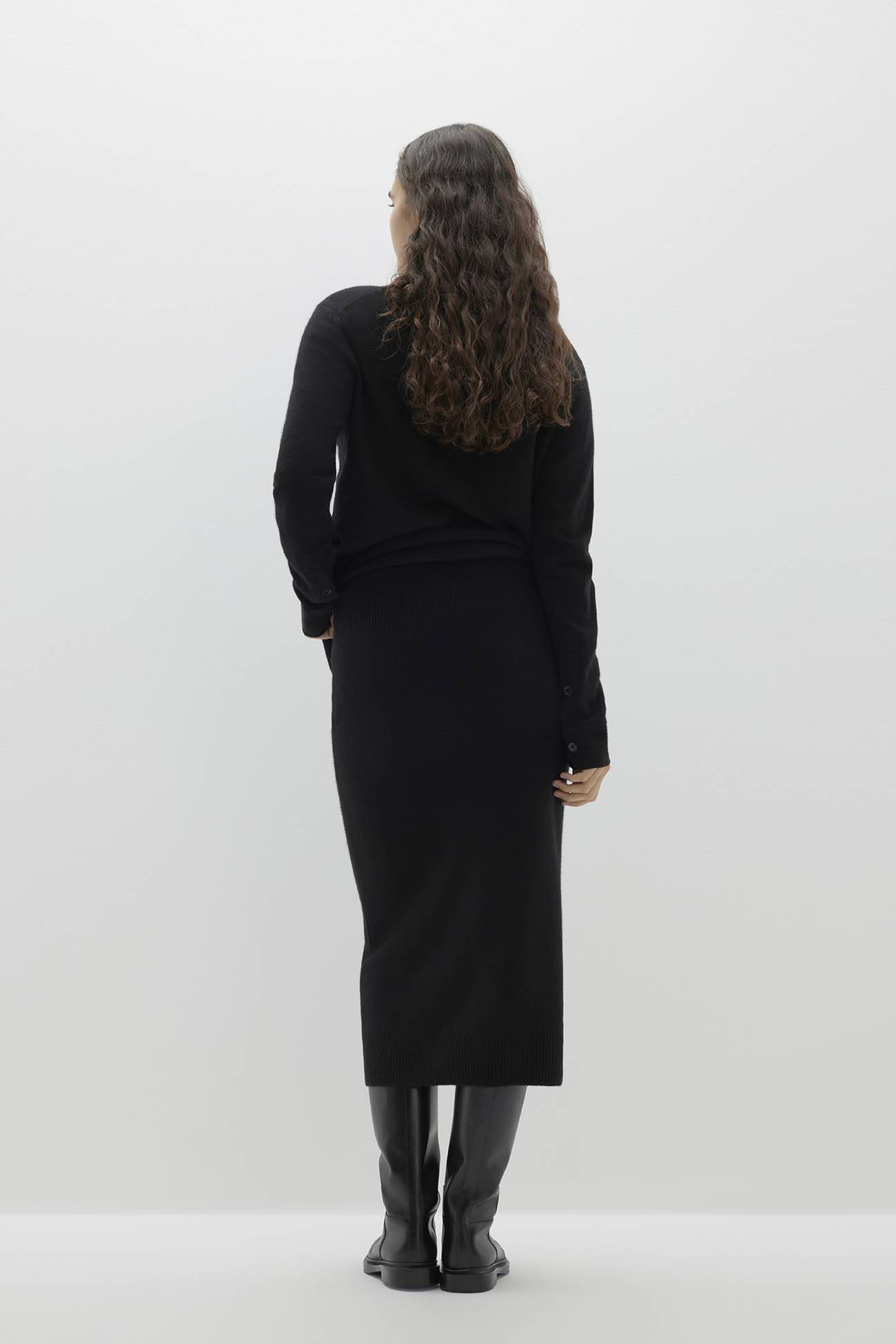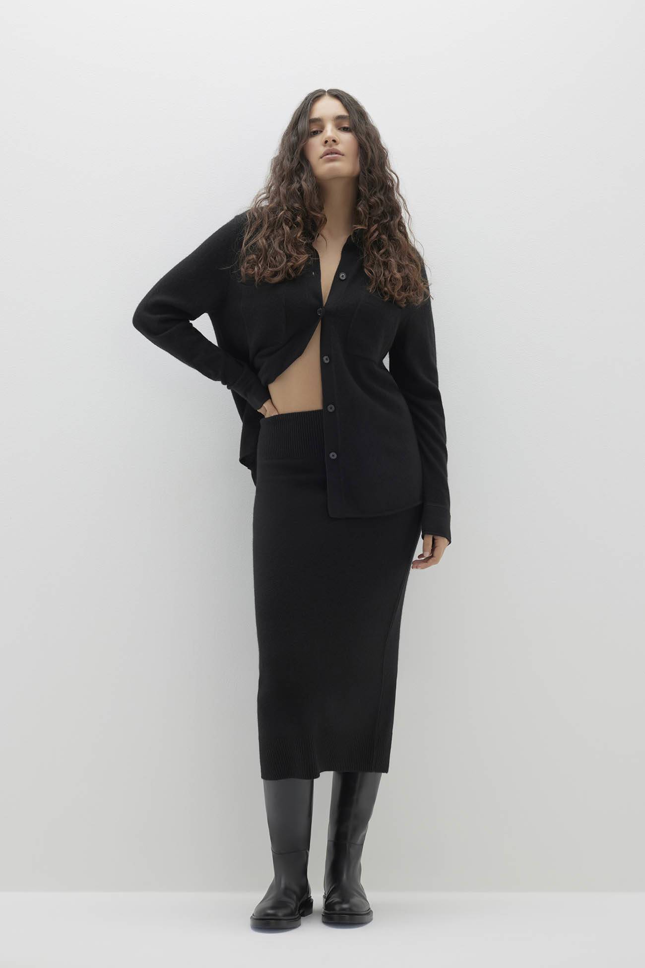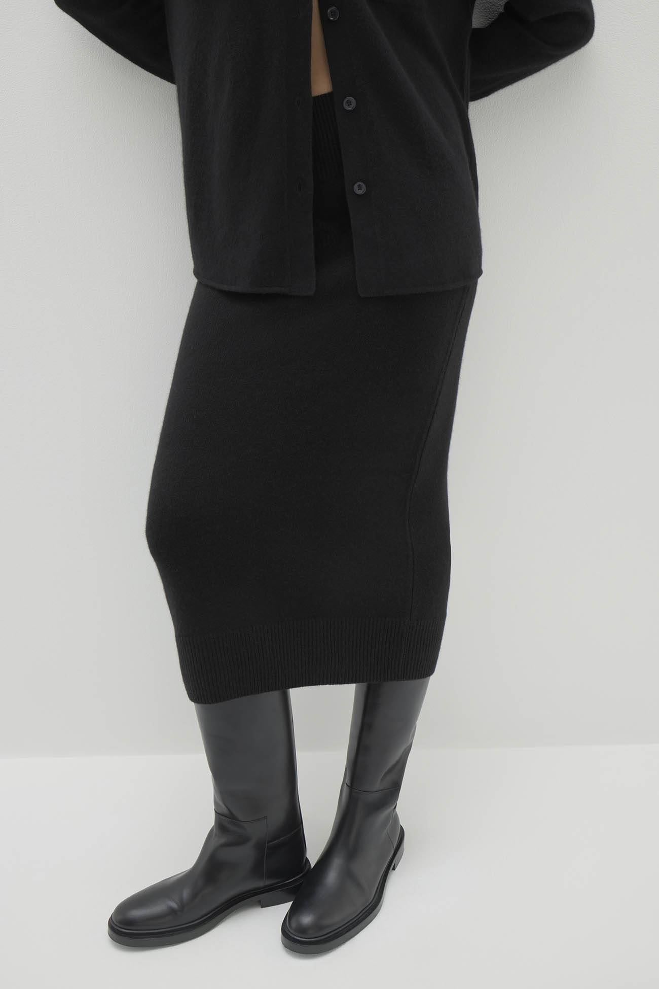 Chic knit pencil skirt that will take you from day to night. Sleek long-line silhouette and thick ribbed waist band for the perfect fit.
