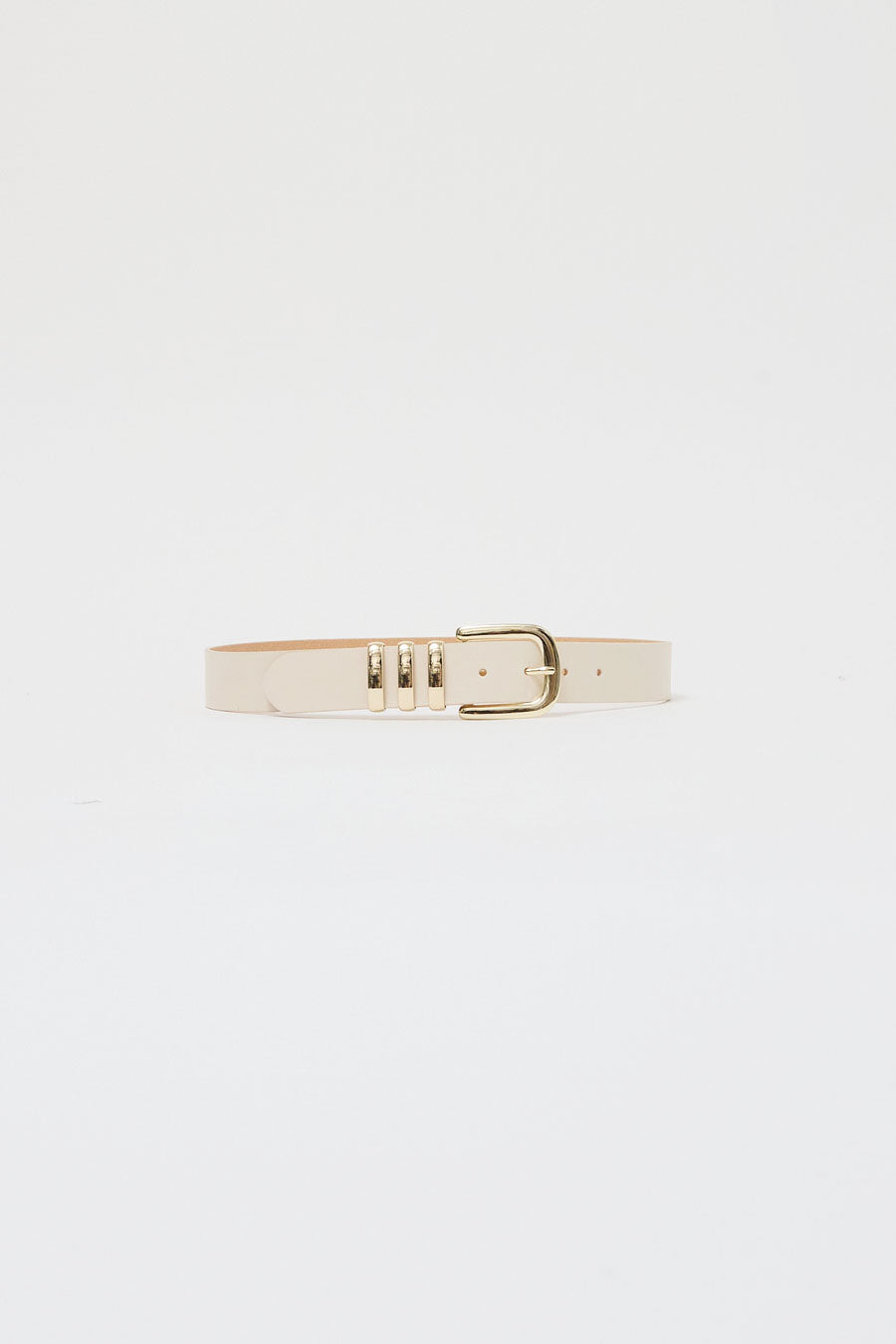 Leather belt with bold metallic oval buckle and triple loop detail. Great for everyday wear.