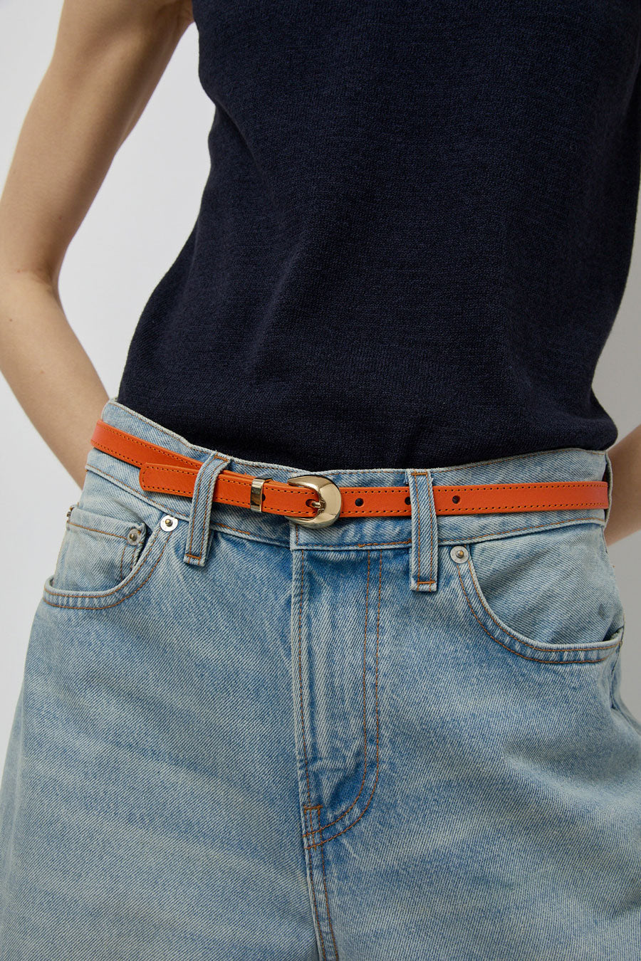 Thin leather belt with streamlined metallic oval buckle. Effortlessly throw on to dress up your everyday wear.