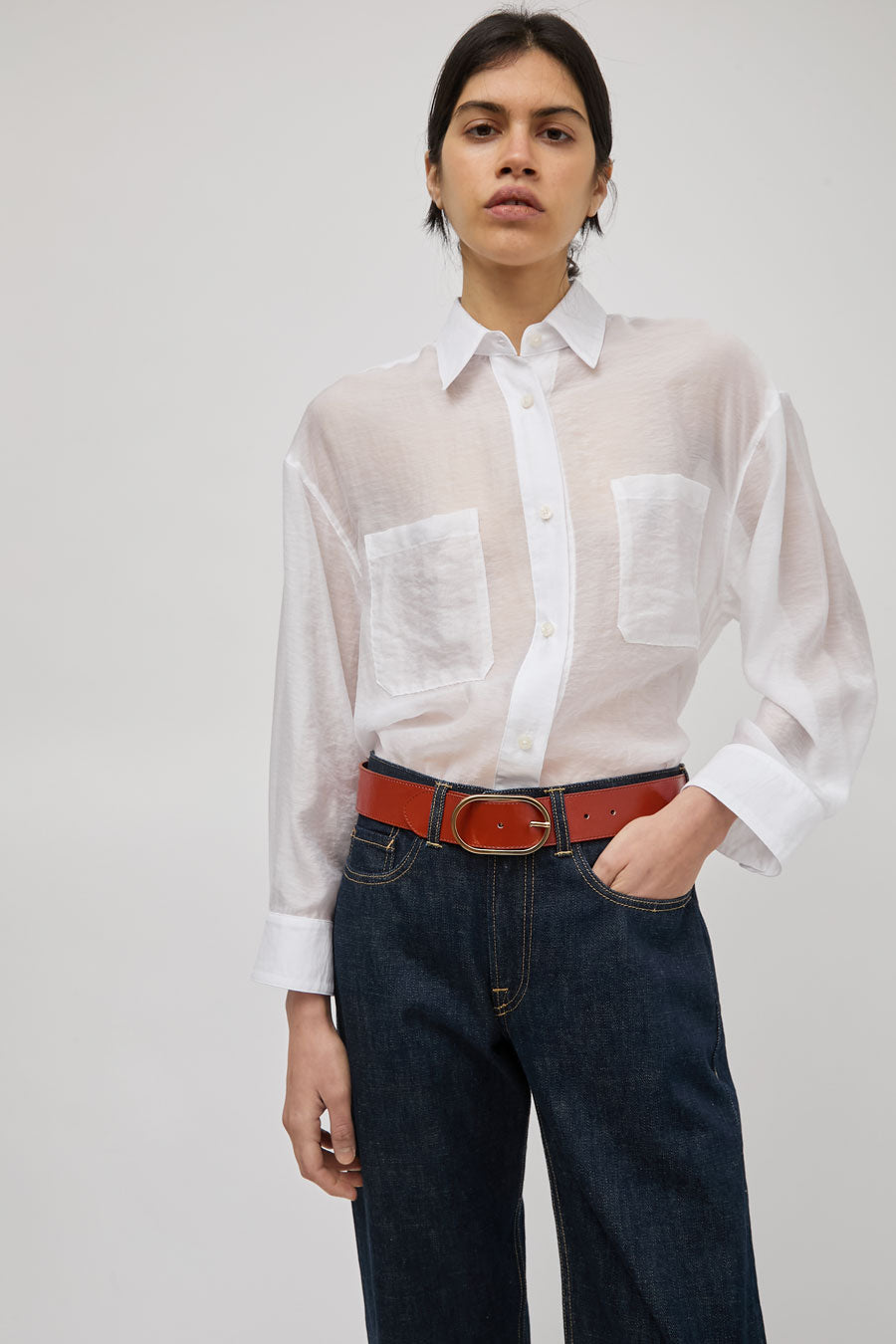 Minimal leather belt with oval gold buckle. Effortlessly throw on to dress up your everyday wear.