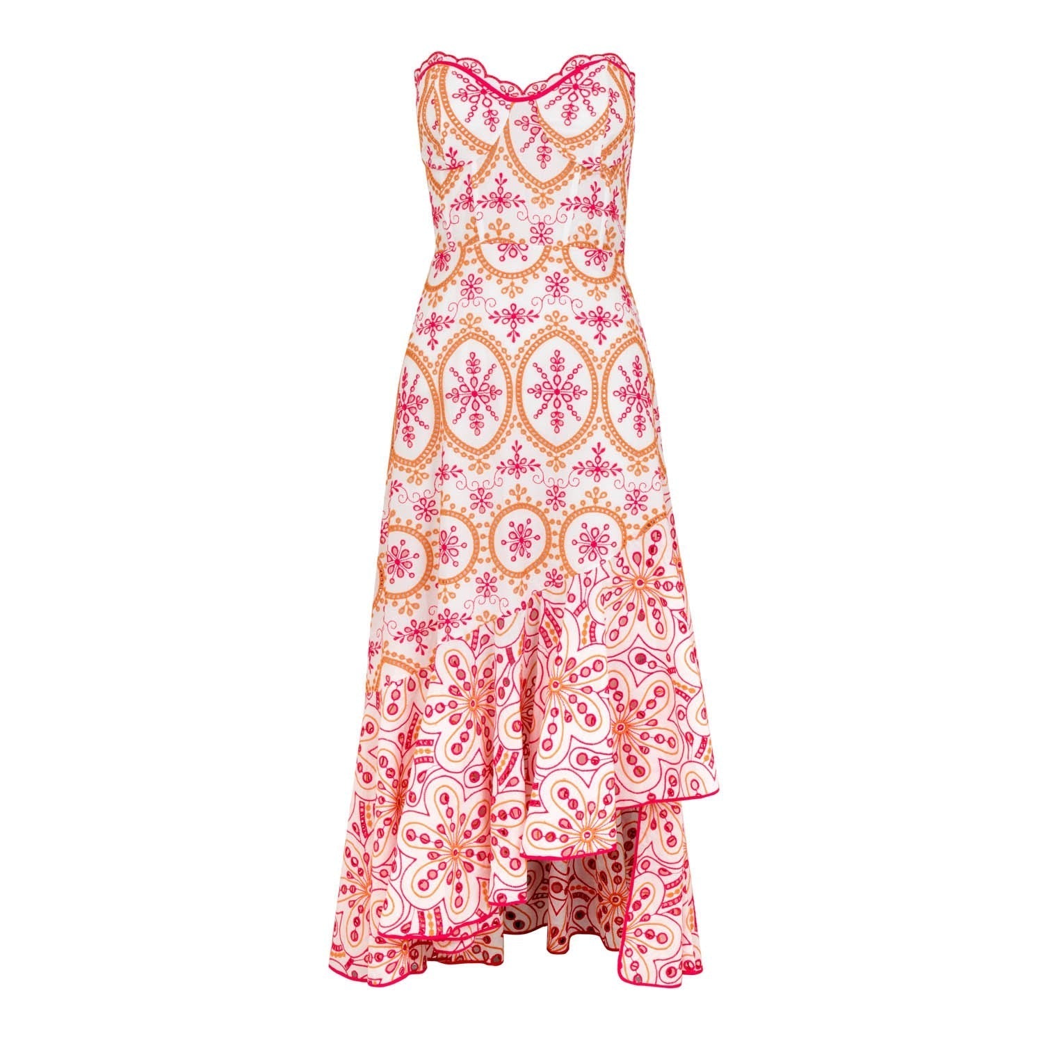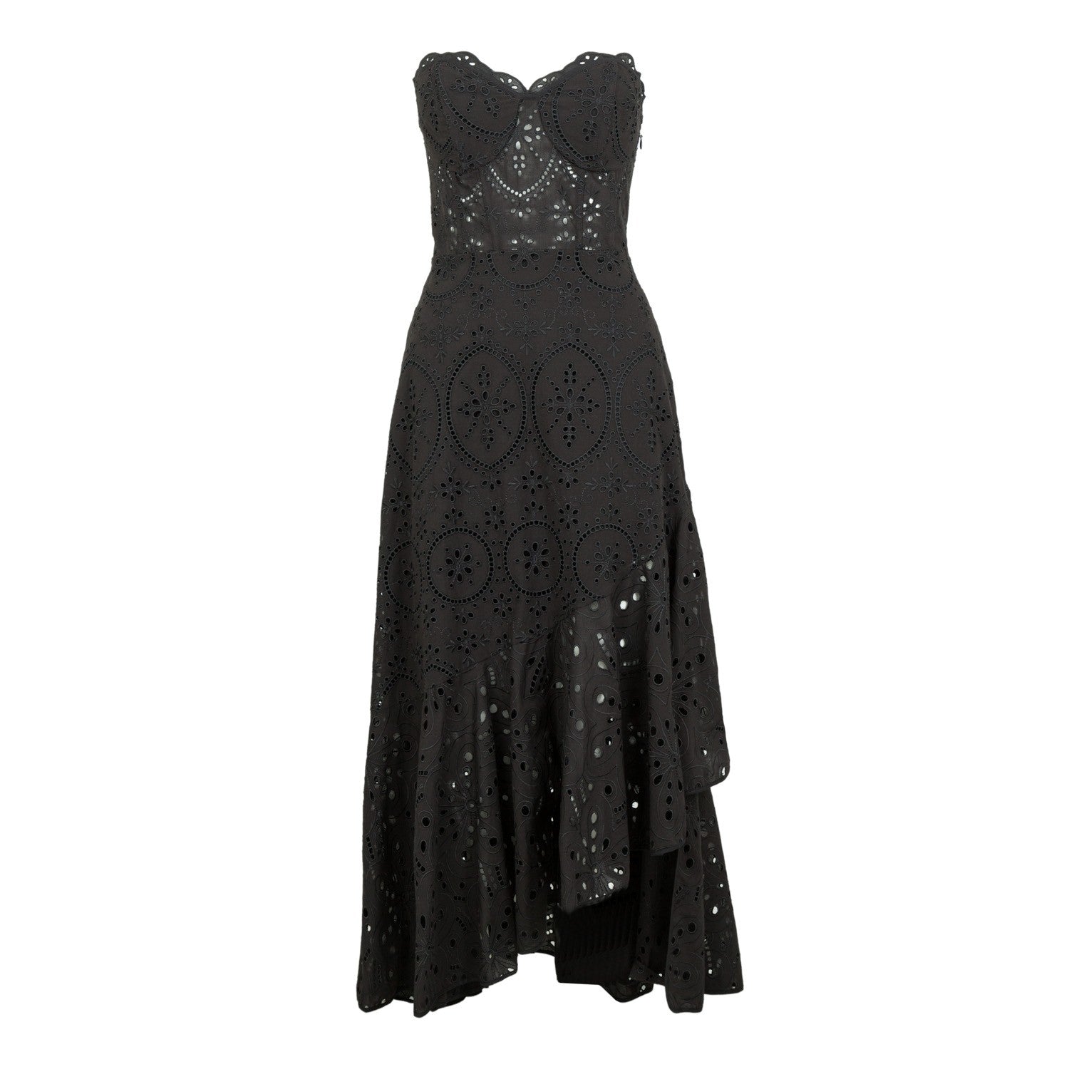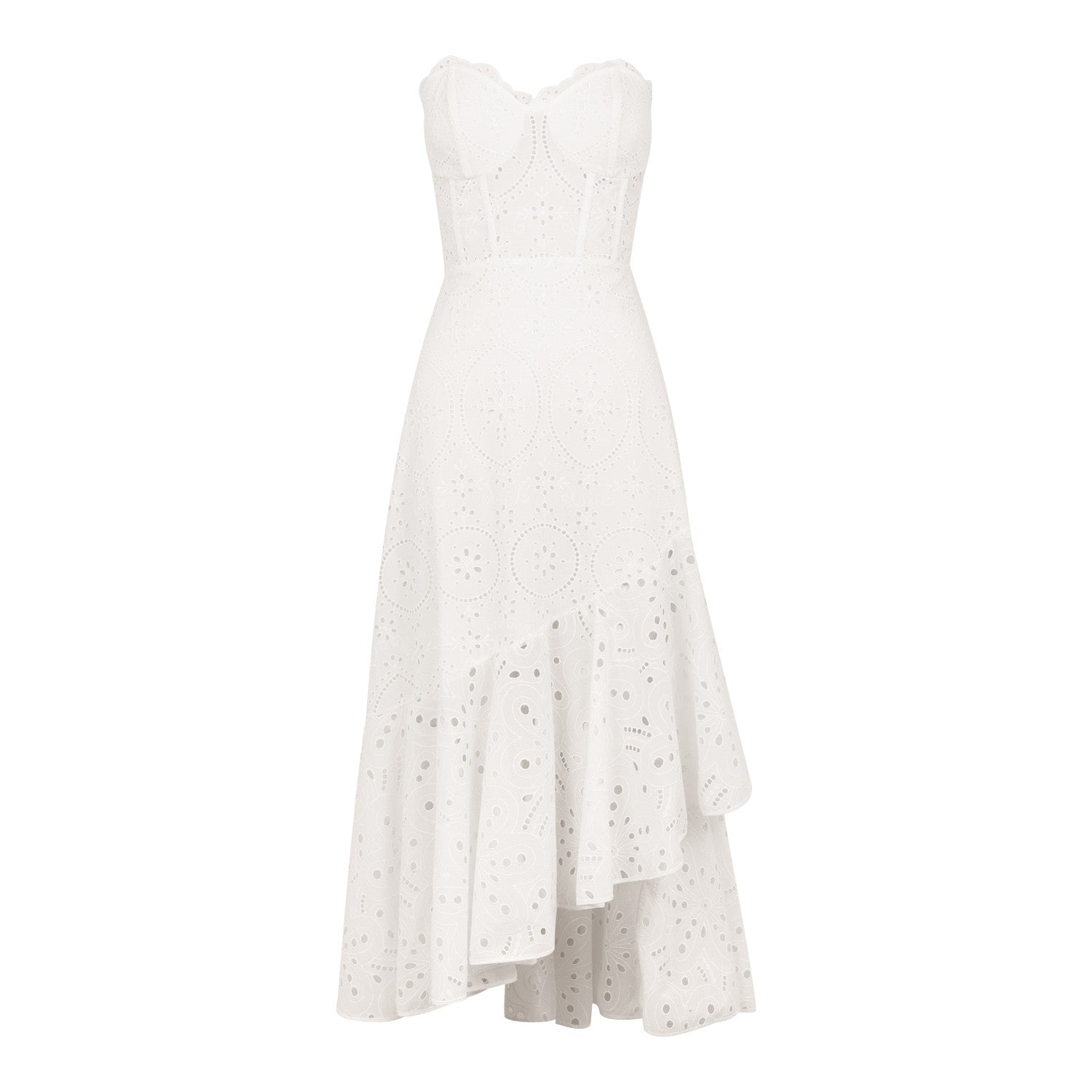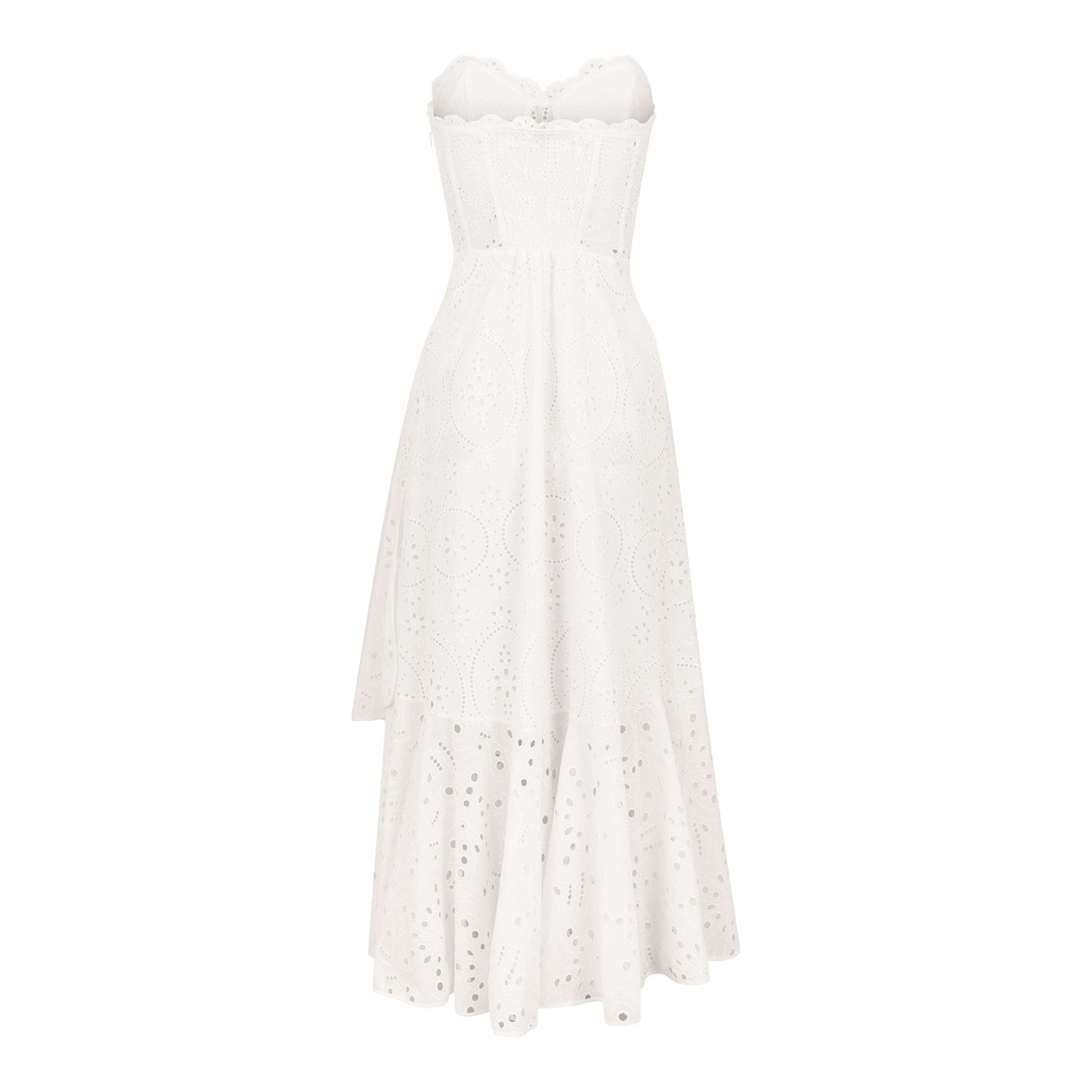 Our Aurora dress made of partially lined broderie anglaise cotton-blend is an obvious choice for summer. The fitted corset bodice and the strapless, pretty sweetheart neckline trimmed in guipure elegantly frame the décolletage. Fitted at the waist the Aurora falls into a soft, romantic asymmetric tier made of the same openwork fabric. Showcase the strapless sweetheart neckline with swept-up hair and dewy makeup.