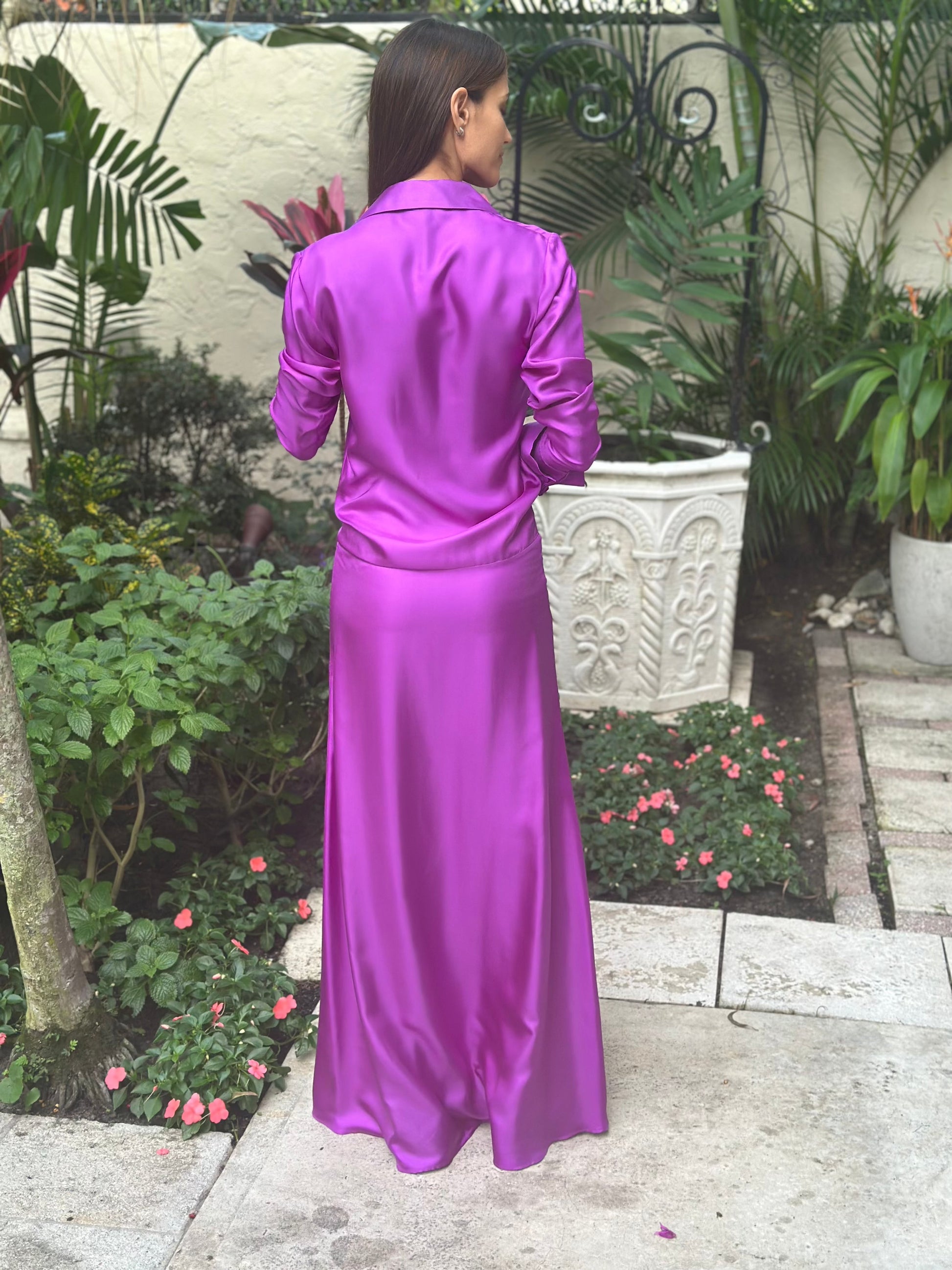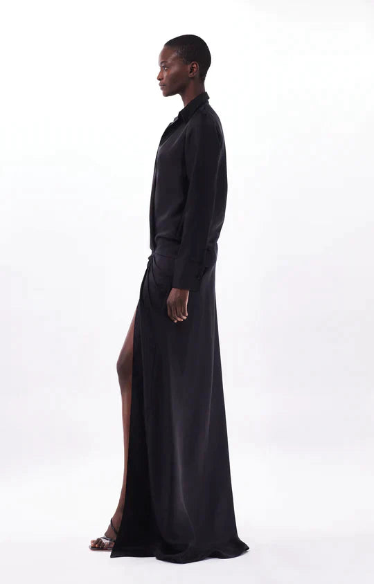 Collared, long and flowy, this dress is gathered at the waist, has a high slit, and is cuffed at the sleeves.