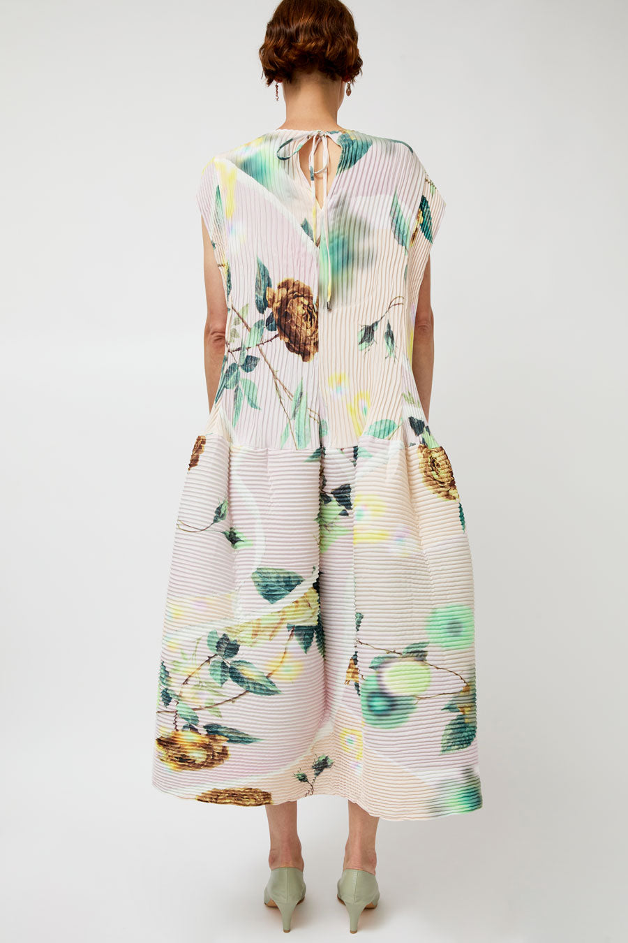 Hand pleated crepe dress. Sleeveless with crew and all-over print. Lightweight but not sheer. Fine pleat structure allows the dress to expand and fit almost all body shapes. Hand pleated, each dress may vary slightly.