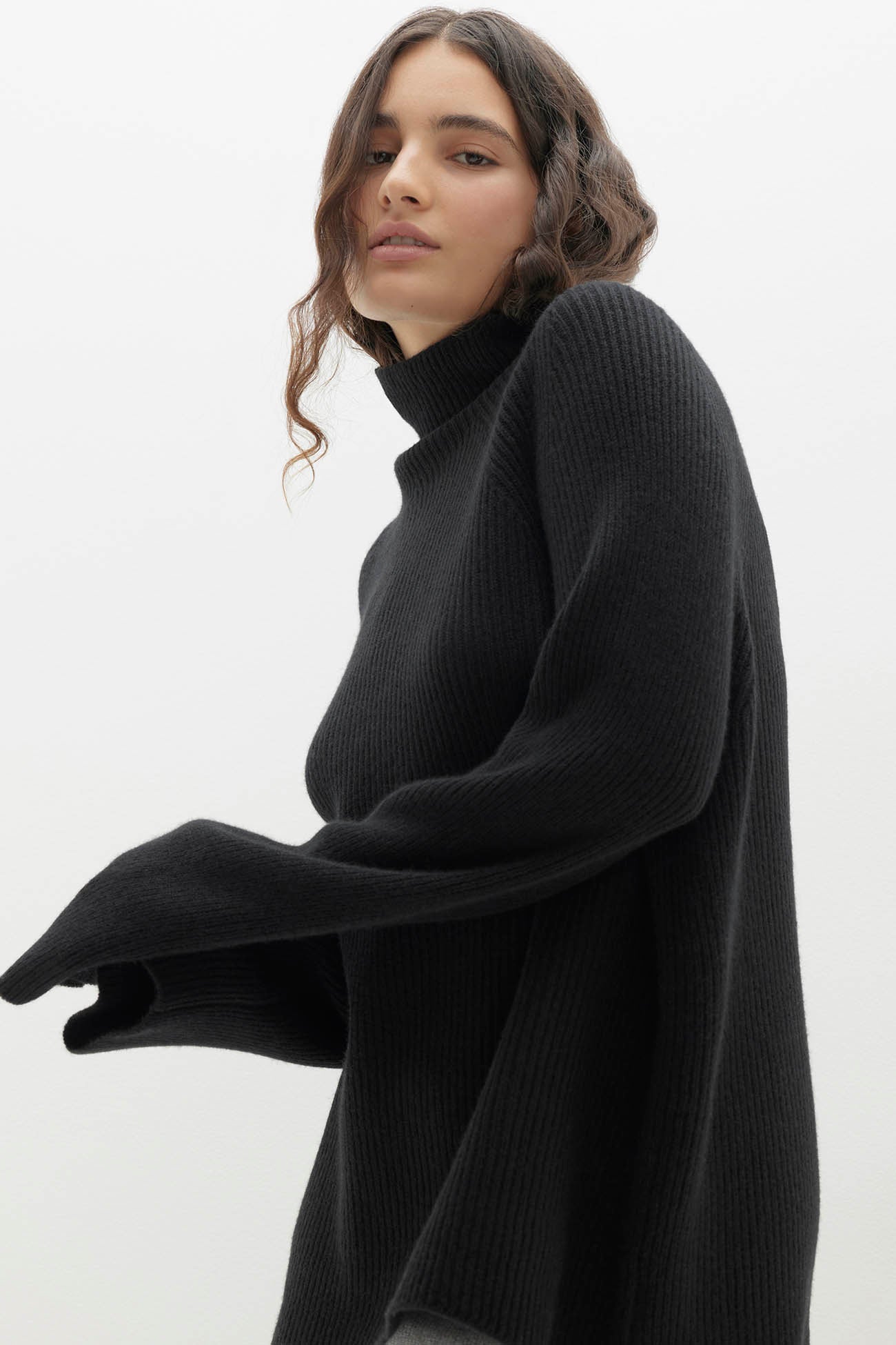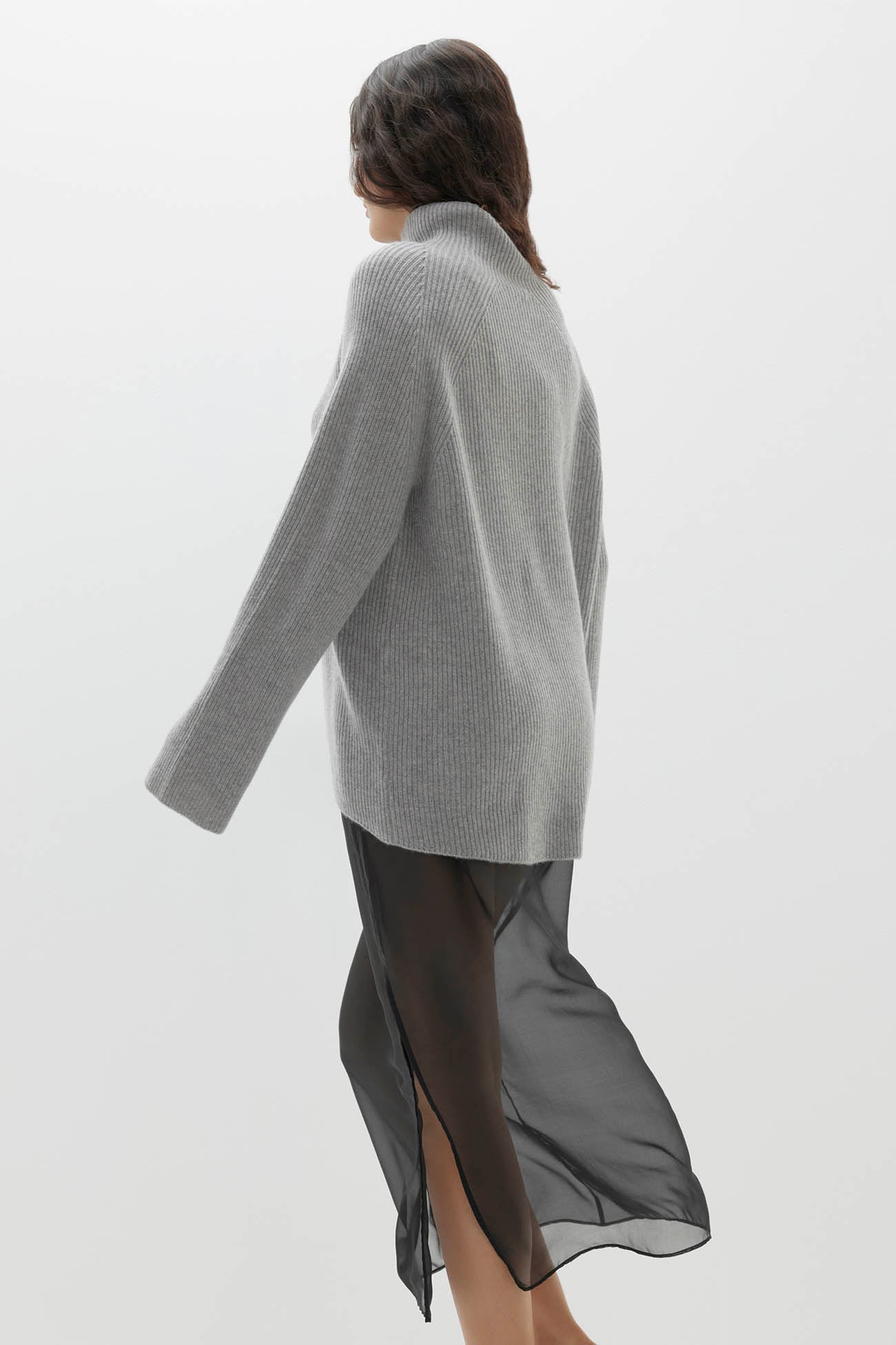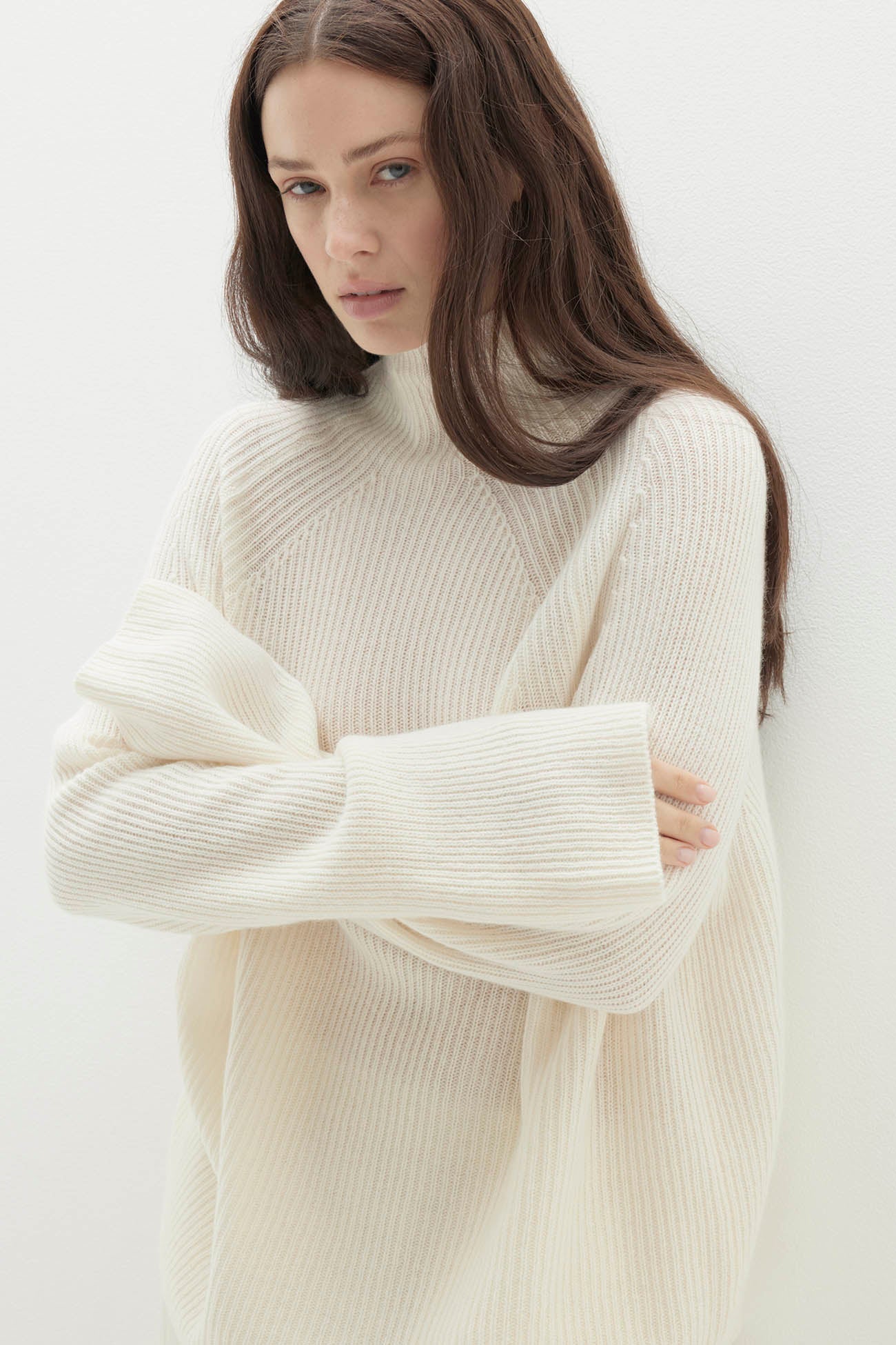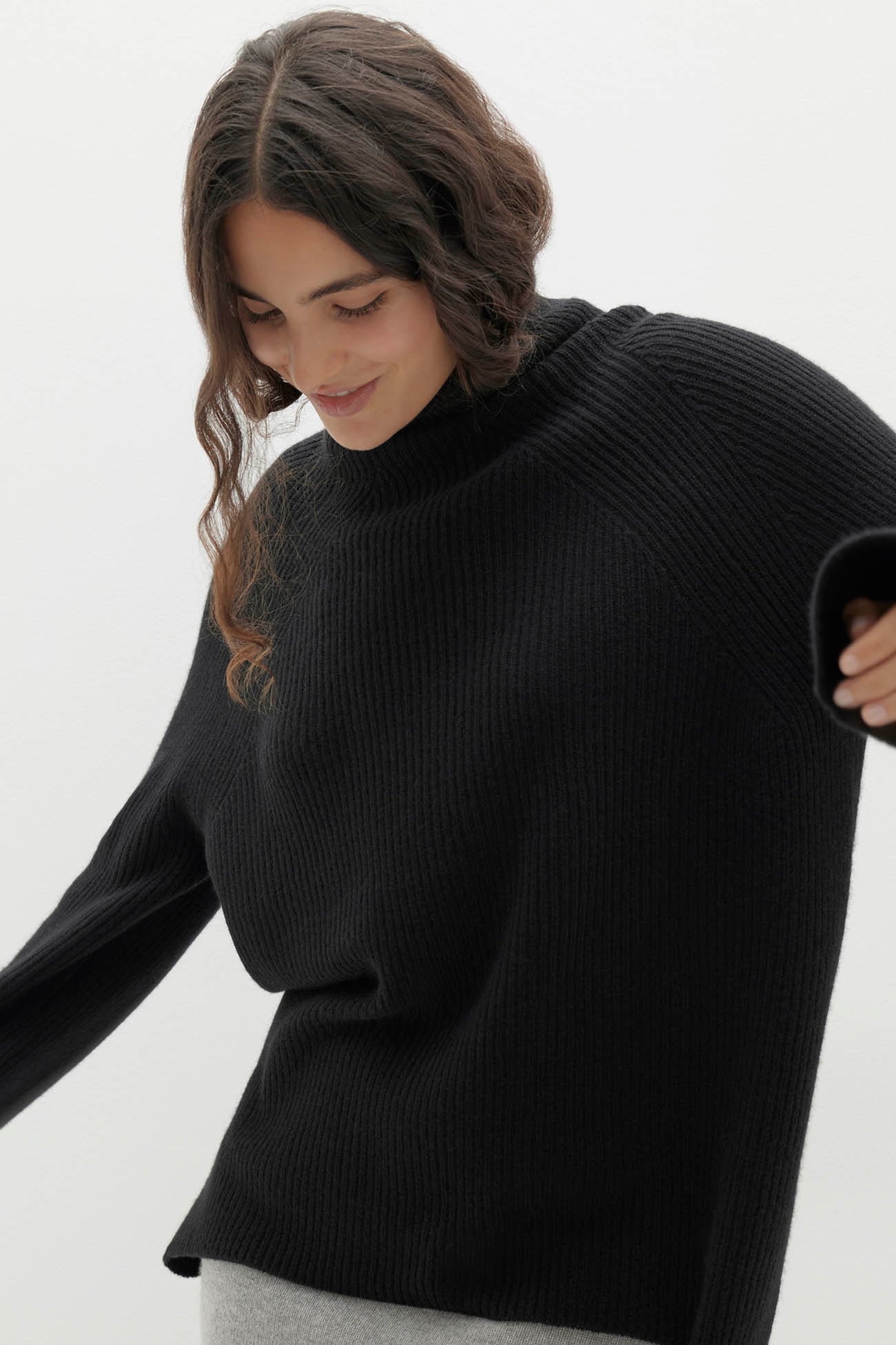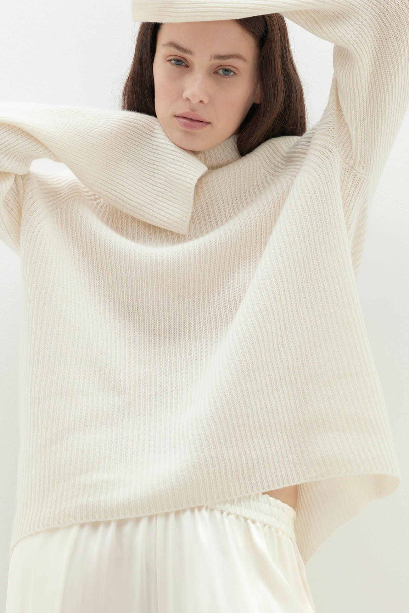 Relax in style with the Kora mock neck sweater, crafted from soft cashmere with ribbed detailing throughout. The relaxed fit makes it perfect for layering or wearing on its own for a laid-back, chic look.