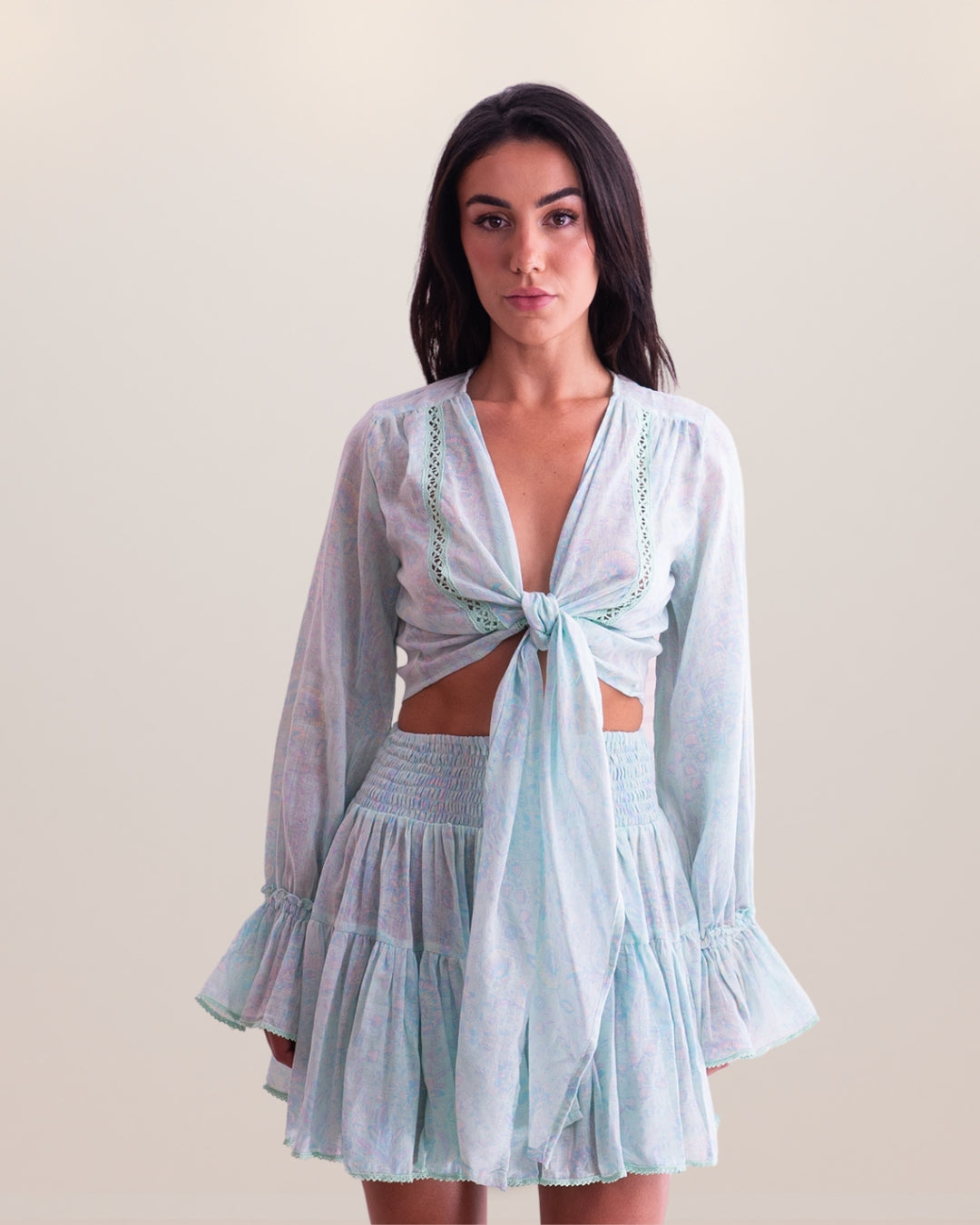 The Neo Top Lila is the ultimate summer wrap, with its versatile design that can be tied both in the front and back. Made with light and airy fabric, it is ideal for sunny days and summer evenings. Its refined and casual style, featuring puffed sleeves and cotton braids, creates a feminine silhouette when paired with the Coco Skirt. Elevate your summer wardrobe with this must-have piece.
