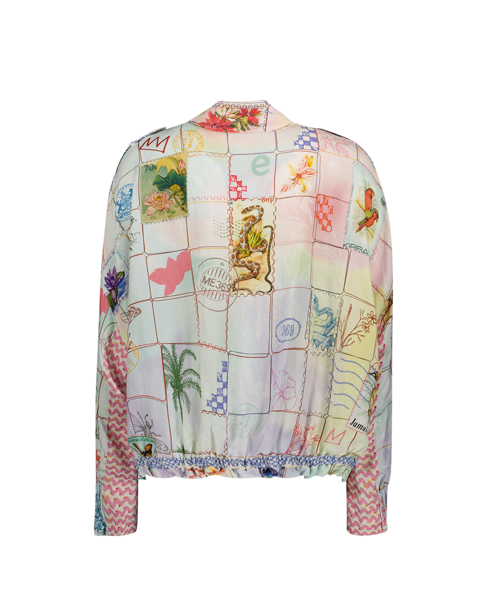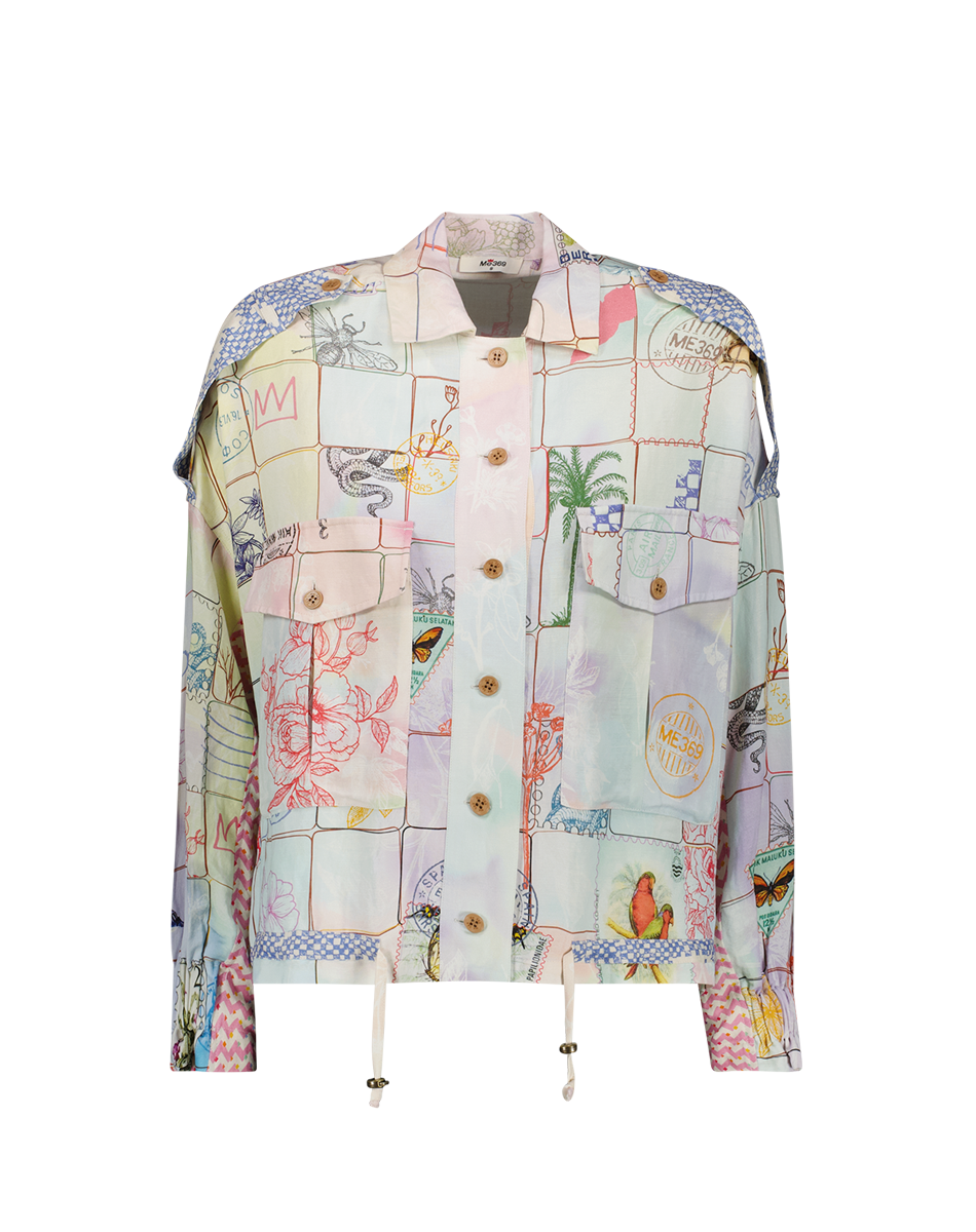 Short button down linen utility jacket with long sleeves, two pockets, shoulder epaulets and tie waist. Print is in pastels with a geometric background and features animals and plant life. Sleeves have contrasting insets.Pair with our matching pants for a complete eye catching look.