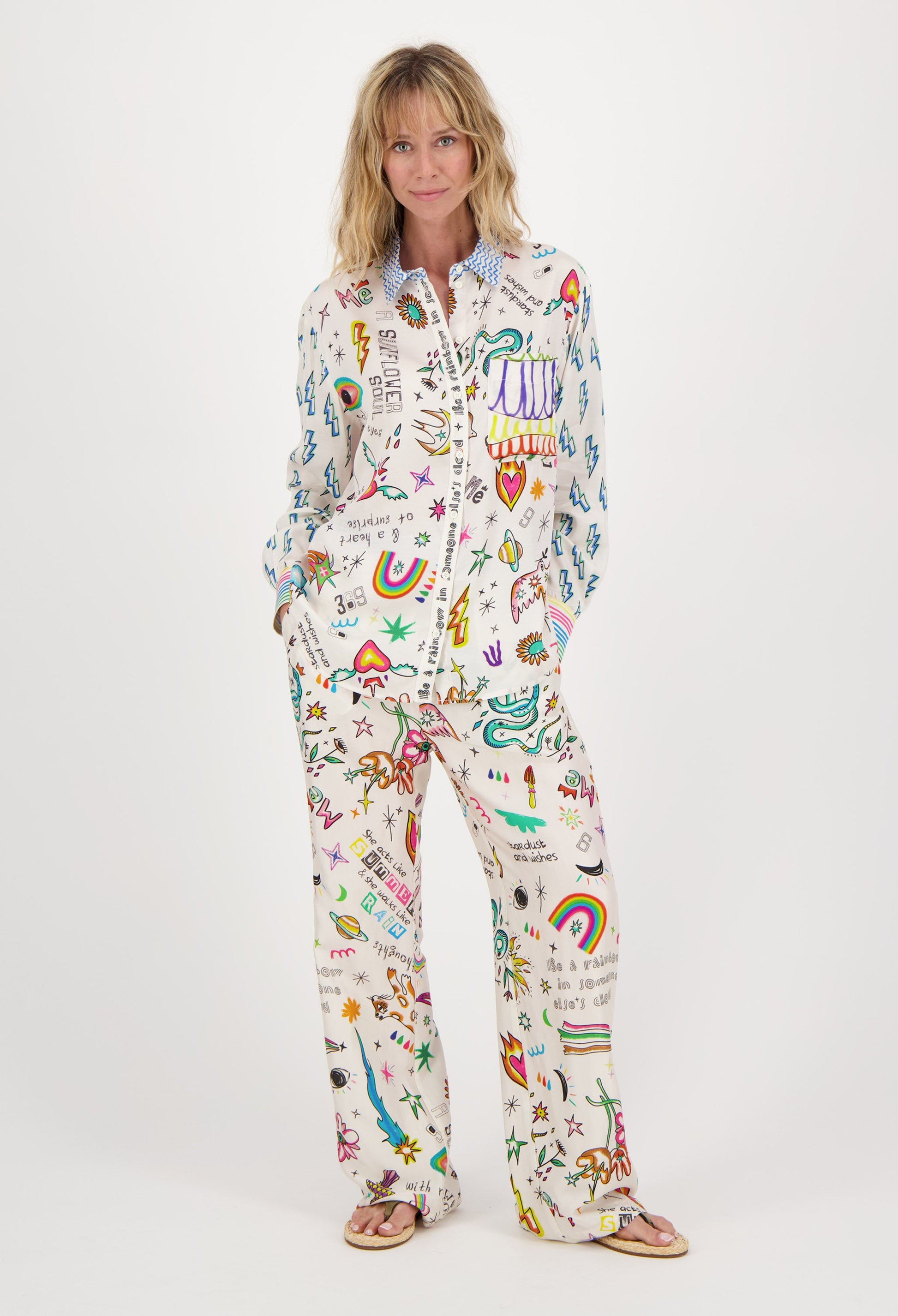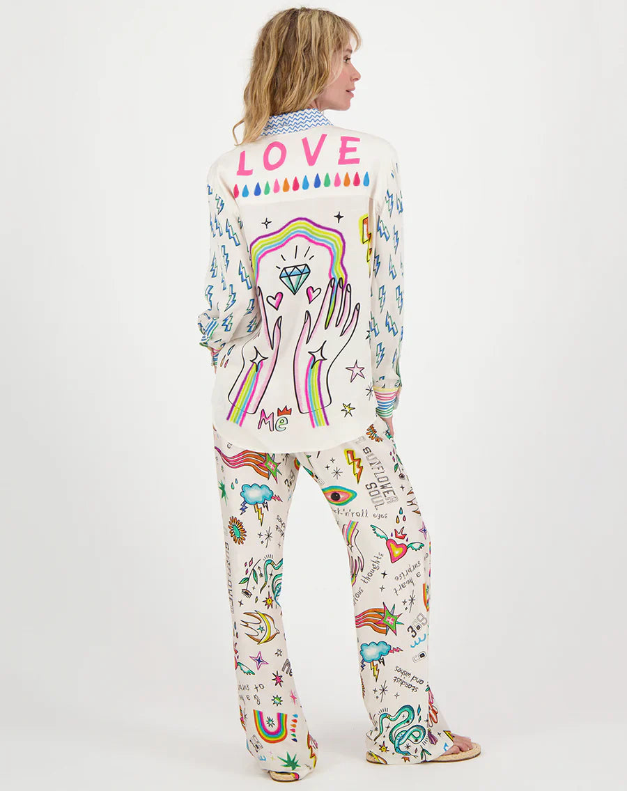 100% Viscose long sleeve shirt in our ENLIGHTENMENT pattern. Collar, cuffs, sleeves and body of shirt, both front and back, are all represented by different Enlightenment patterns. Shirt reads “LOVE” across back. Pair with our matching pants for a vibrant, fun look