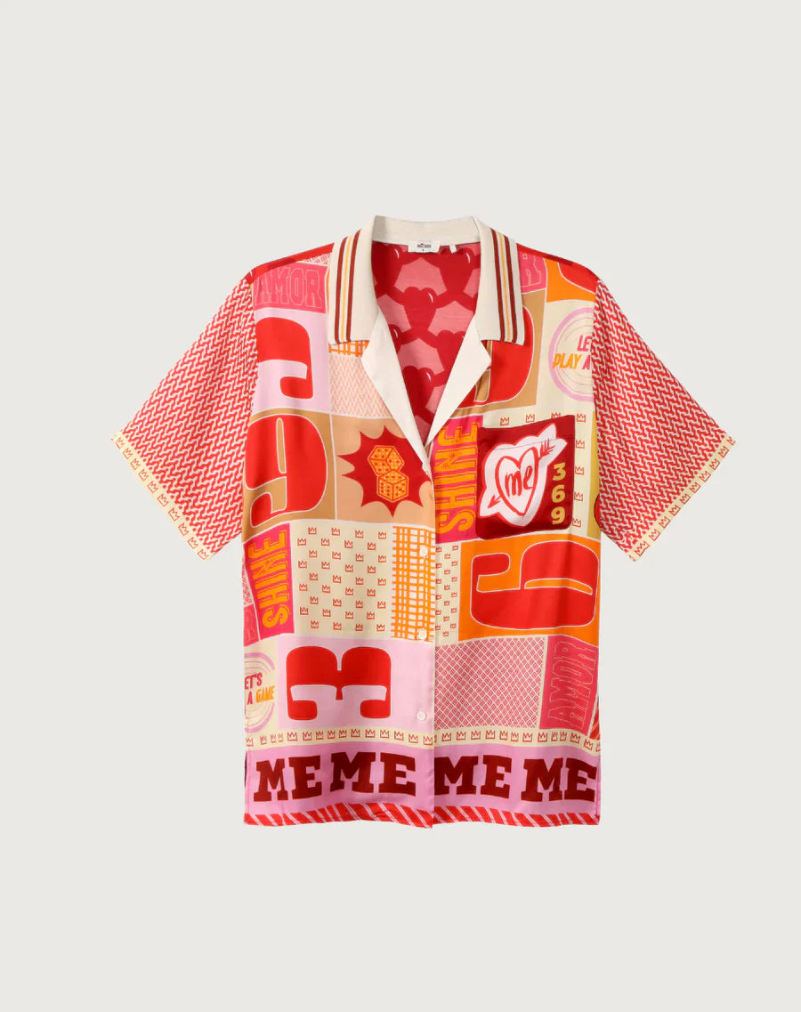 100% Viscose short sleeve knit collar shirt in our Lucky Me pattern. Button down.Body of shirt and sleeves are in different Lucky Me patterns. Shirt reads “ME” along the hemline. Pair with our matching shorts for a retro glamour look.
