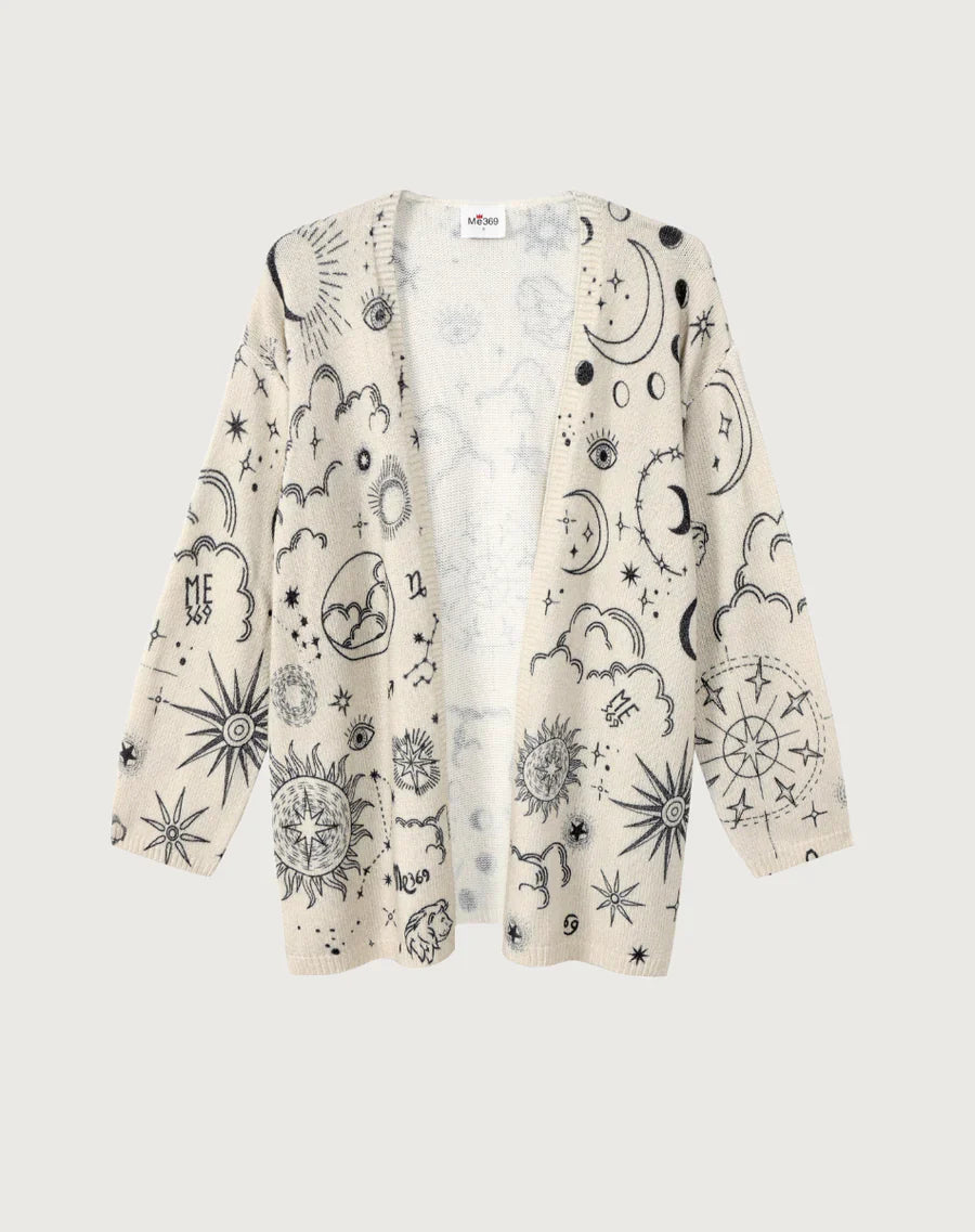 Blend long sleeve open cardigan in our Zodiak print. Cardigan covers the hips. Pair with other zodiac pieces for a cosmic look.