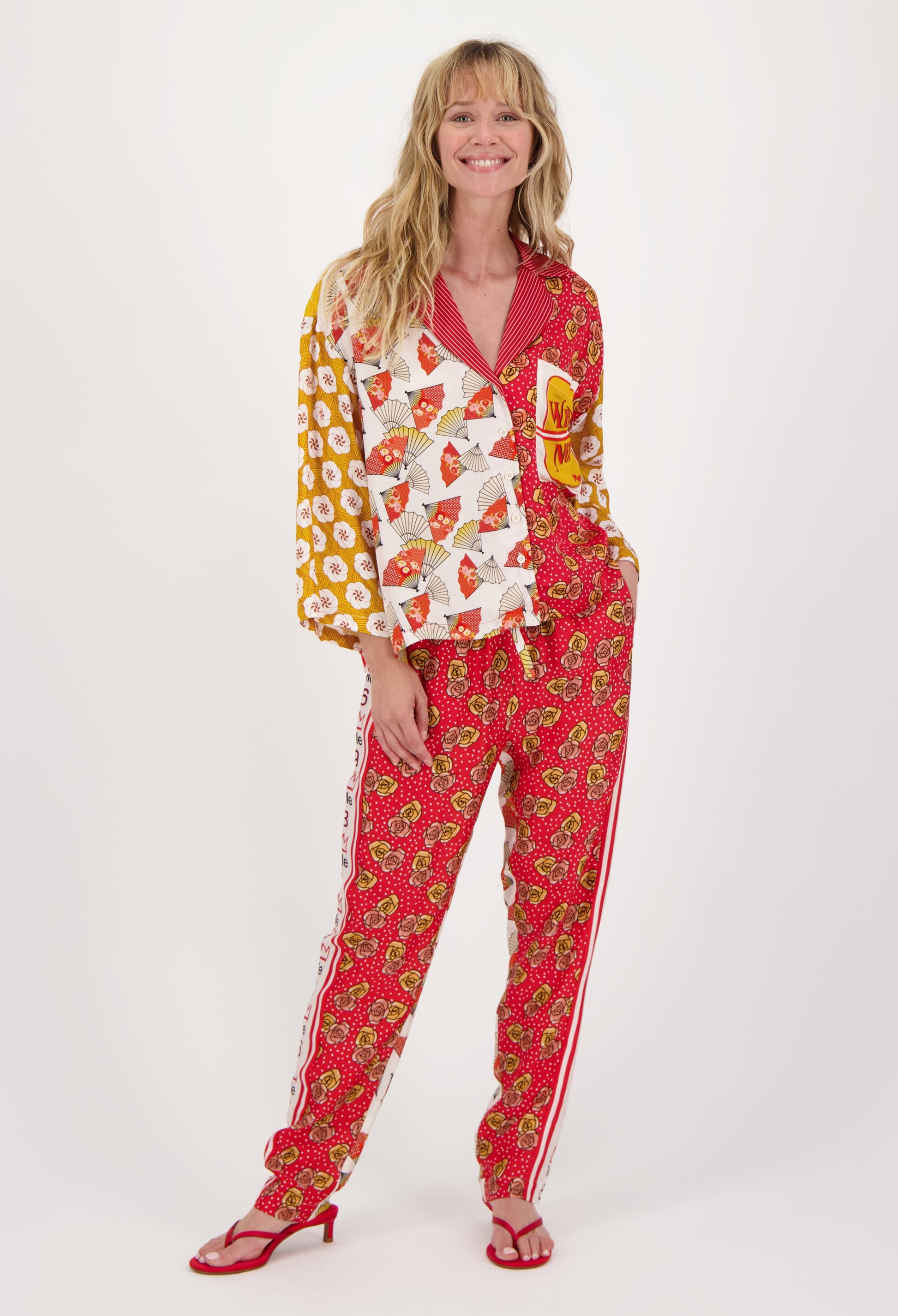 100% Viscose button down long sleeve shirt. Fun patterns. Sleeves are a bit wide without cuffs. Front is shorter than back. Pair with our matching shorts for a breezy, fun look.