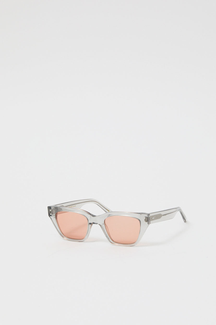 Bold orange-tinted sunglasses set in a transparent grey acetate frame. Classic shape with a touch of drama. Hand-crafted with anti-scratch and anti-reflective lenses. 100% UVA/UVB protection.