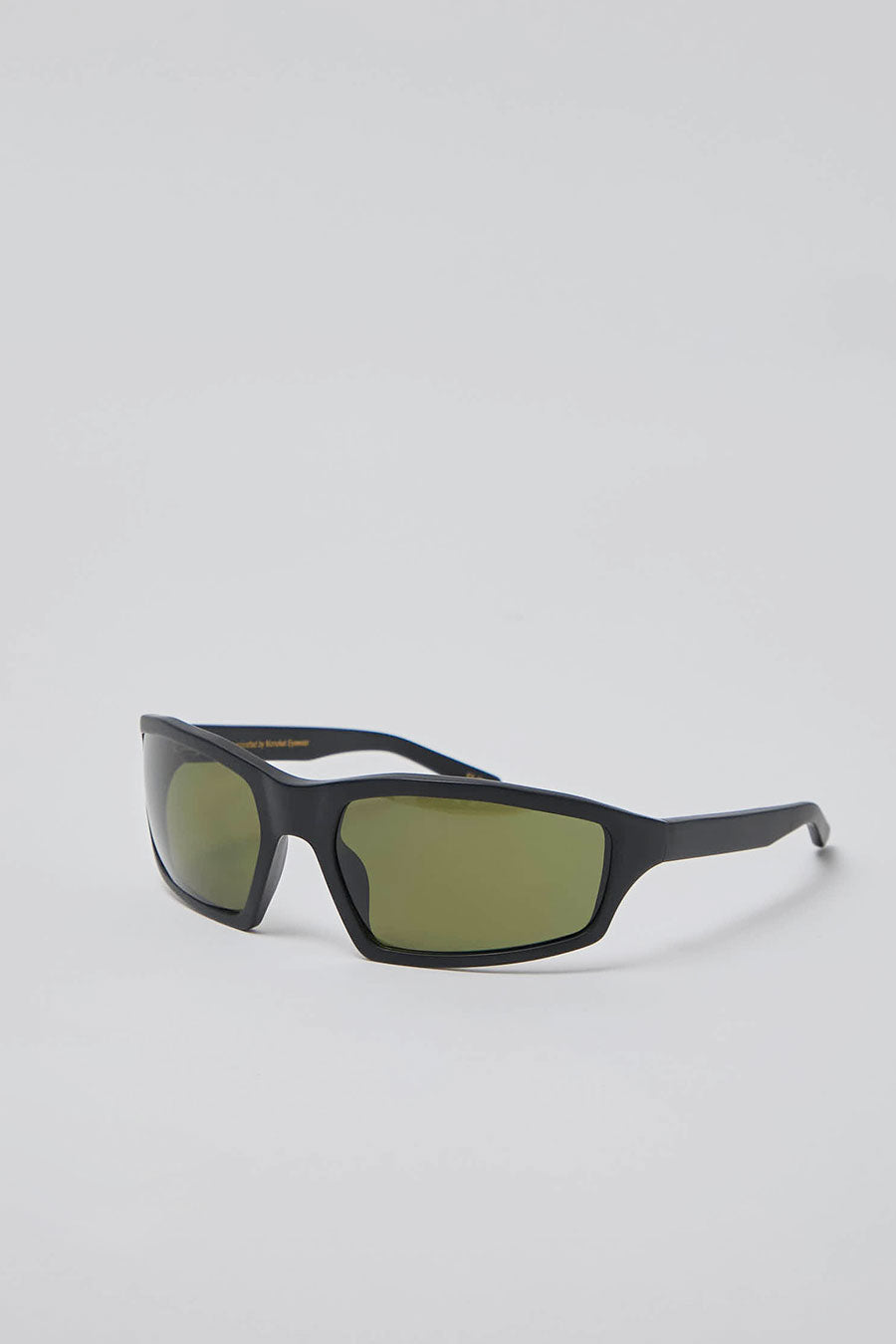 Sporty green-tinted sunglasses in a matte black acetate frame. Hand-crafted with anti-scratch and anti-reflective lenses. 100% UVA/UVB protection.