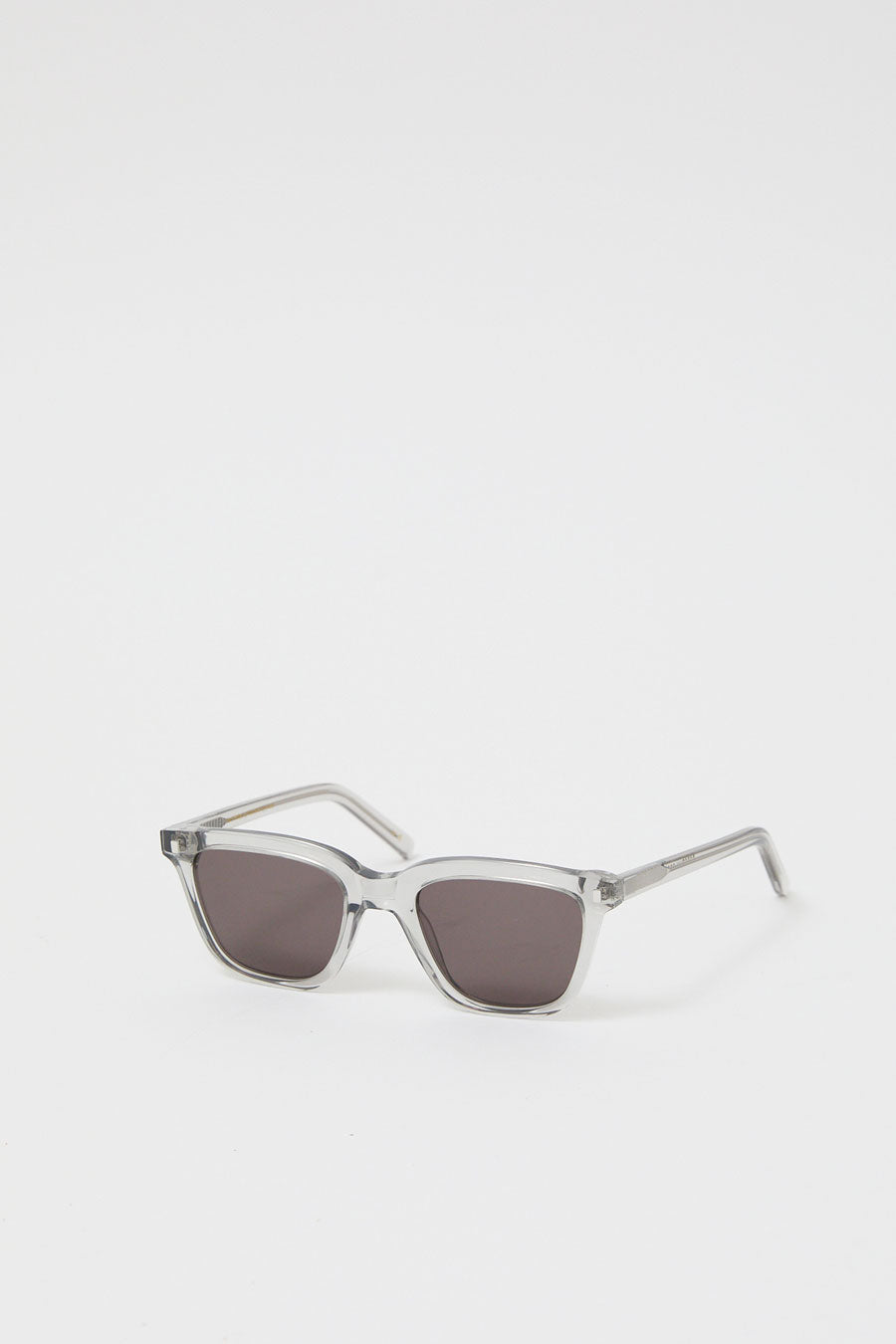 Classic rectangular sunglasses set in a transparent grey acetate frame. Sophisticated, slender, and stylish. Hand-crafted with anti-scratch and anti-reflective lenses. 100% UVA/UVB protection.