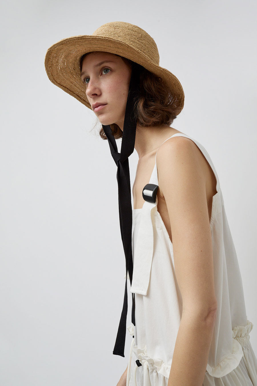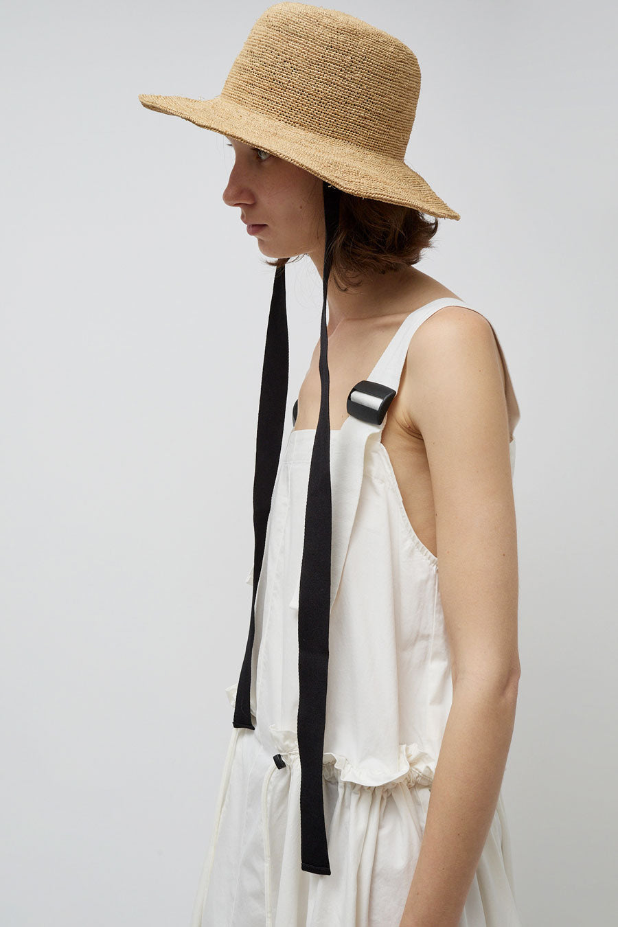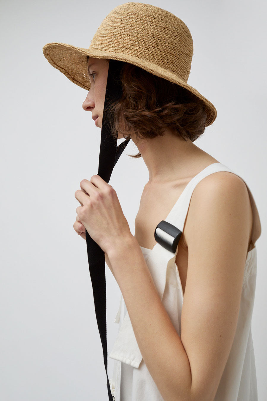 Raffia fisherman's hat with long cotton ties. Bendable, wire-threaded brim for structure and shape. Easily packs.