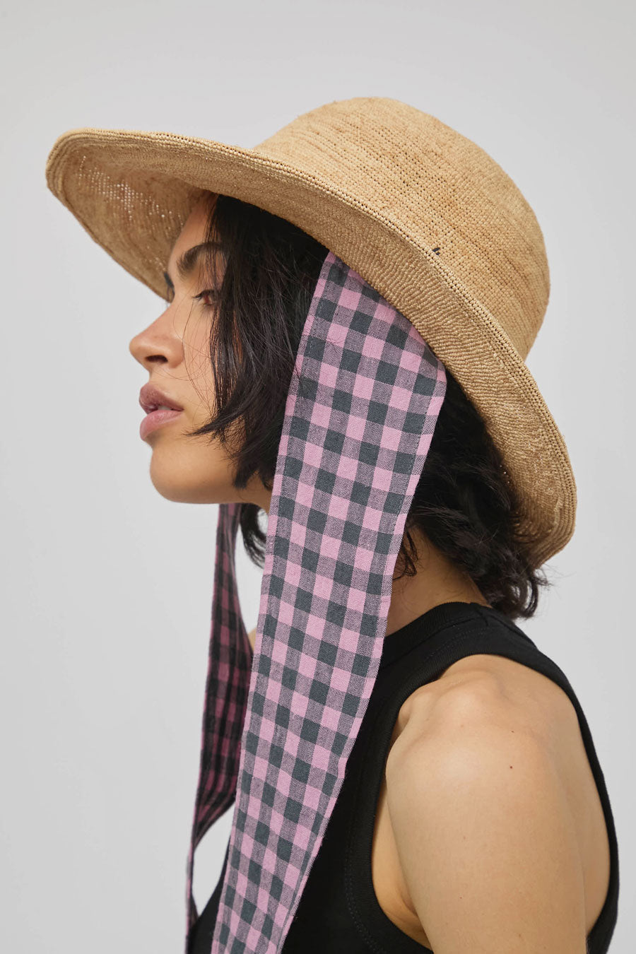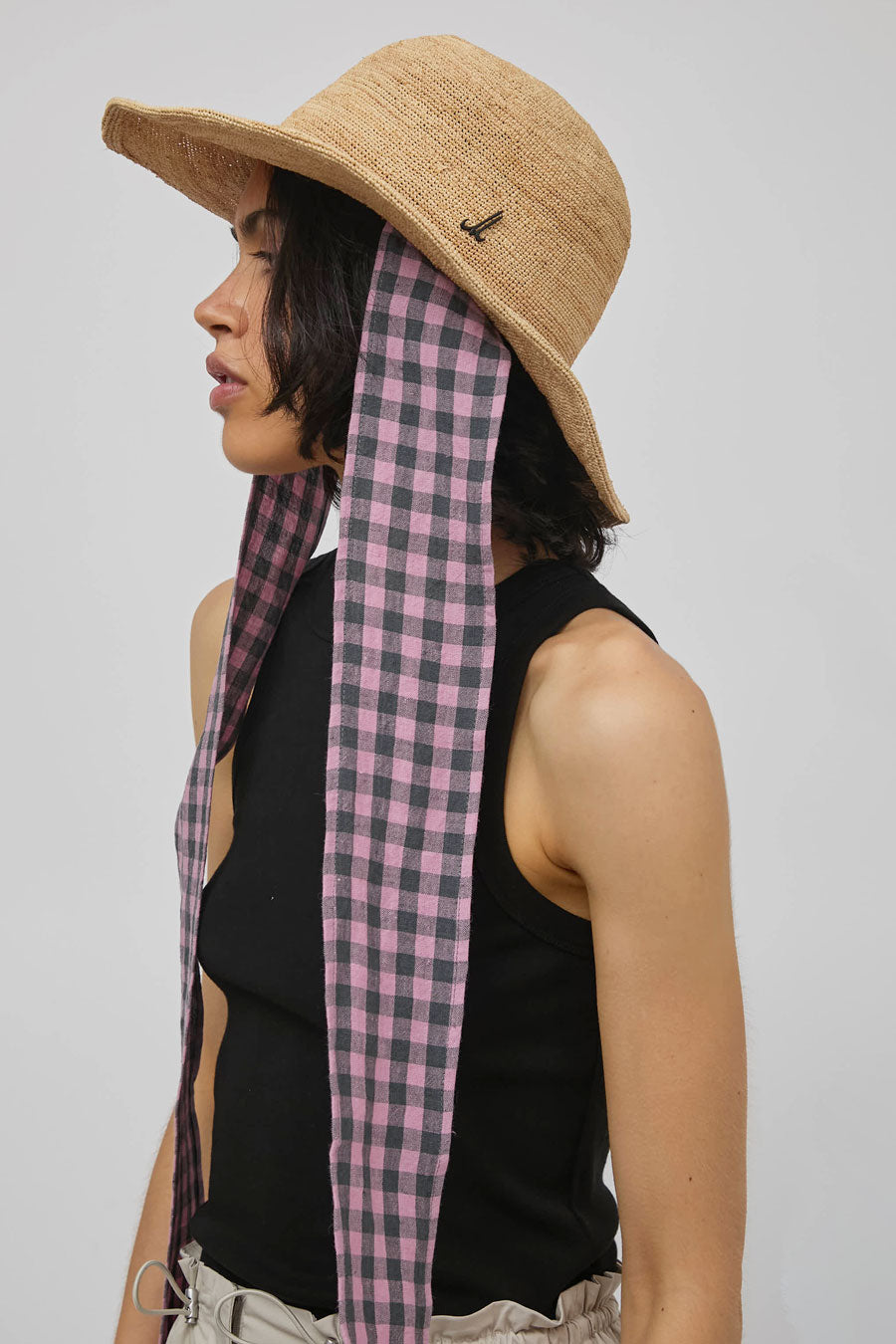 Raffia fisherman's hat with long cotton ties. Bendable, wire-threaded brim for structure and shape. Easily packs.