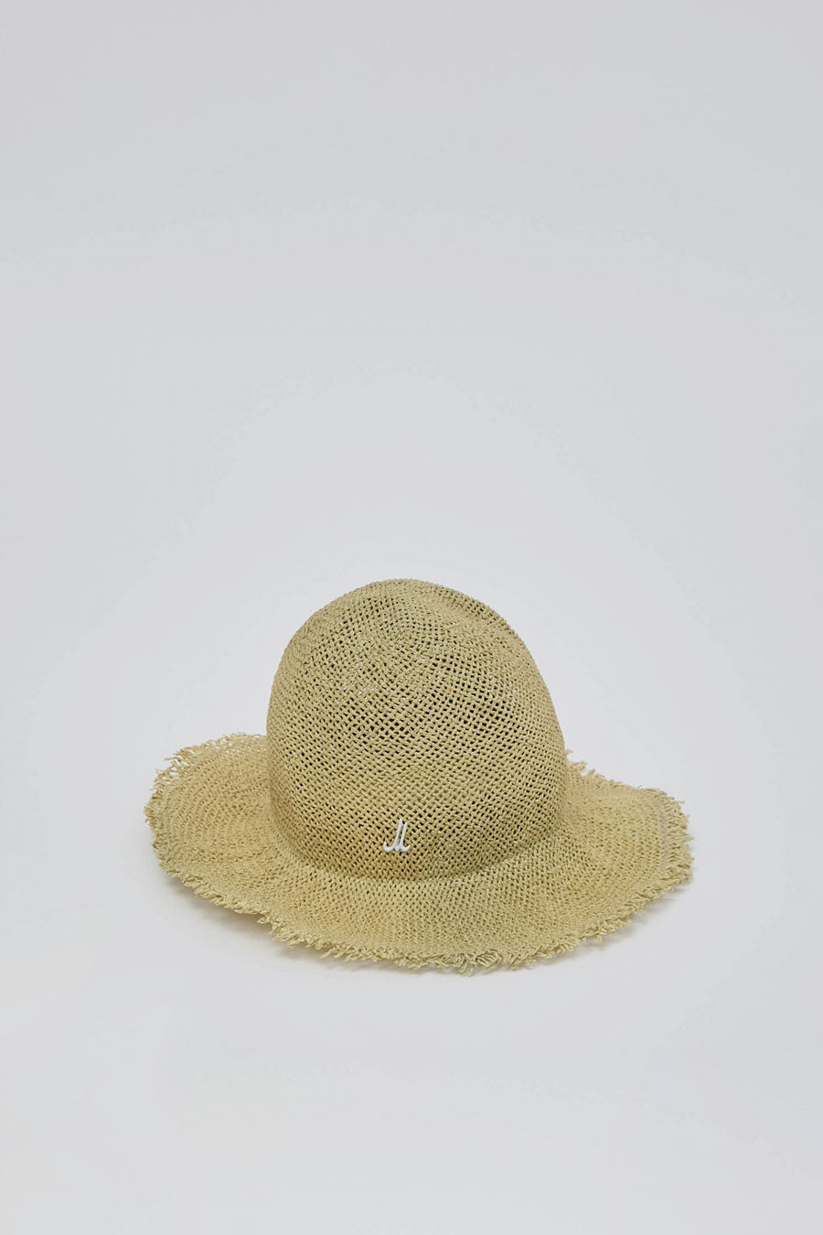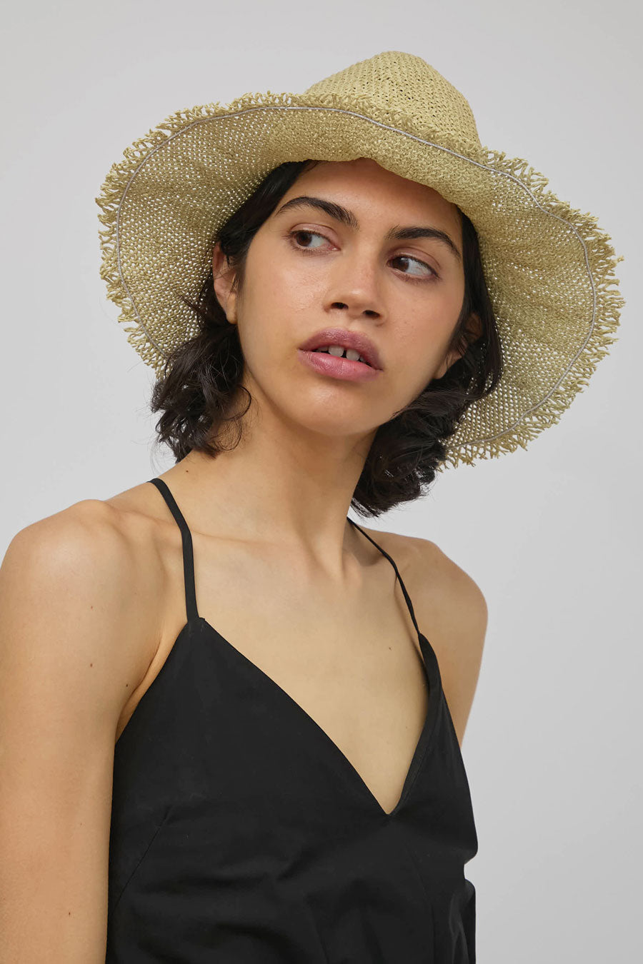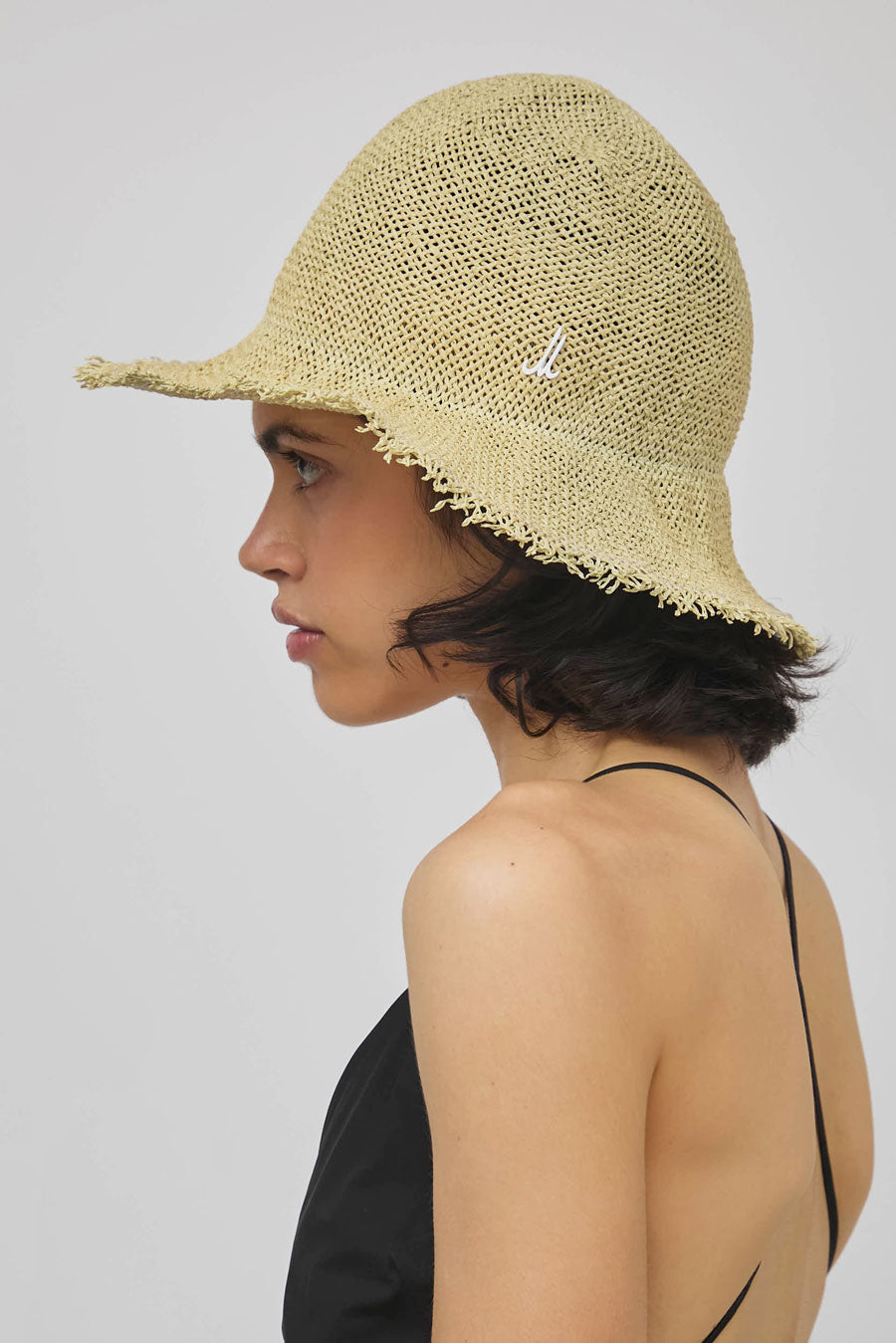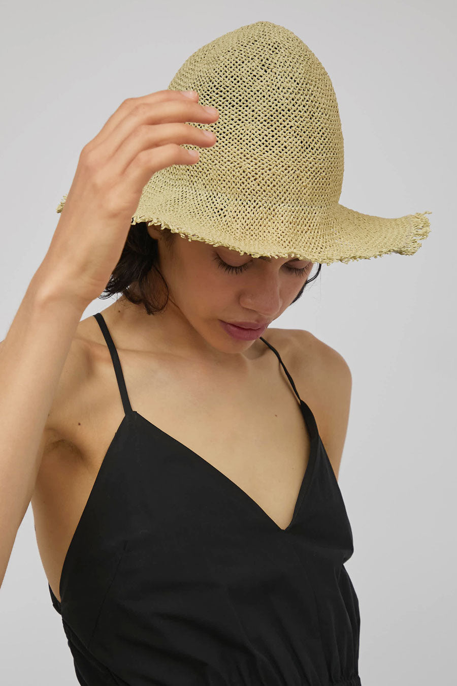 Bell-shaped, wide-brimmed hat in soft paper raffia.