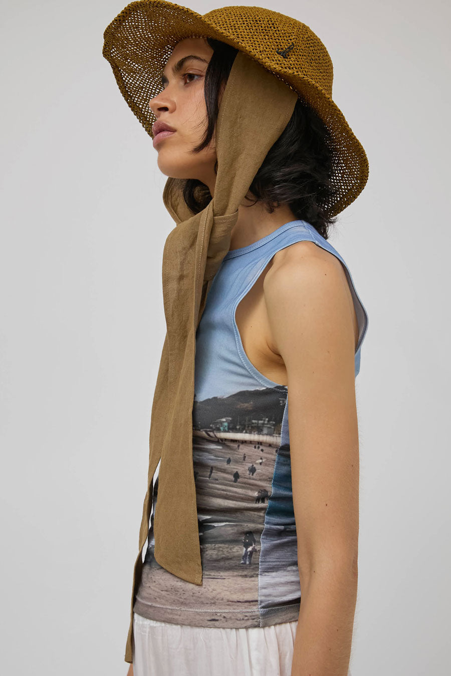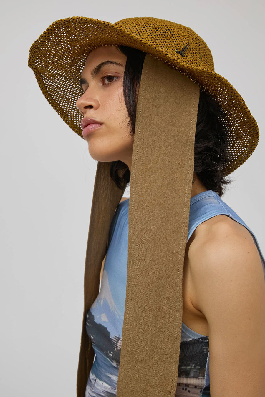 Woven traveller hat with long, wide, linen ties. An outside-of-the-box summer accessory.