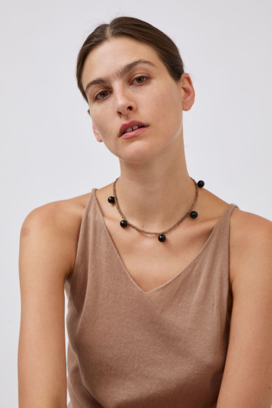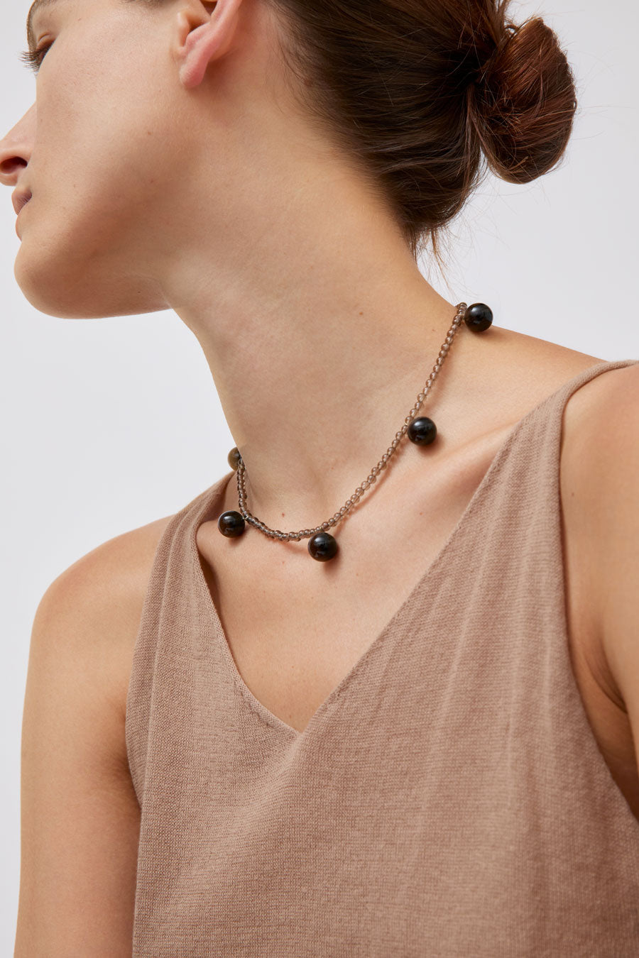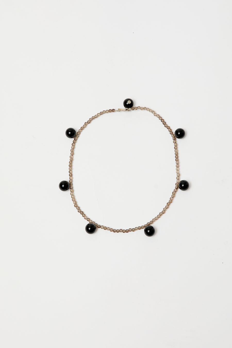 Necklace beaded with smoky quartz and onyx spheres. Sterling silver closure. Handcrafted in Vienna, the designer's homage to H2O.