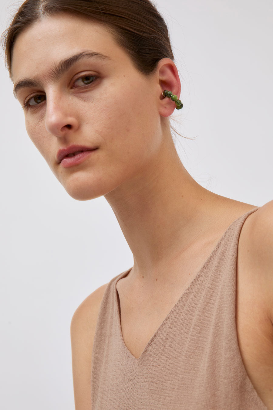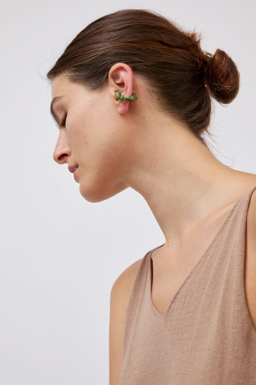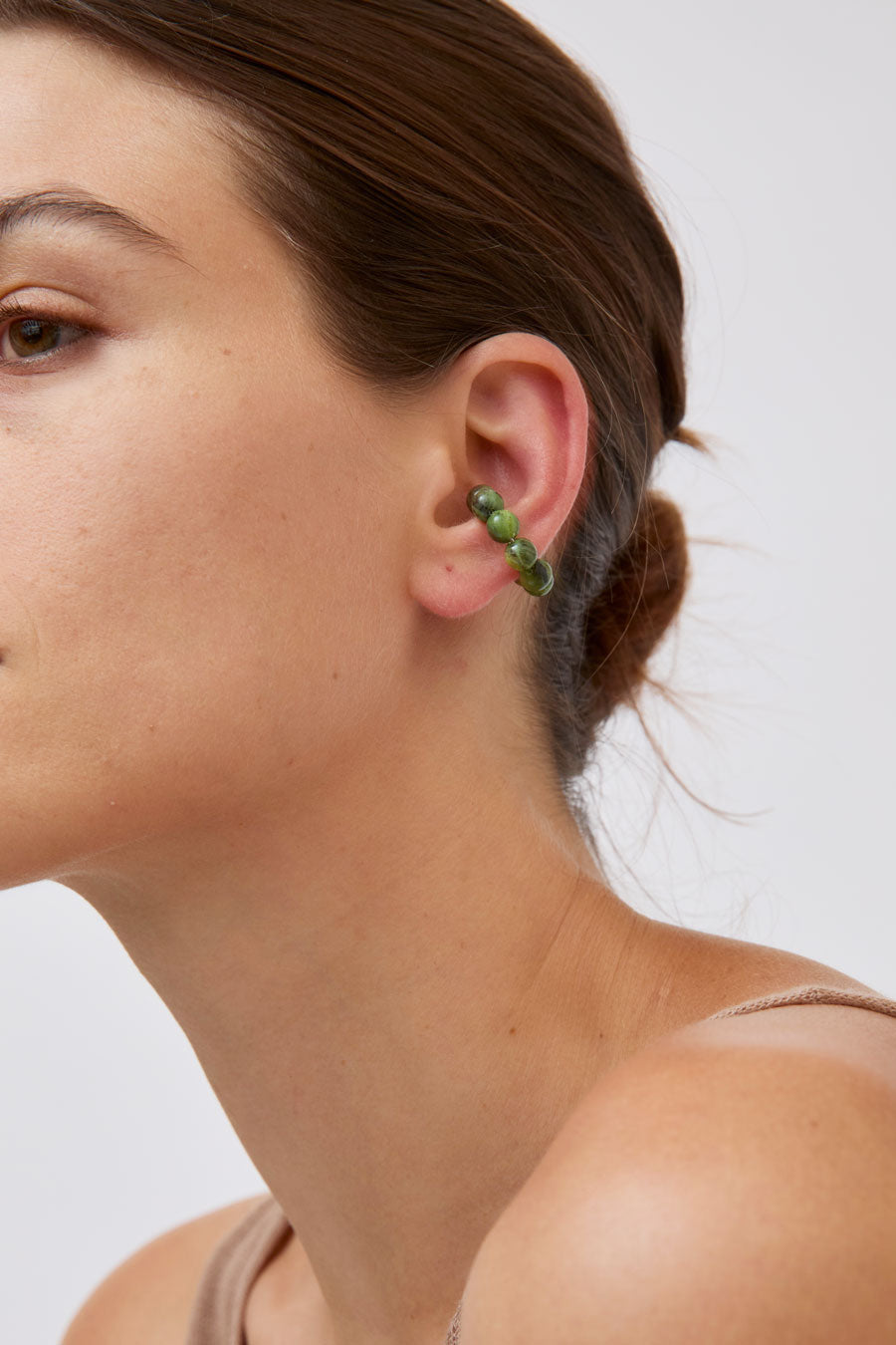 Piercing-free ear cuff beaded with jade spheres. Handcrafted in Vienna.