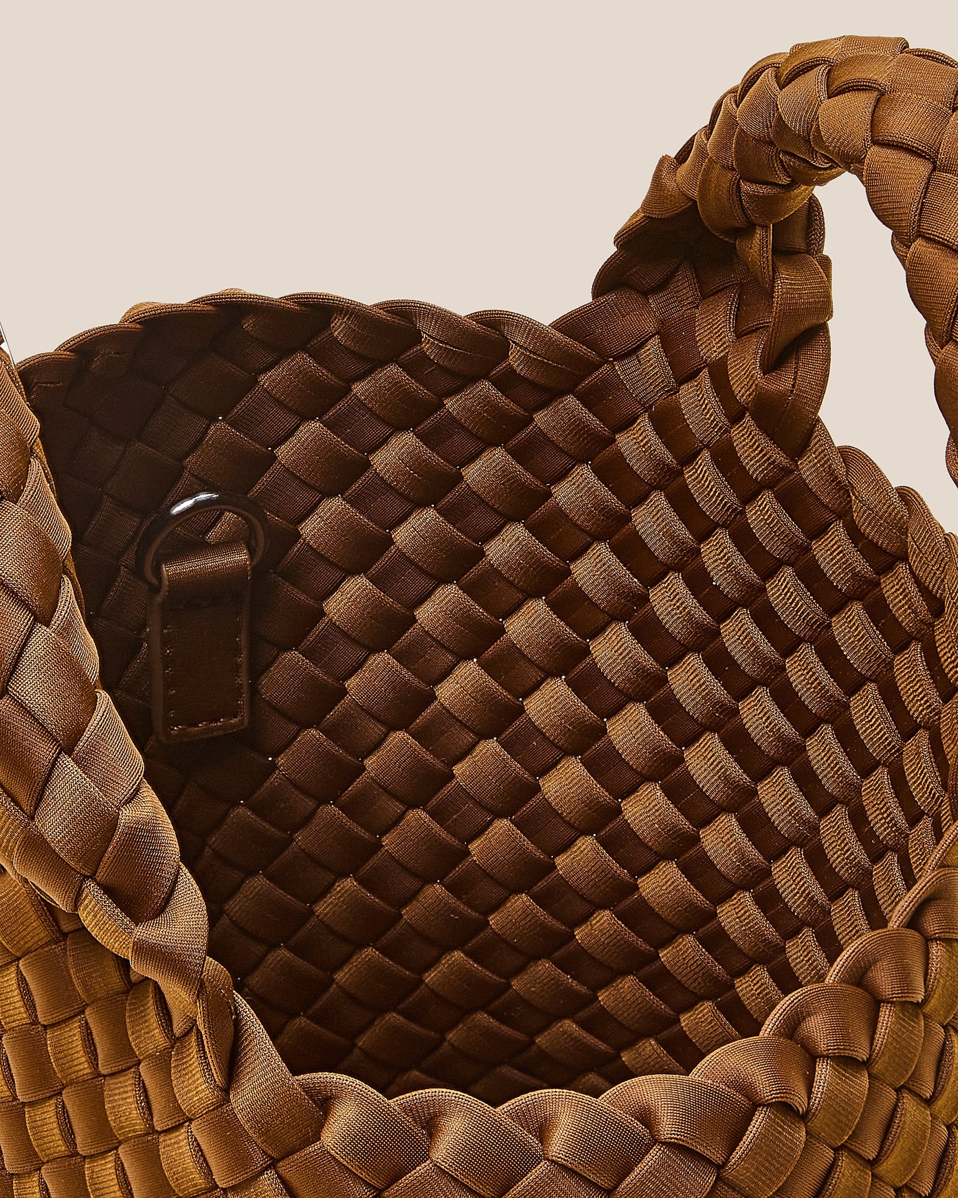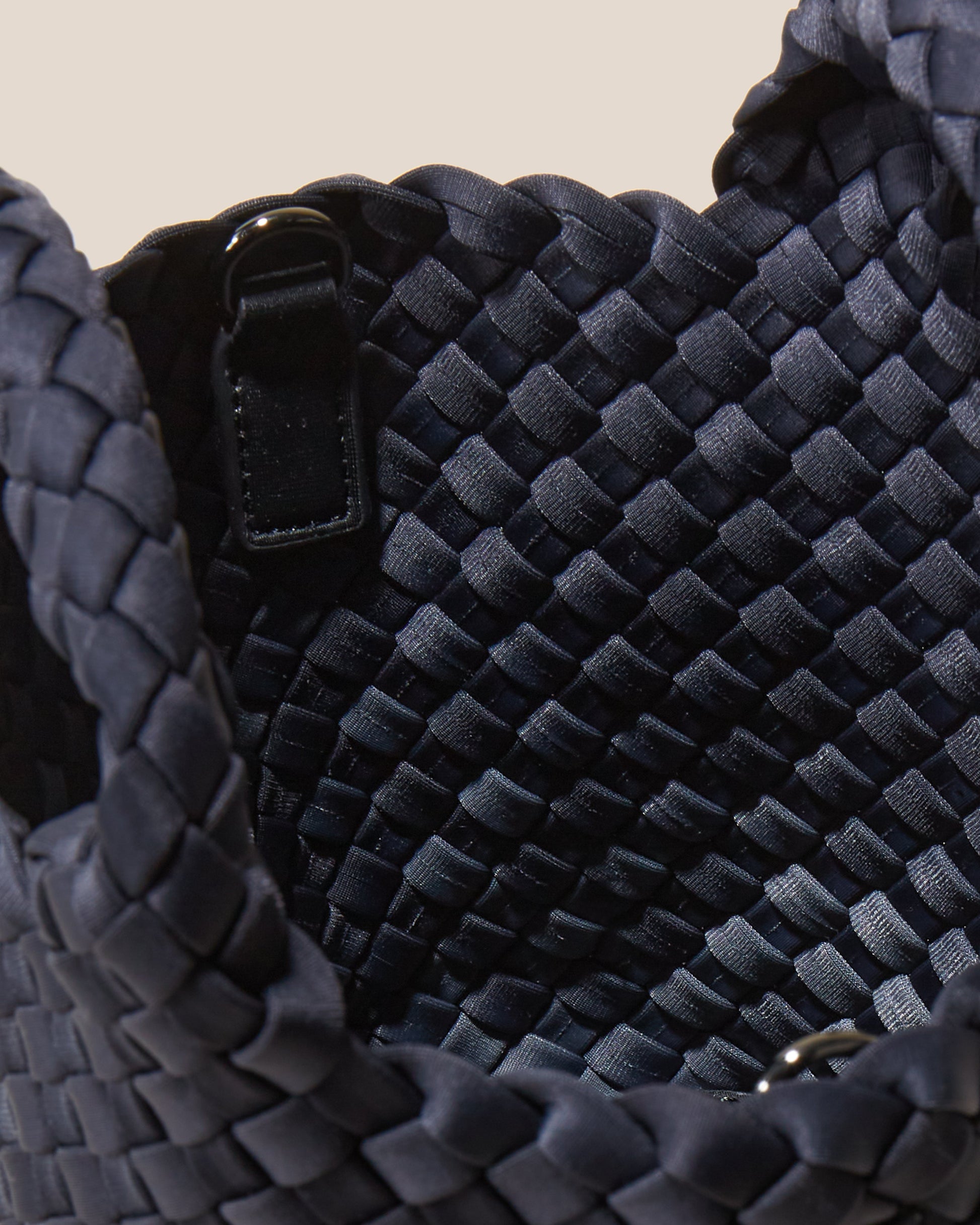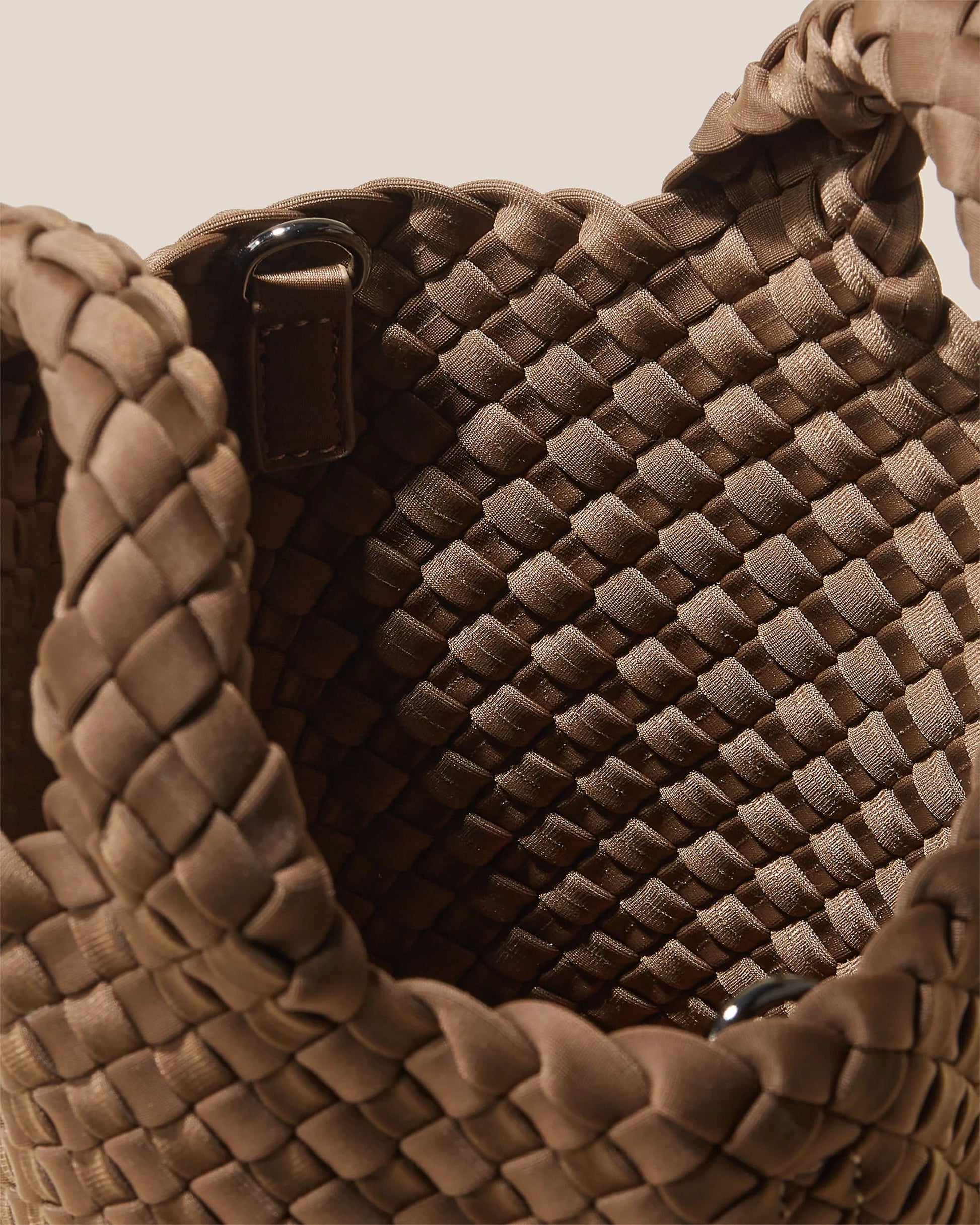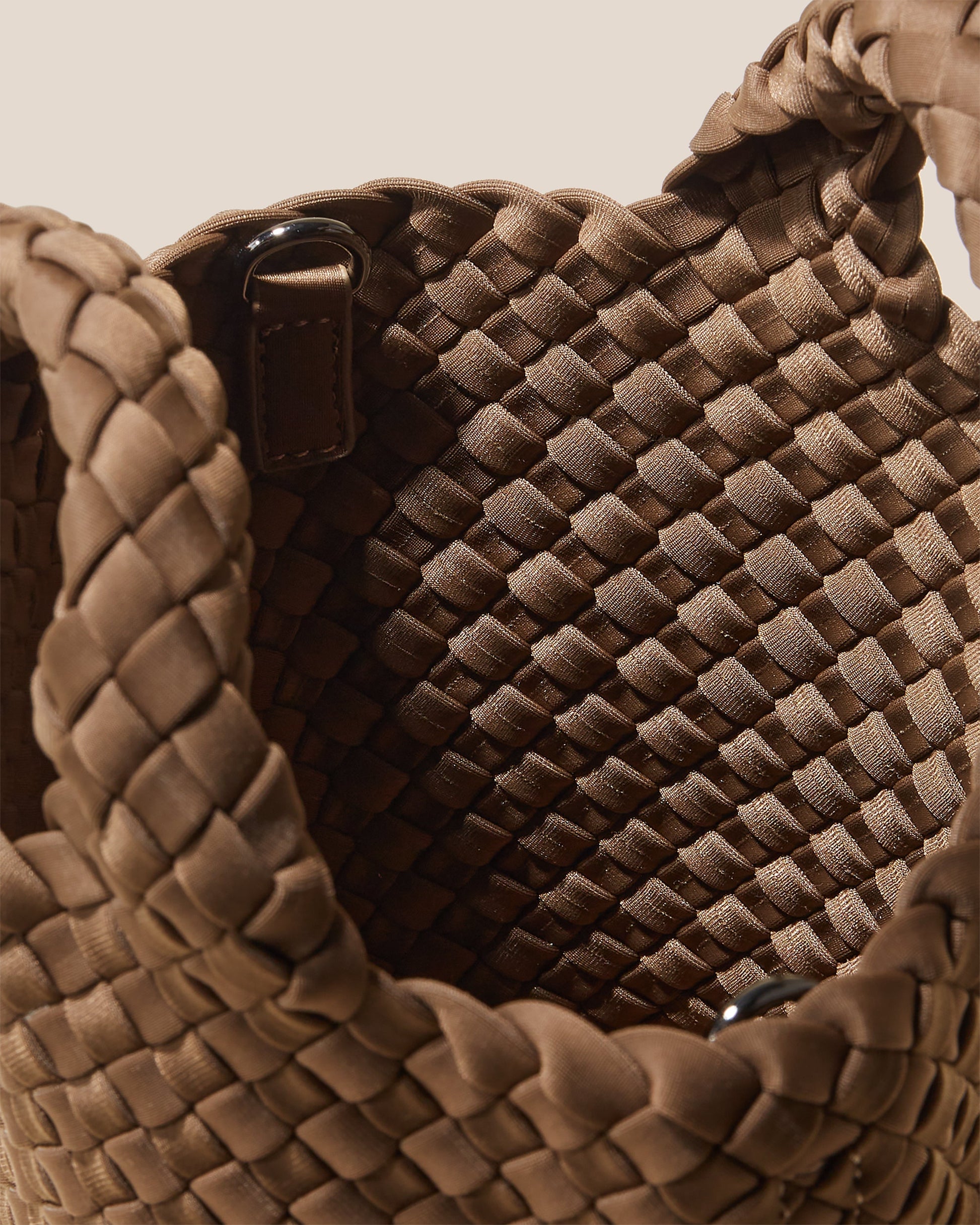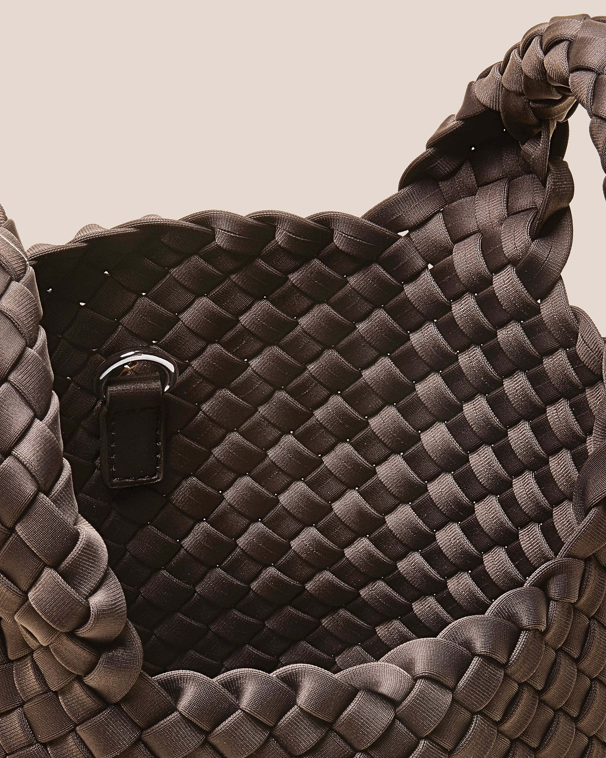 Handwoven neoprene in dark chocolate brown. The St. Barths Petit Tote transitions seamlessly from daytime to evening, carrying all your essentials comfortably.
