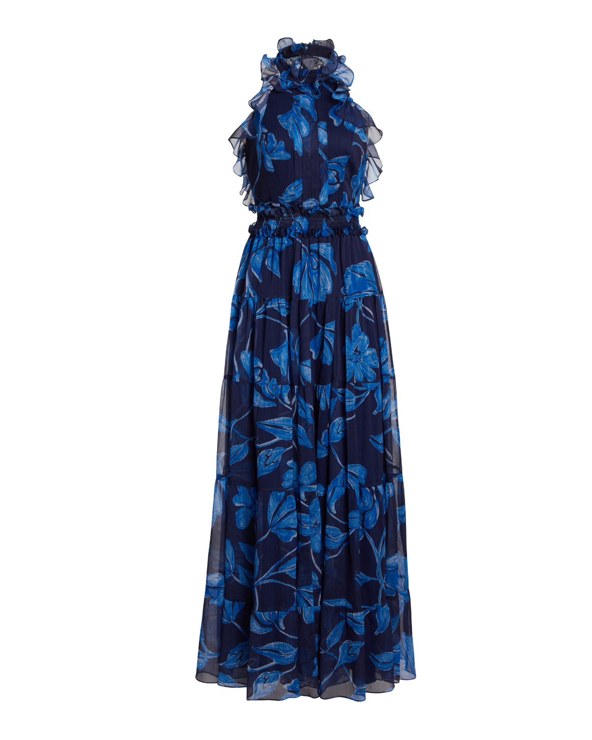 Flowy, floor-grazing open back maxi dress dress features ruffle detail. High neck. Concealed back zipper. Runs true to size. Model wears a size 4.