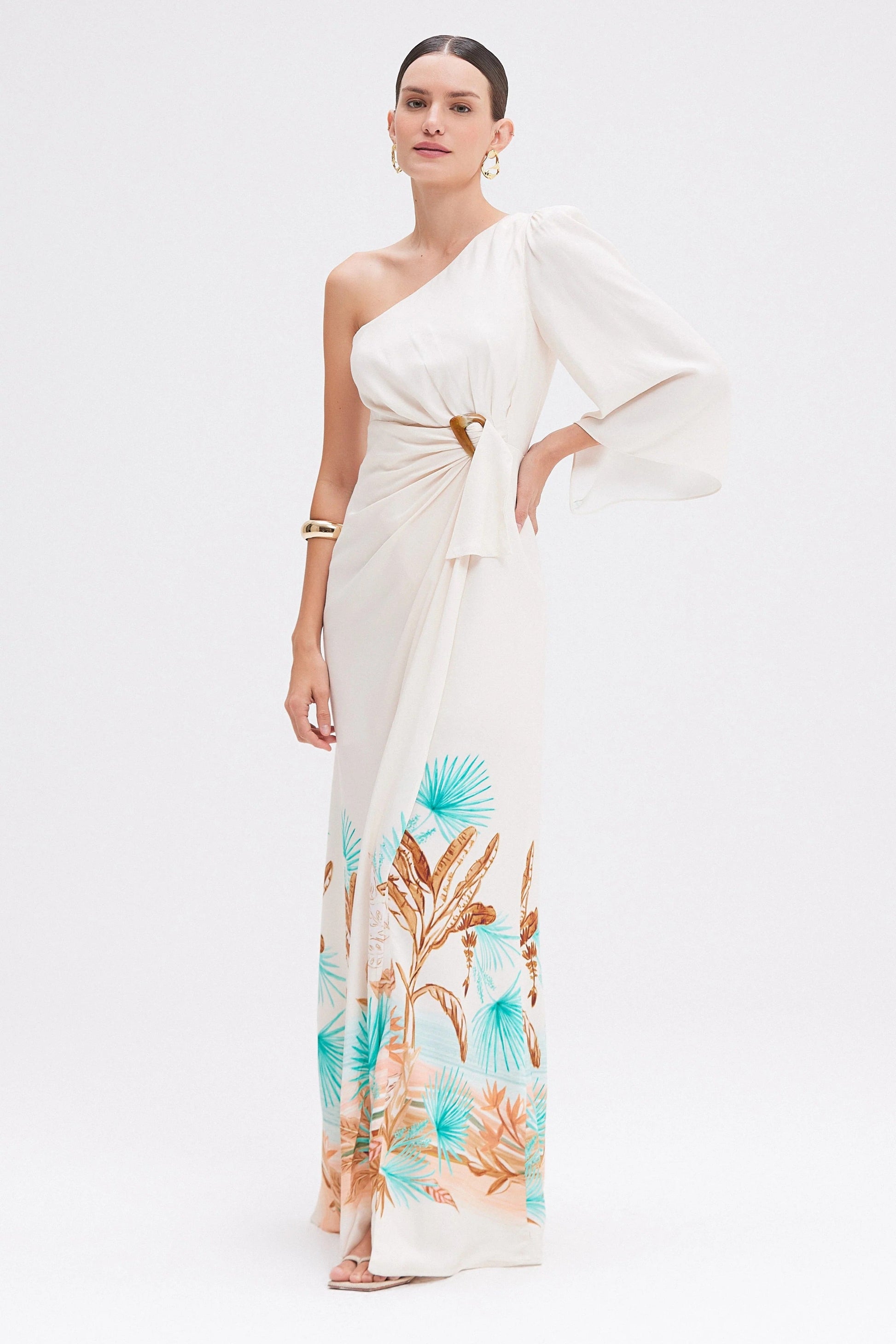 The Bananeira Tropical One Shoulder Maxi Dress brings breezy sophistication to any occasion. With a lightweight feel, it features a one-shoulder neckline, flowy sleeve, and a draped waist accented by a statement ring. Model wears size 4.