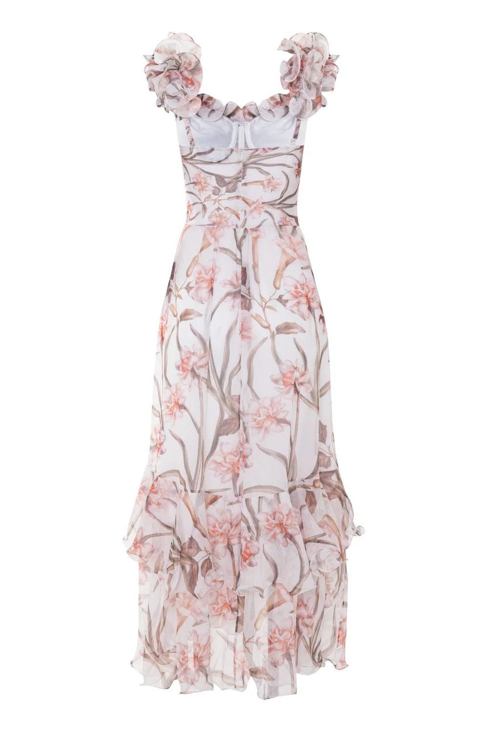 This flowy midi dress is pure romance, with soft floral prints and delicate ruffle details that move with every step. The sweetheart neckline and gathered bodice flatter the figure, while the high slit adds a touch of flirtation. Perfect for garden parties, beach weddings, or golden-hour strolls along the coast.
