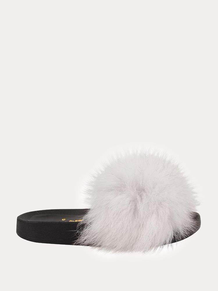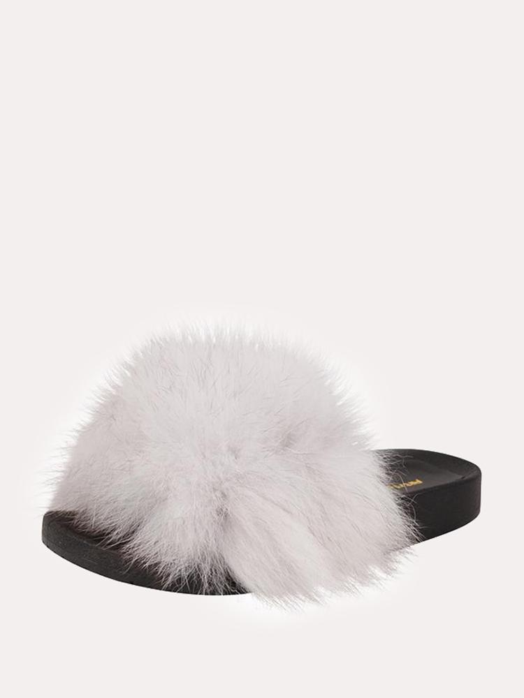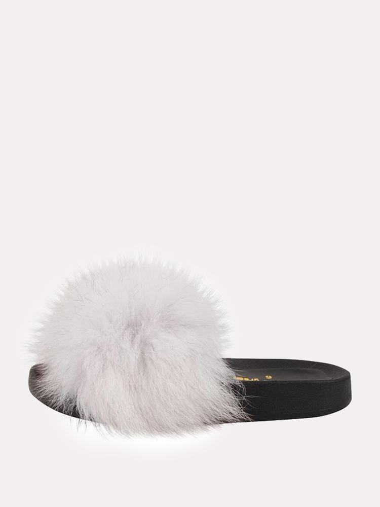Slide sandals featuring a fanciful multicolor fox fur strap, open toe, and a molded insole.