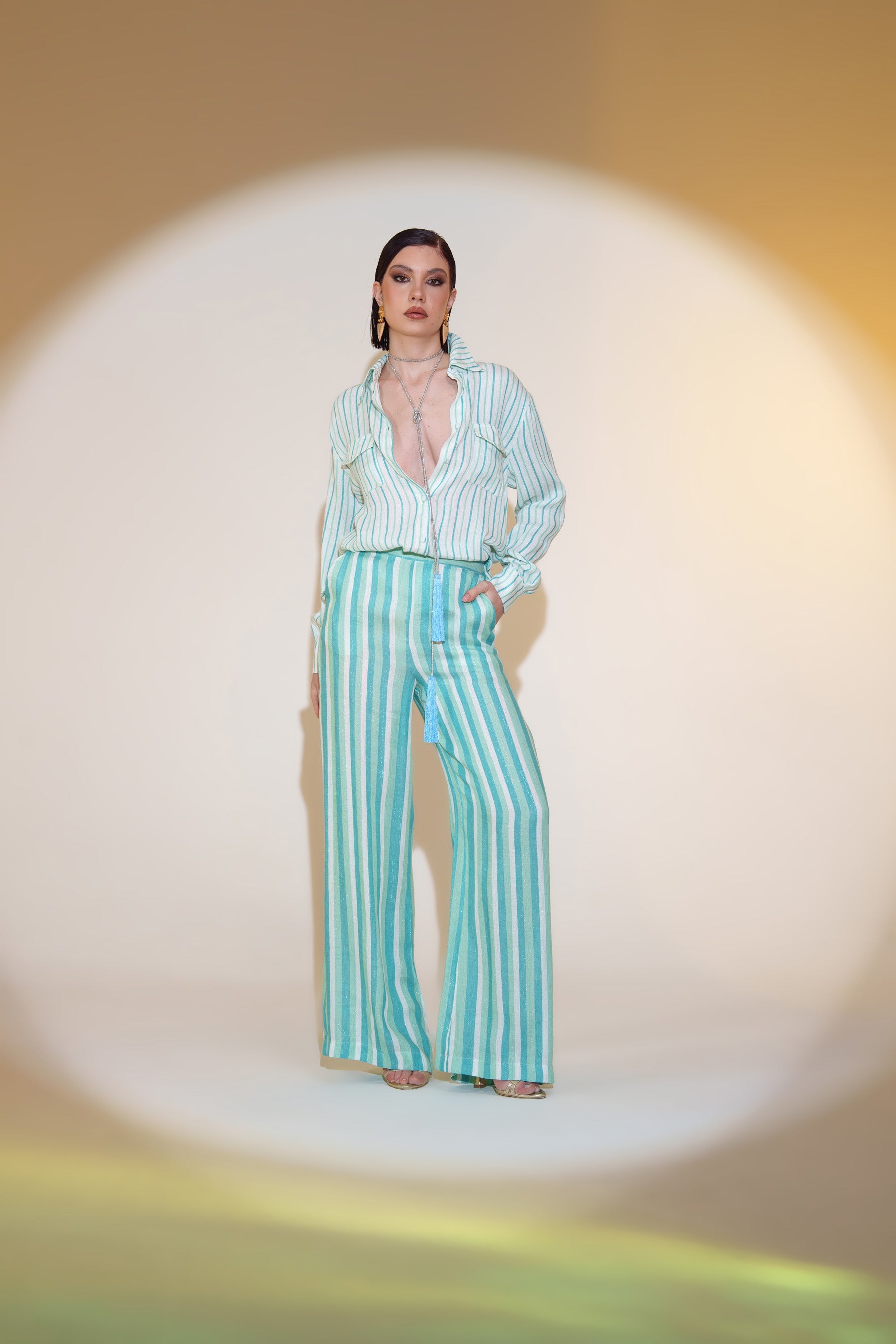 Designed in breezy linen with bold vertical stripes in aqua, mint, and ivory, these high-rise trousers feature a wide-leg silhouette that elongates the frame while offering comfort and ease. Lightweight and statement-making, they’re perfect for pairing with the matching striped blouse or a fitted white crop for a fresh, summer-ready look.