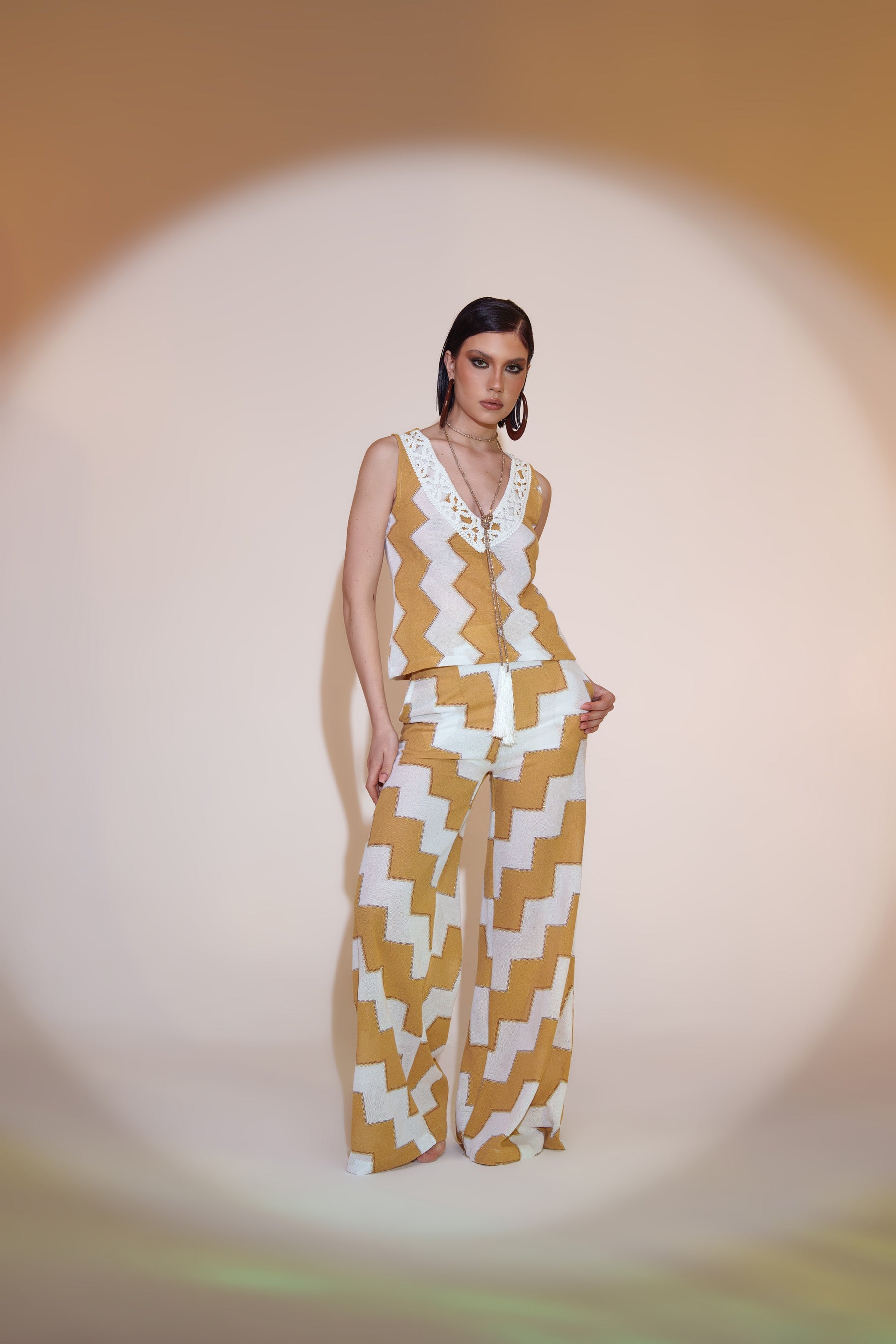 Playful yet polished, the Biscuit Top brings retro glam into the now. Featuring a bold white and golden chevron pattern, this sleeveless top is accented with intricate lace detailing at the neckline—perfect for warm days, barefoot evenings, and sun-drenched escapes.