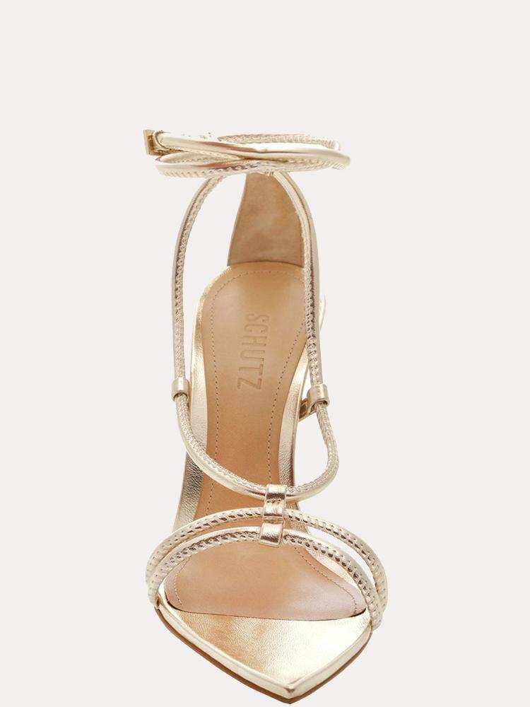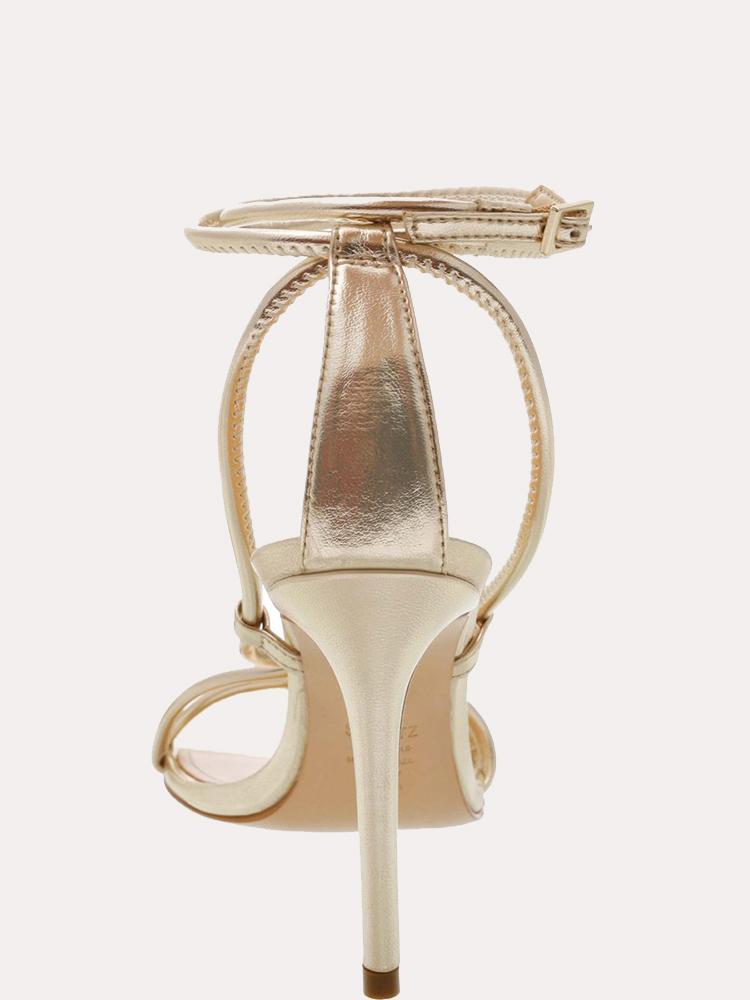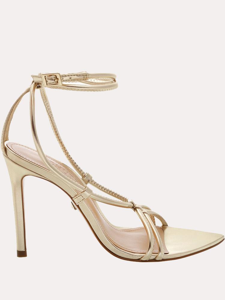A delicate, strappy high-heeled sandal in gold metallic leather.