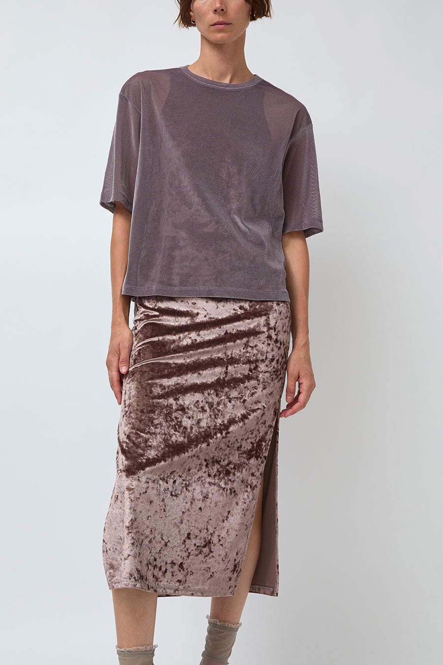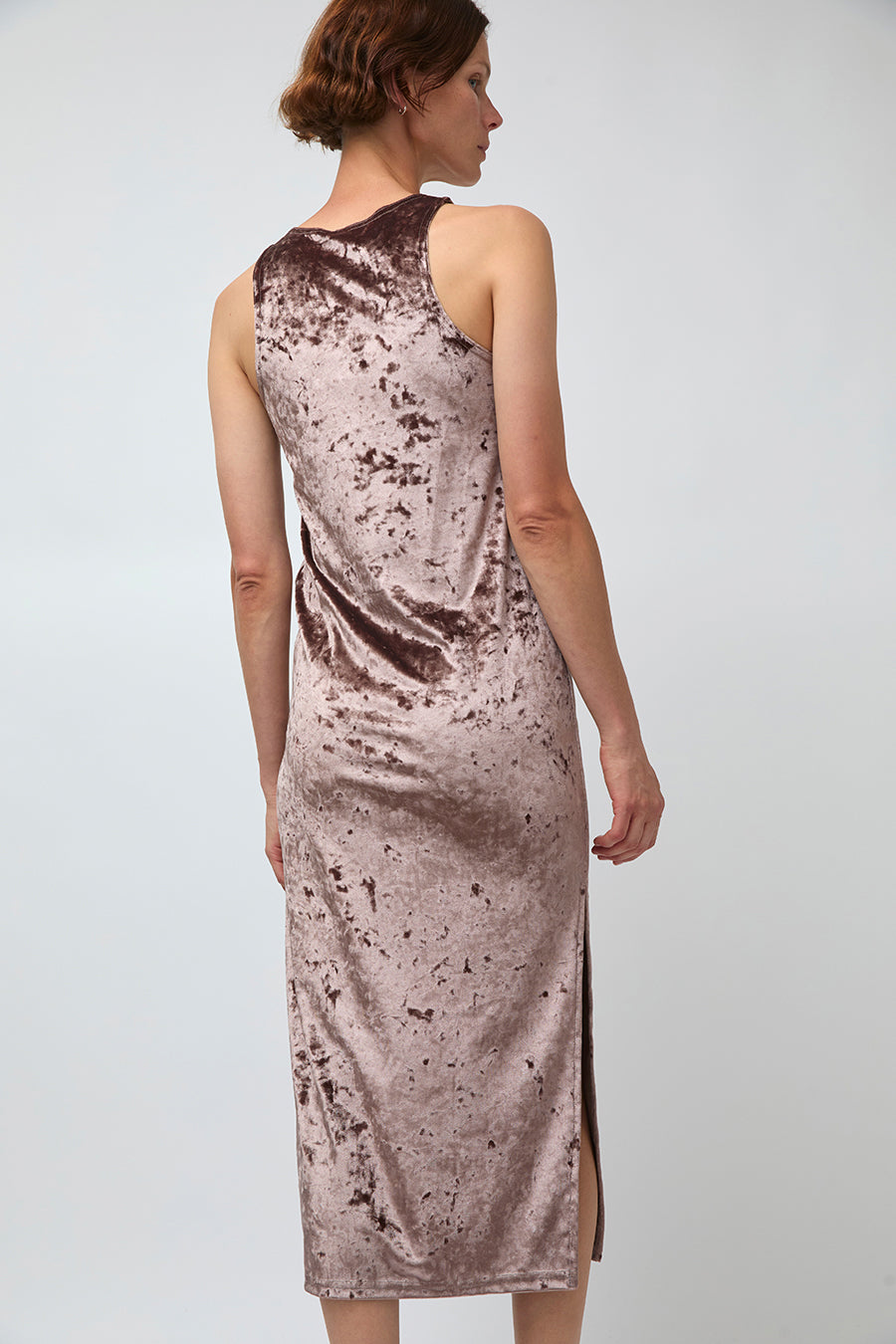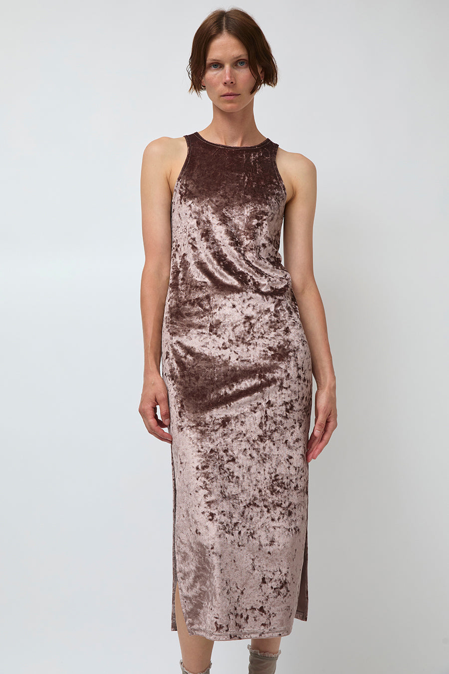 Slim-fitting velvet tank dress with crew neckline. Hits below the knee with dramatic side slit.