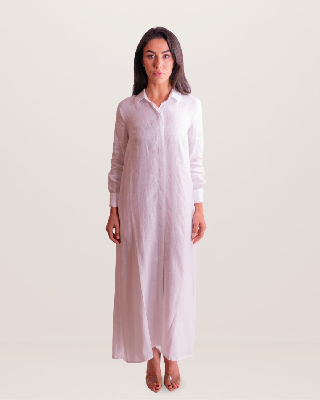 This long shirt dress, made with 100% Italian linen, offers a loose and breathable fit. Perfect for warm weather, it provides comfort and style. Expertly crafted for a luxurious, yet casual look.